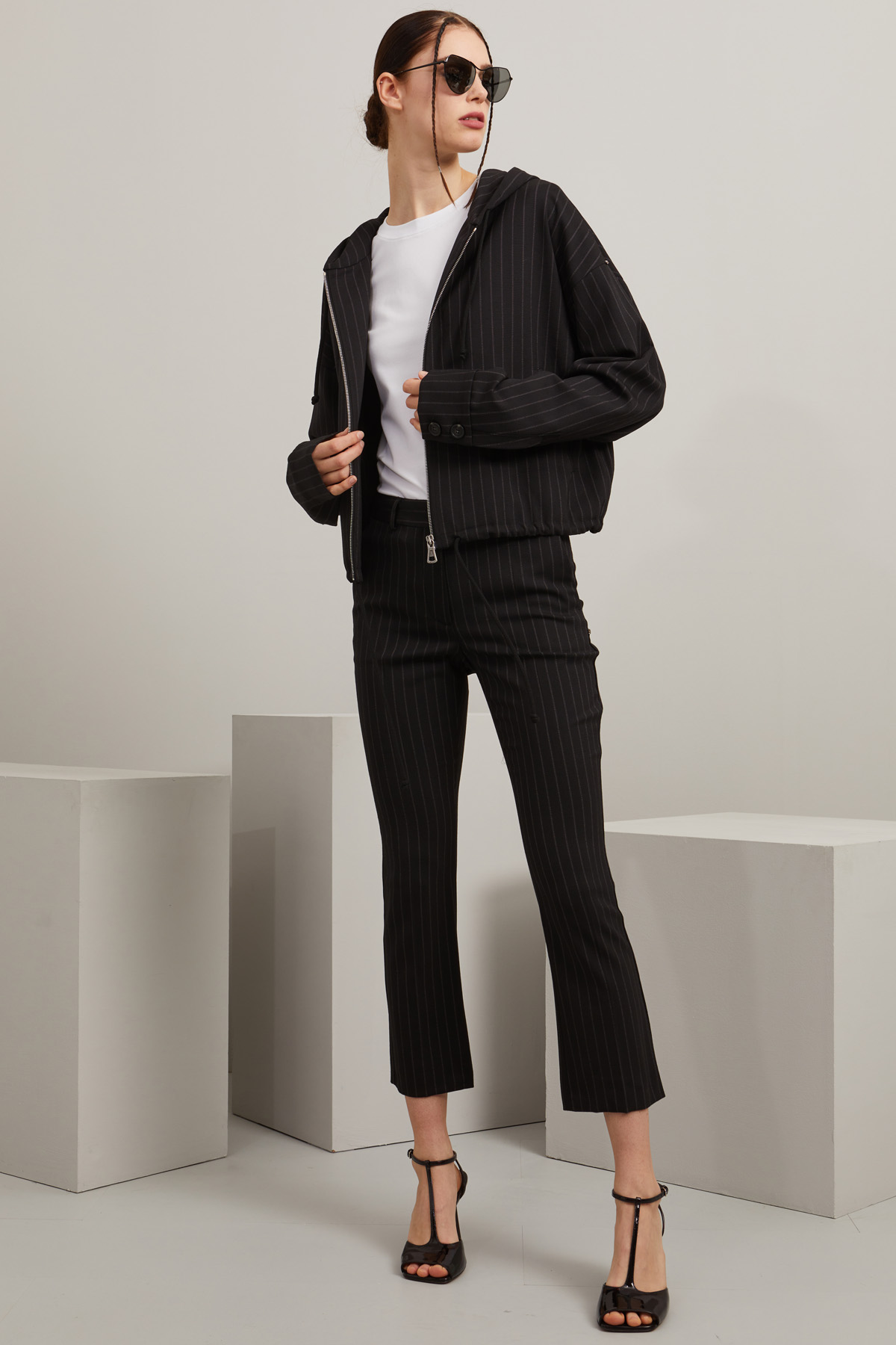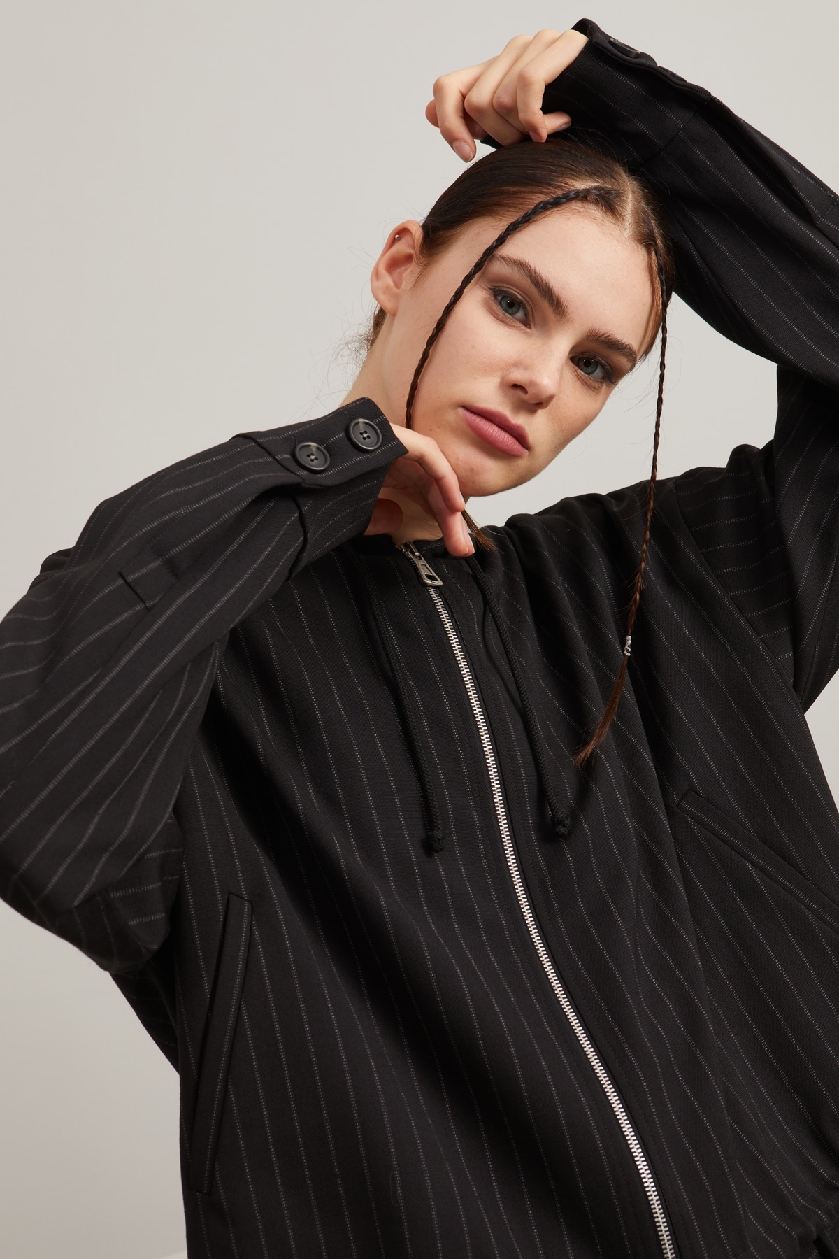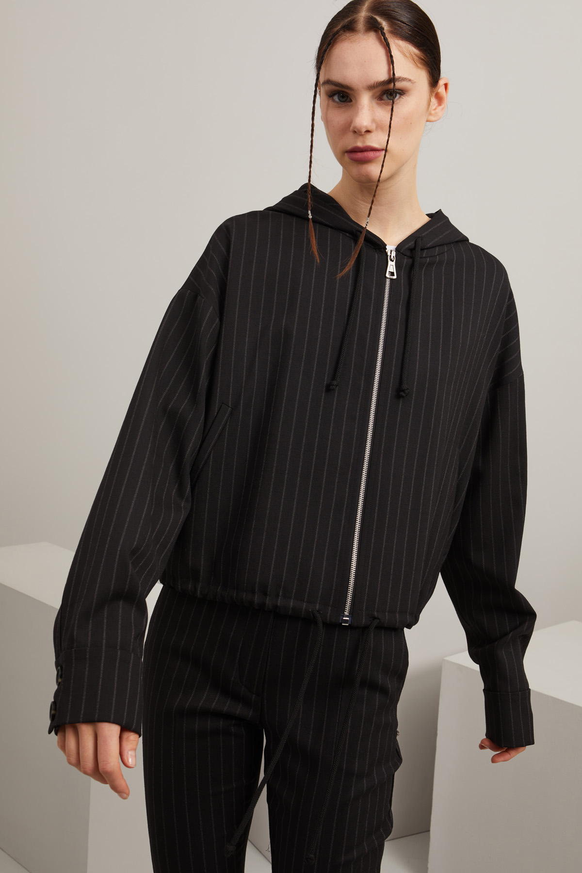 Felpa dalla linea boxy realizzata in tela di lana stretch tinto filo, con cappuccio, coulisse al collo e a fondo capo, maniche lunghe dal giro sceso con polsino e bottoni, tasche oblique a filetto e allacciatura monopetto tramite zip. Foderata.
