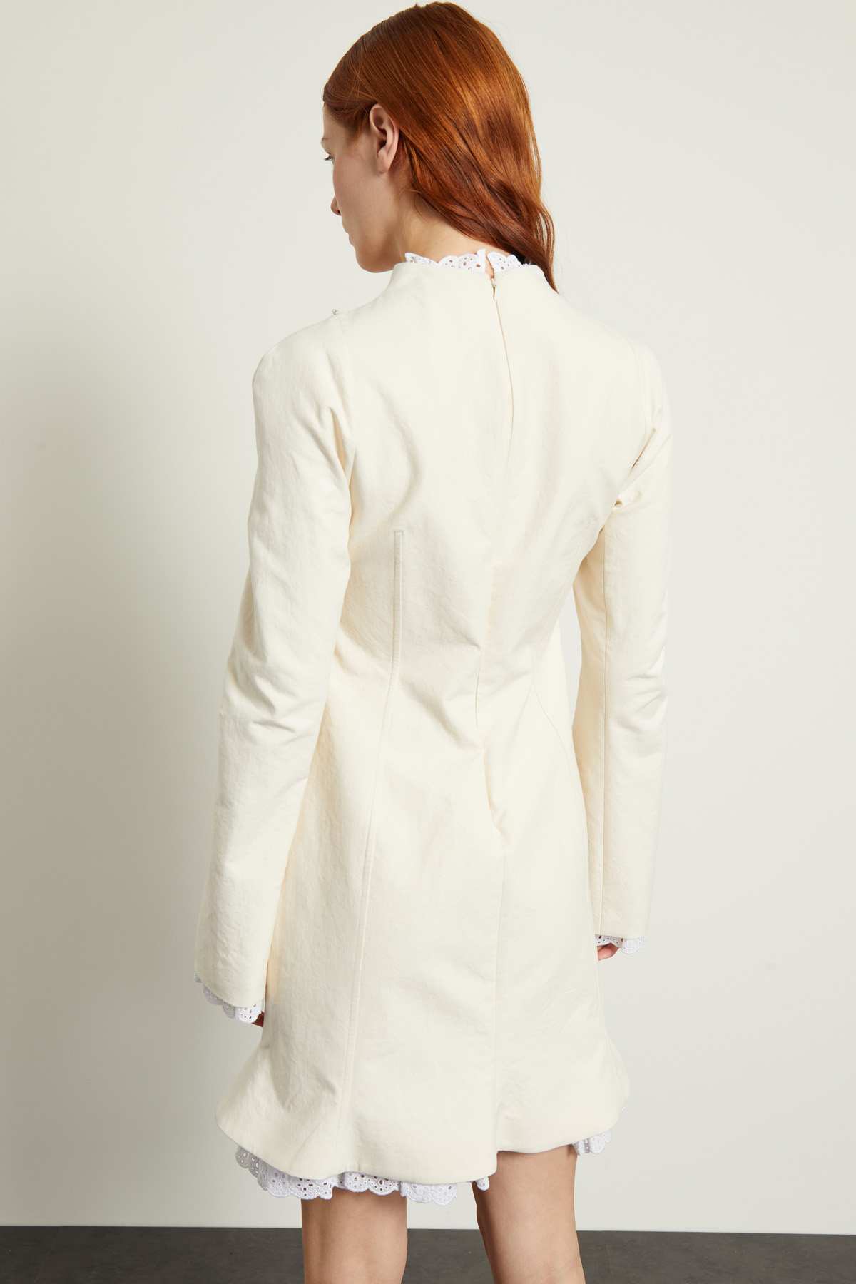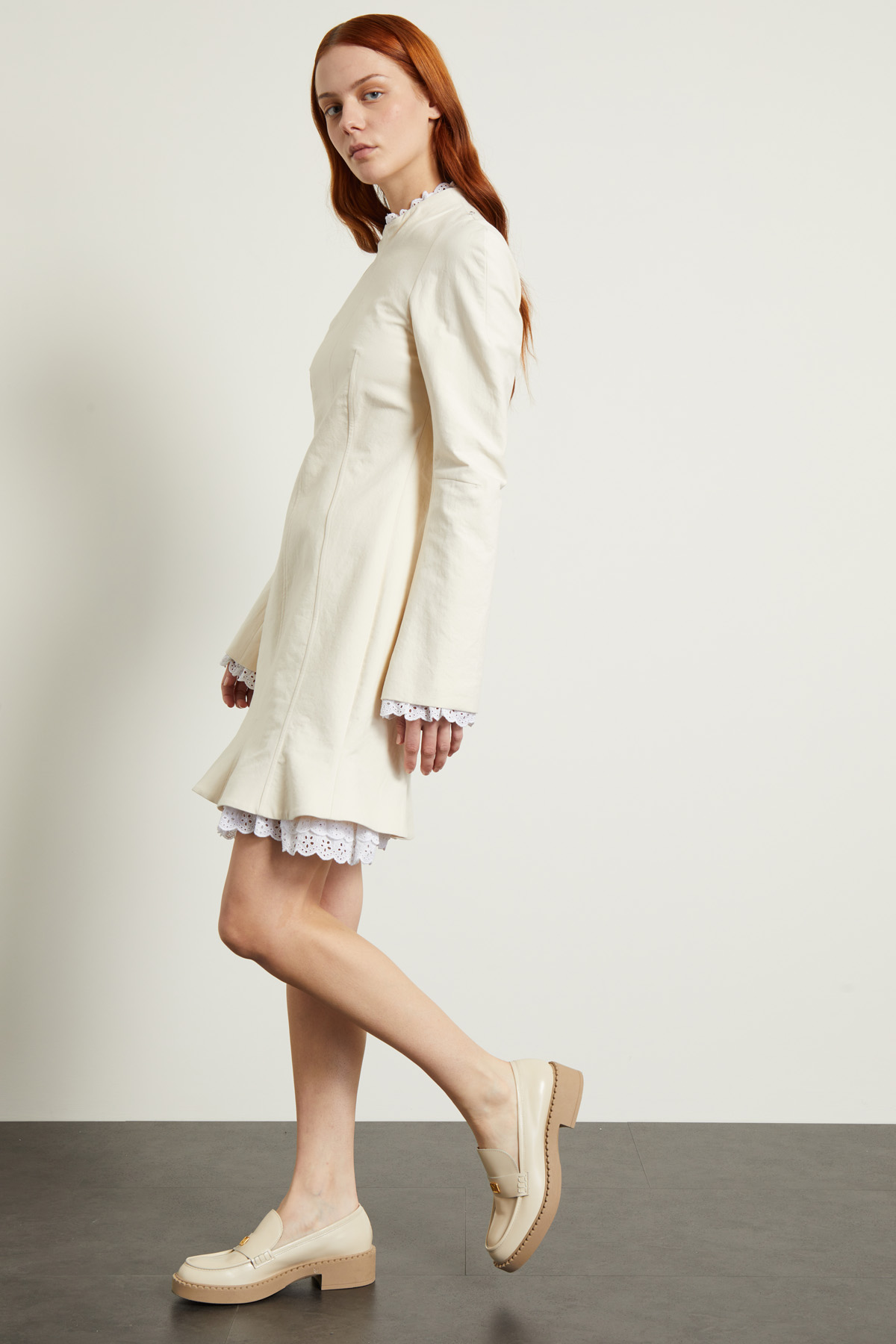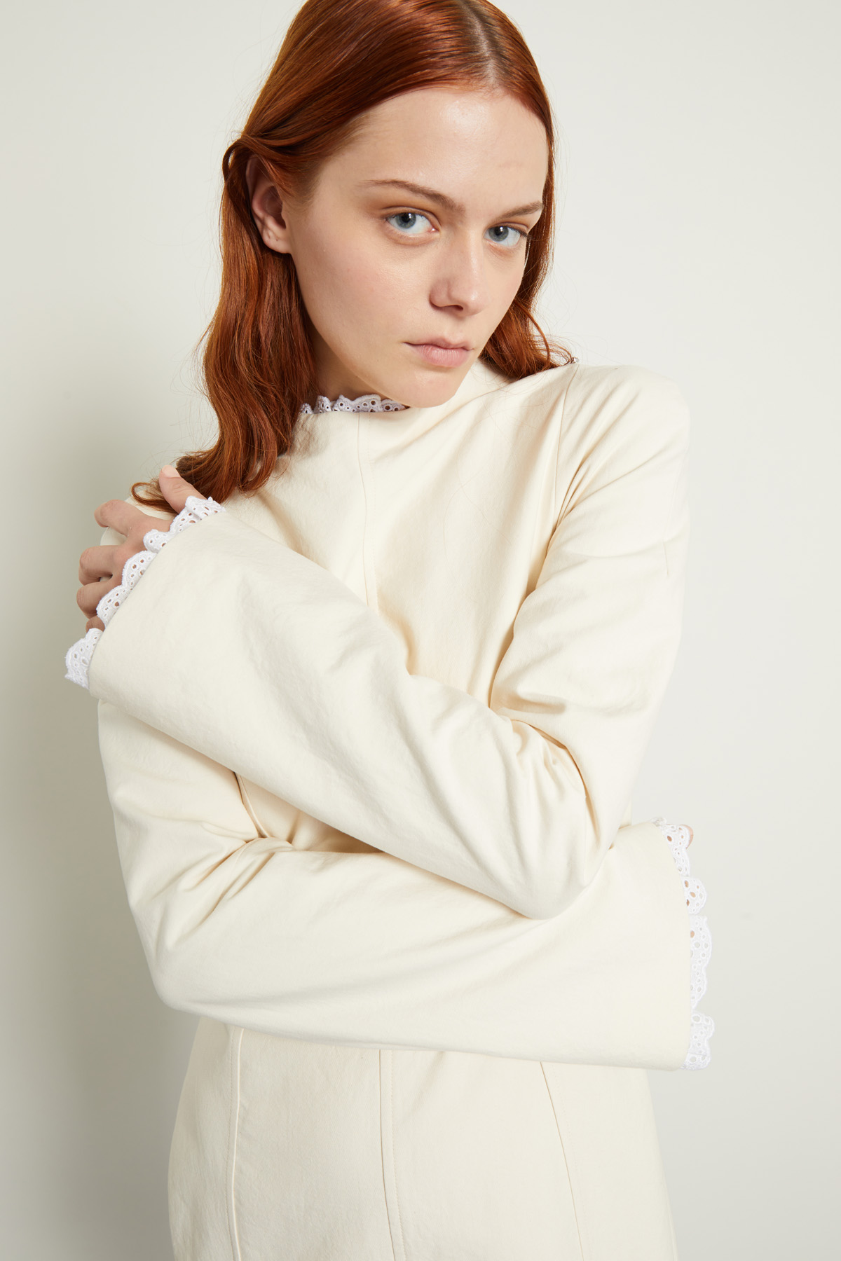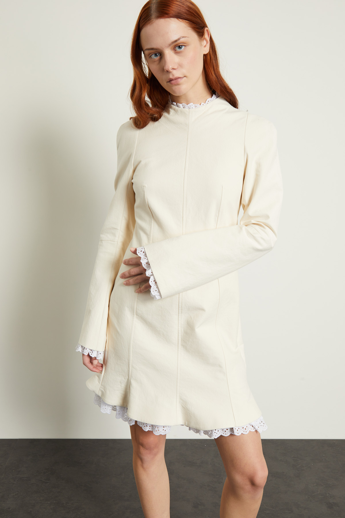 Abito corto dalla linea dritta realizzato in doppia tela di puro cotone, con dettagli in pizzo sangallo, collo a cratere, maniche lunghe svasate e profili rifiniti a cappetta. Allacciatura tramite zip invisibile nel retro. Foderato.