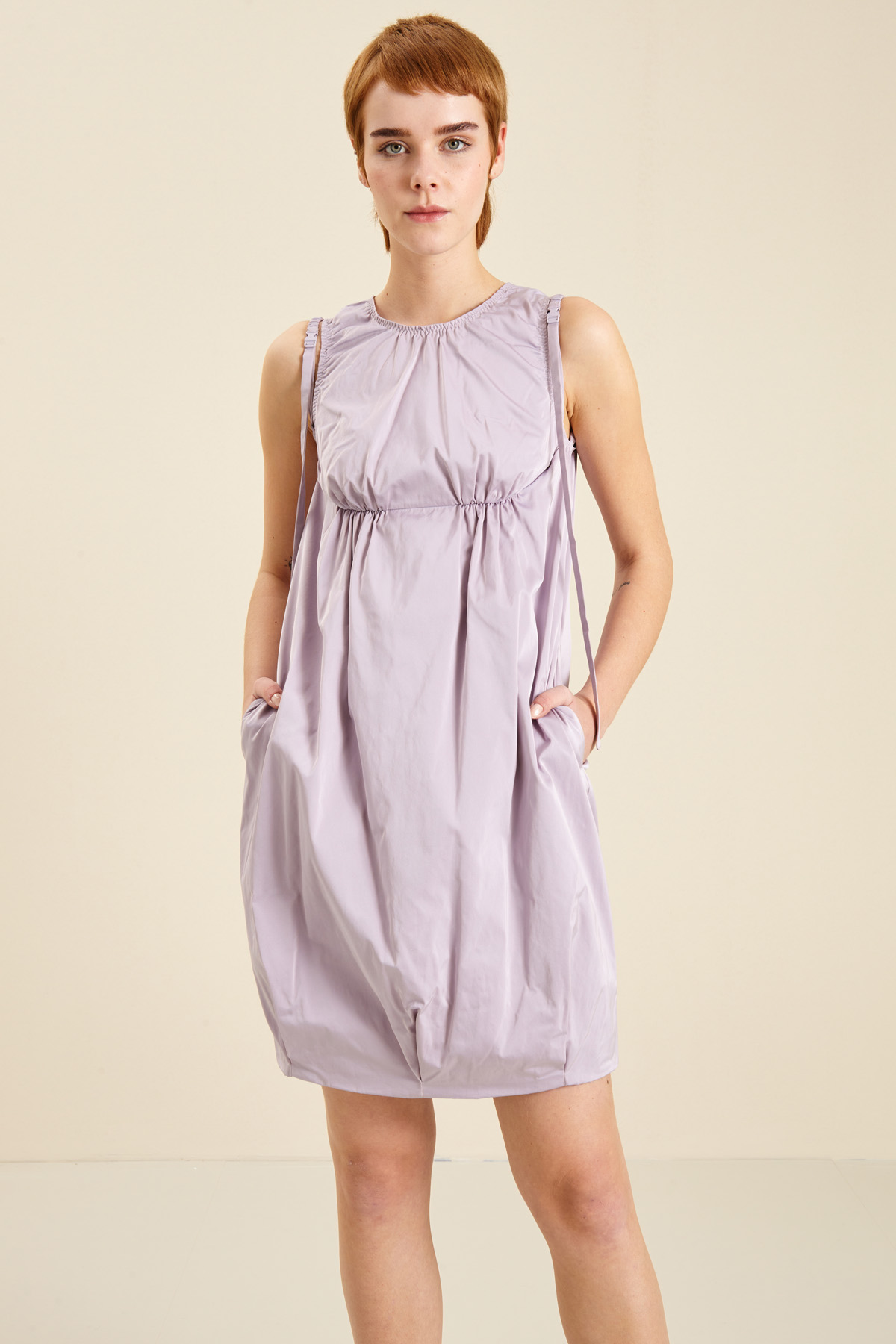 Abito smanicato a palloncino realizzato in raso tecnico, con scollo rotondo, spalline spesse con dettaglio in nastro elastico e mini clip, dettaglio di arricciatura sul corpino e tasche laterali inserite in cucitura. Apertura a V nel retro e nastro elastico con cinghia. Foderato.