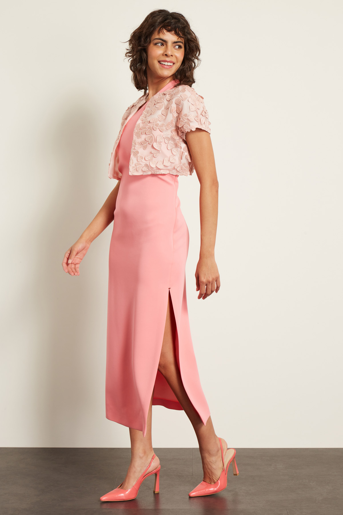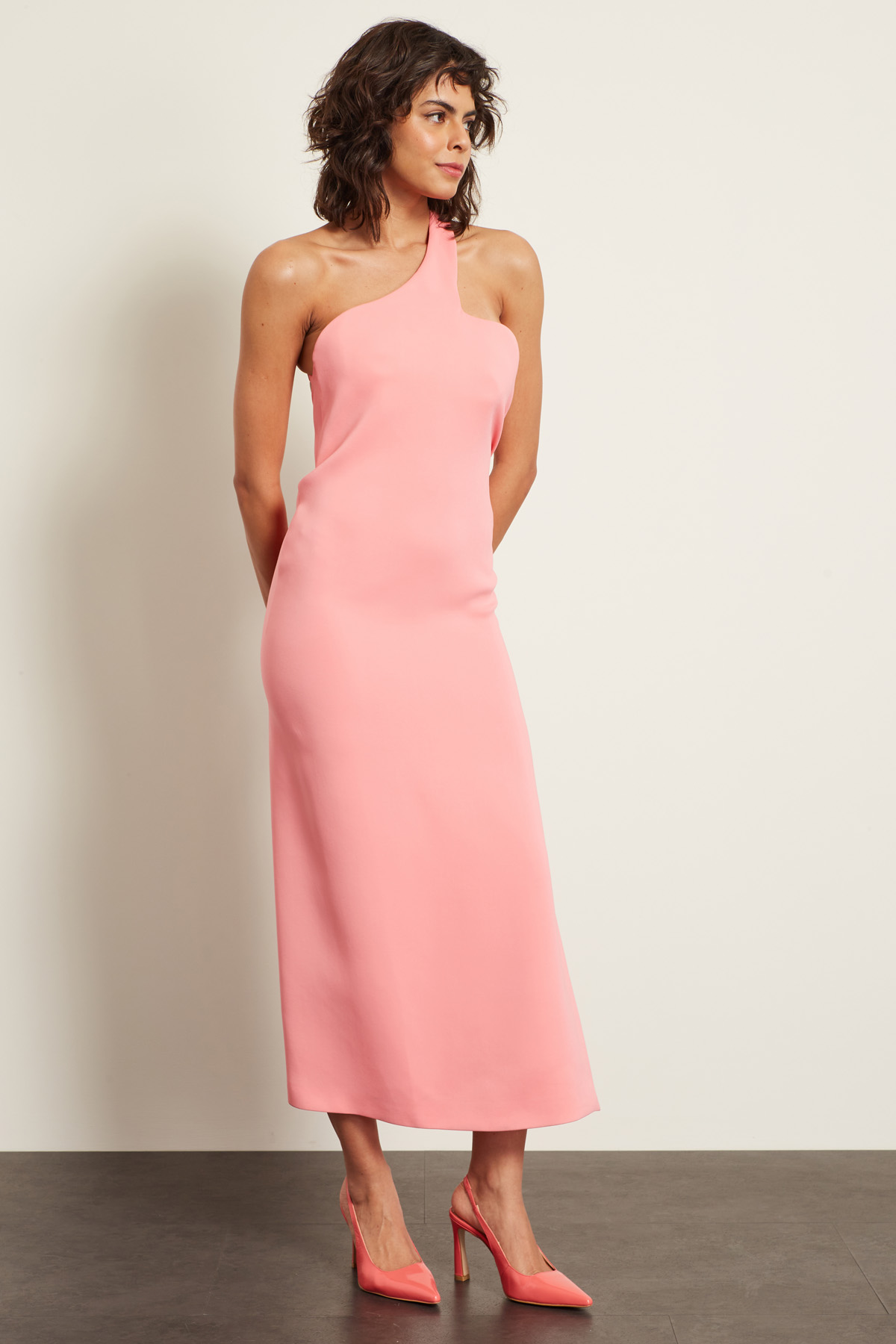 Abito longuette dalla linea dritta realizzato in viscosa stretch, con scollo monospalla asimmetrico e spacco laterale. Il fit è aderente, con parte più morbida all'altezza della vita. Chisura tramite lampo invisibile sul fianco.