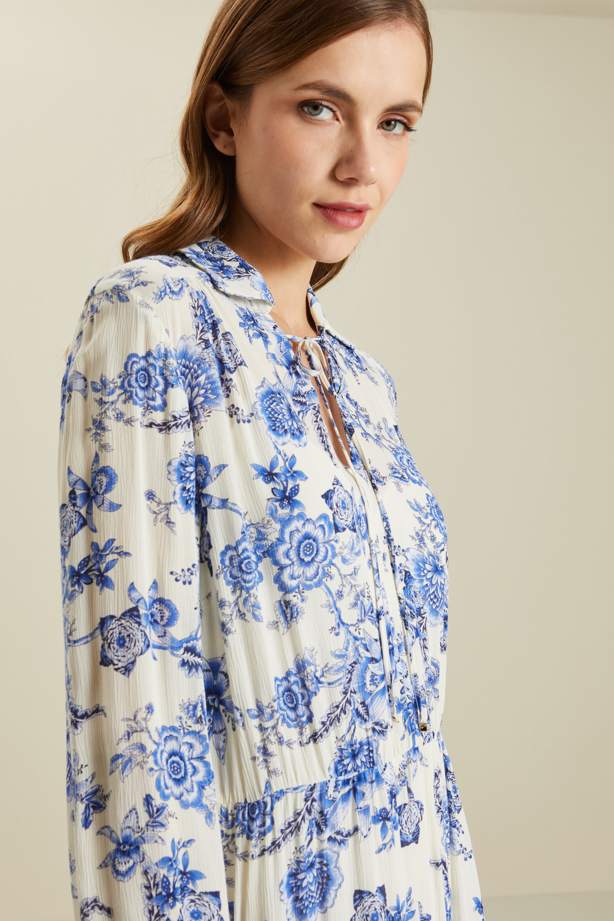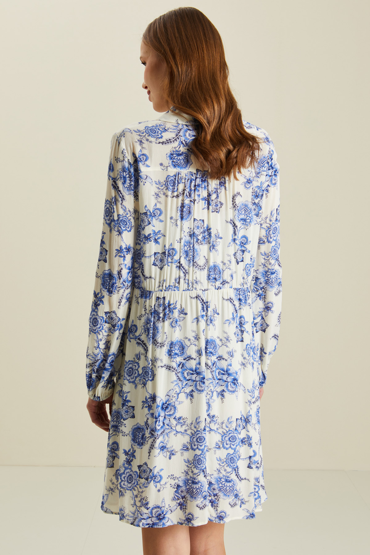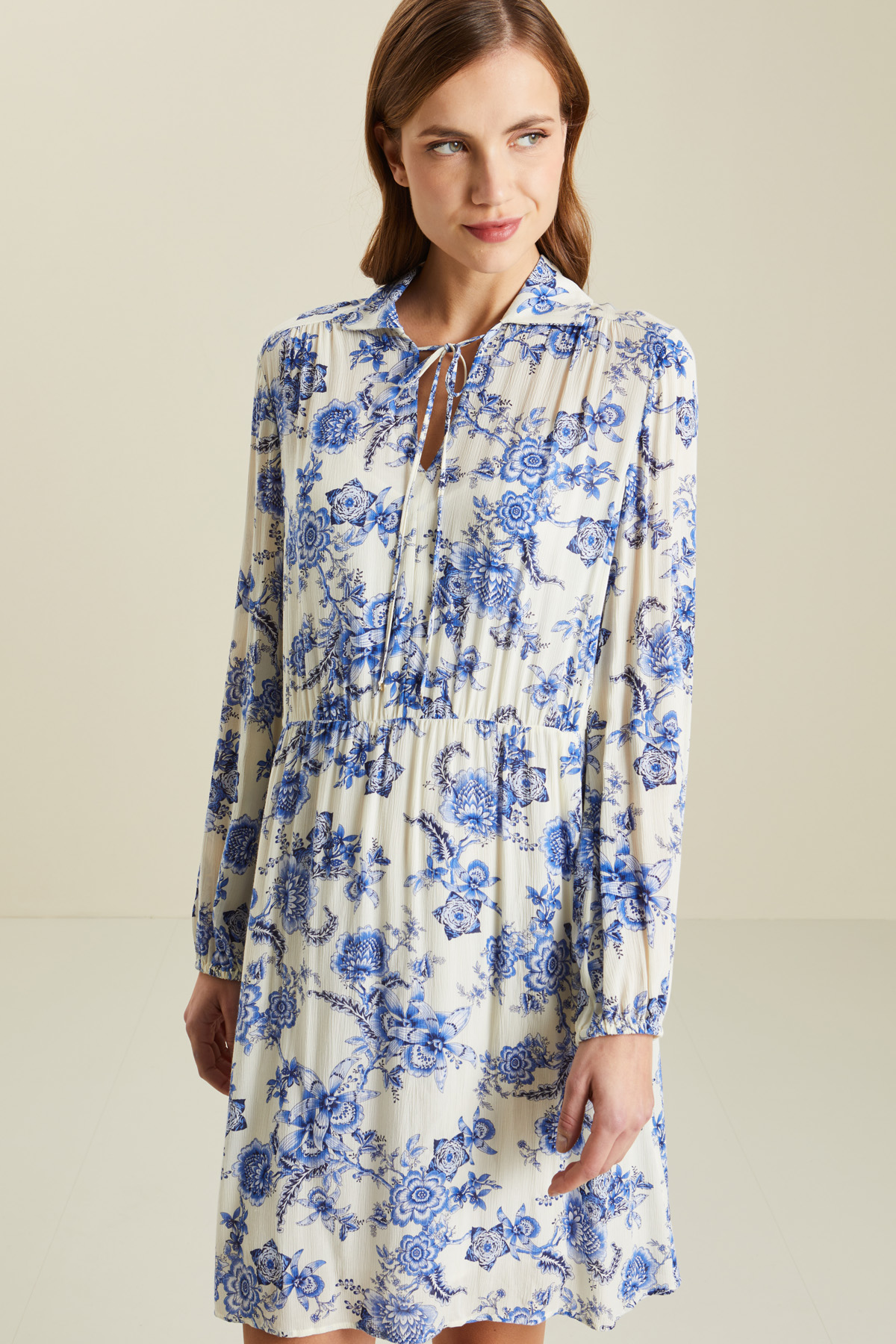 Abito corto dalla linea svasata realizzato in creponne di pura viscosa stampata, colletto a camicia con laccetti da annodare sul davanti e apertura a V, maniche lunghe con inserto elastico al fondo e tasche laterali inserite in cucitura. Capo dotato di sottoveste in abbinamento.