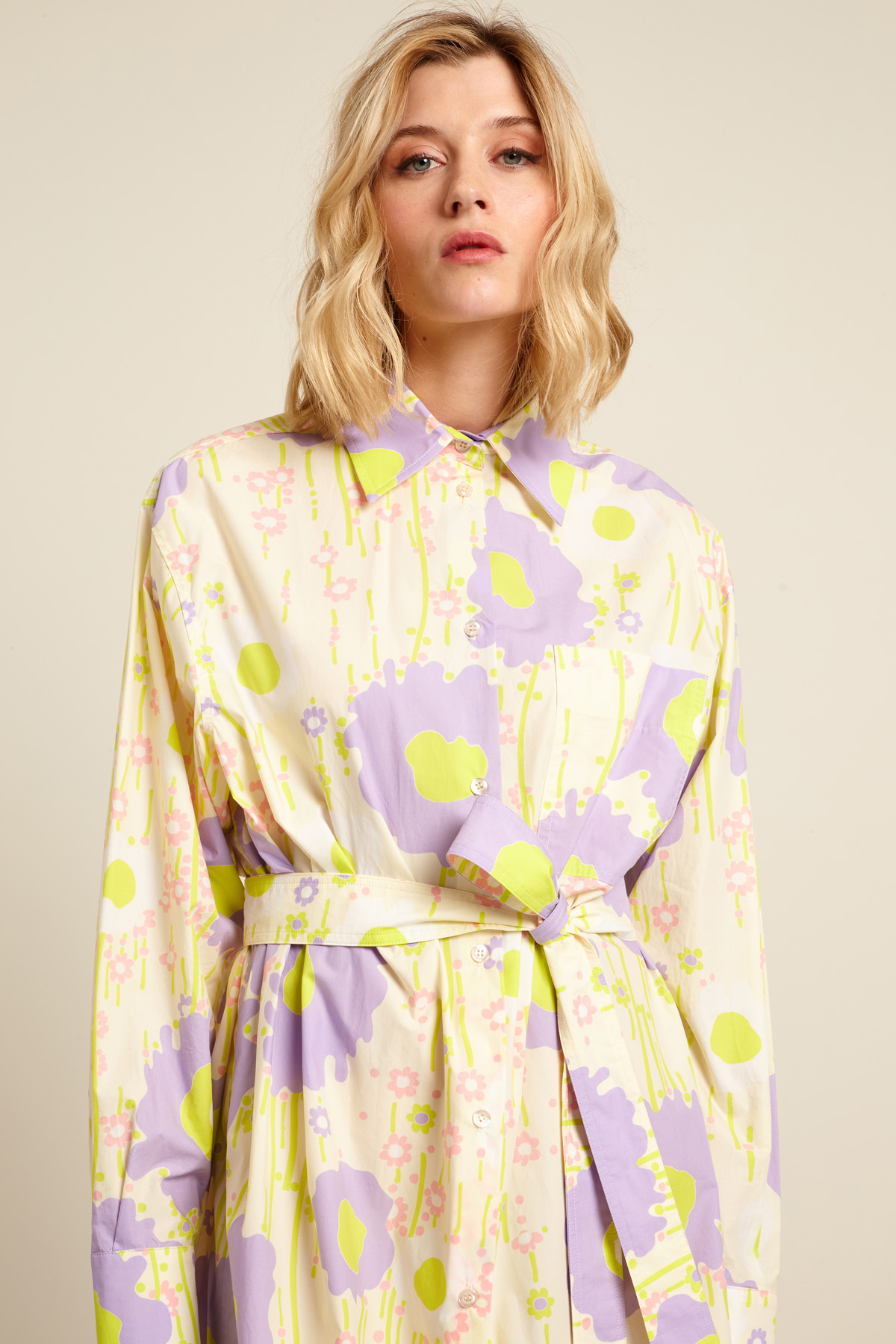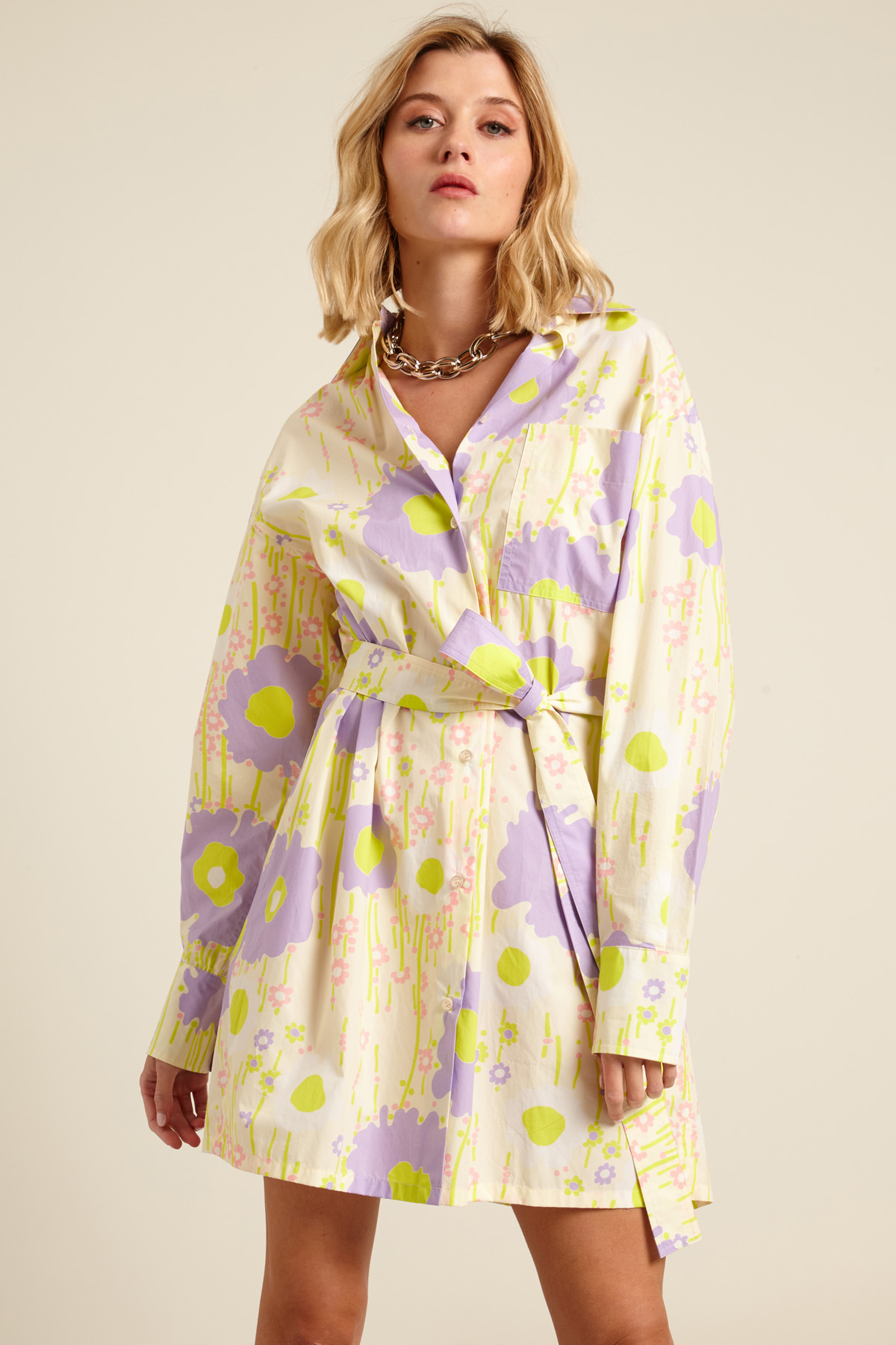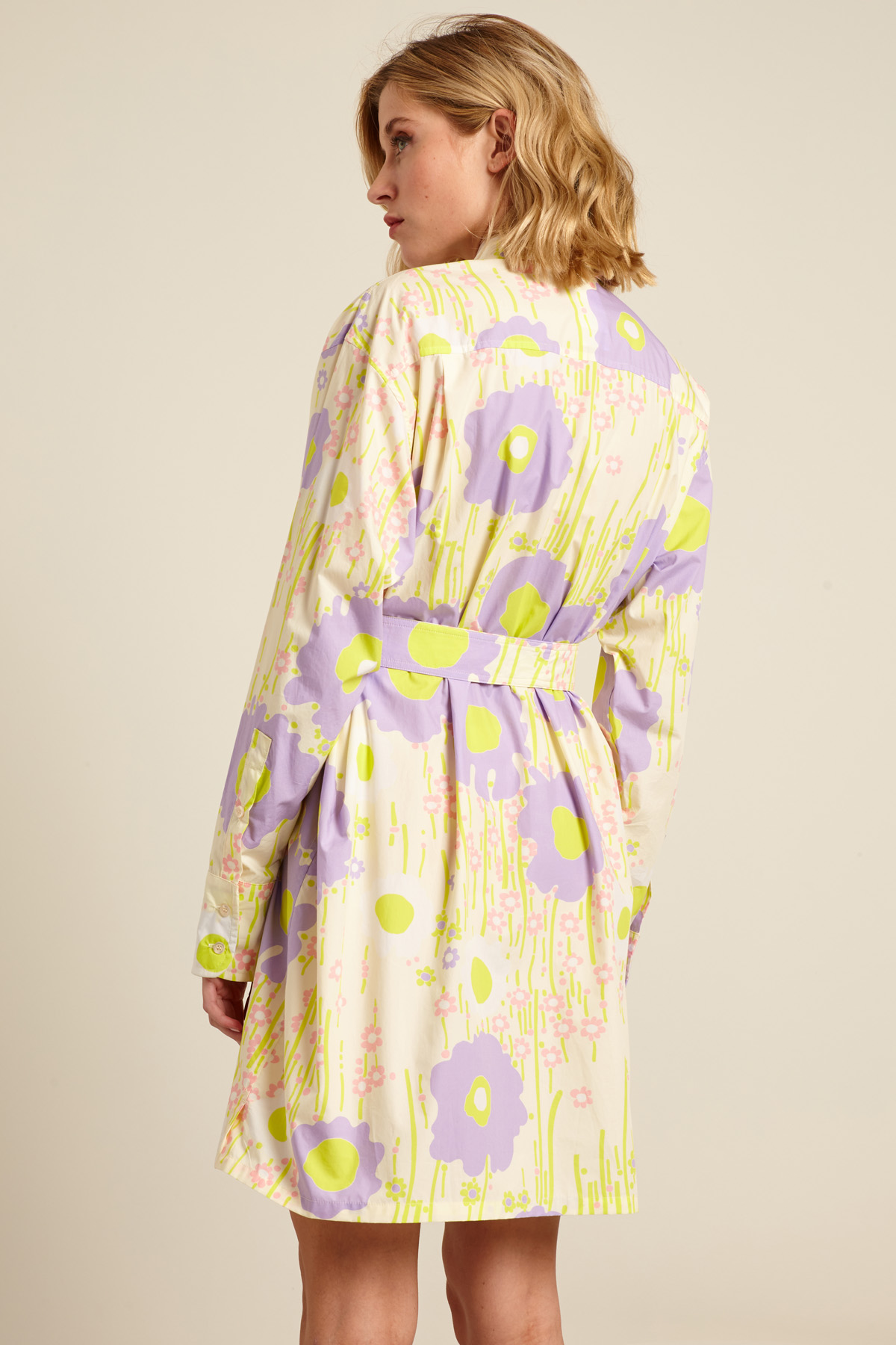 Chemisier corto dalla linea dritta realizzato in popeline di puro cotone stampato, con colletto classico, maniche lunghe con polsino e bottoni, taschino applicato al petto e carrè nel retro. Allacciatura tramite bottoni a vista e cintura.