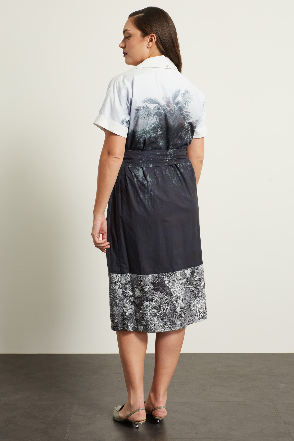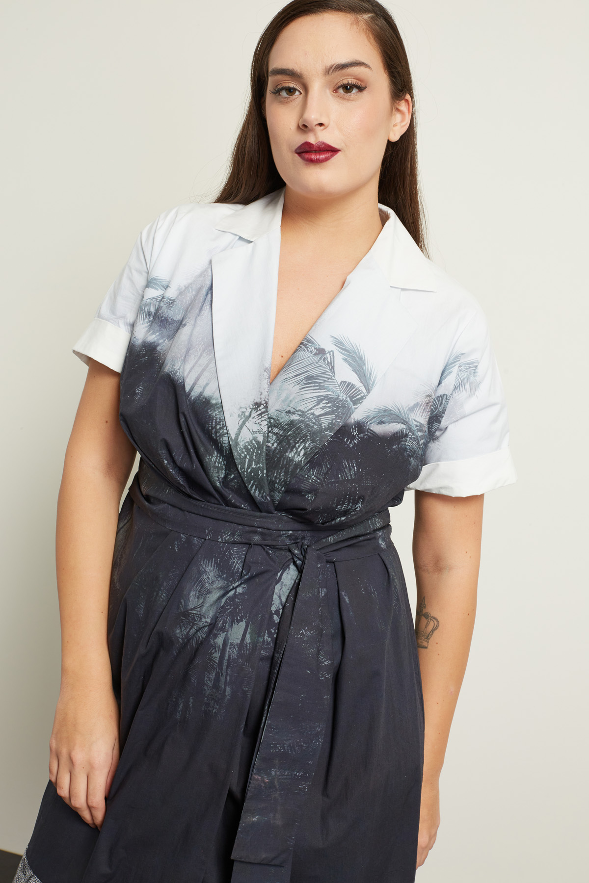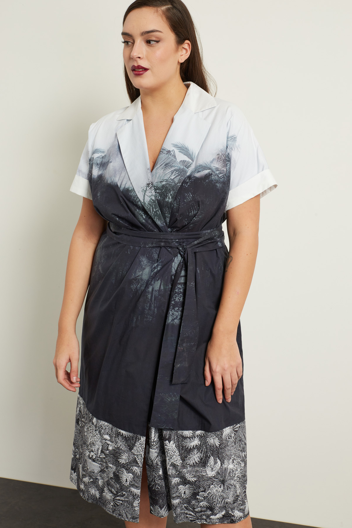 Abito a portafoglio realizzato in popeline di puro cotone stampato, con collo rever, maniche corte a kimono con risvolto, dettaglio di drappeggio sul davanti, taglio in vita. Allacciatura tramite nastri da annodare in vita. Foderato.