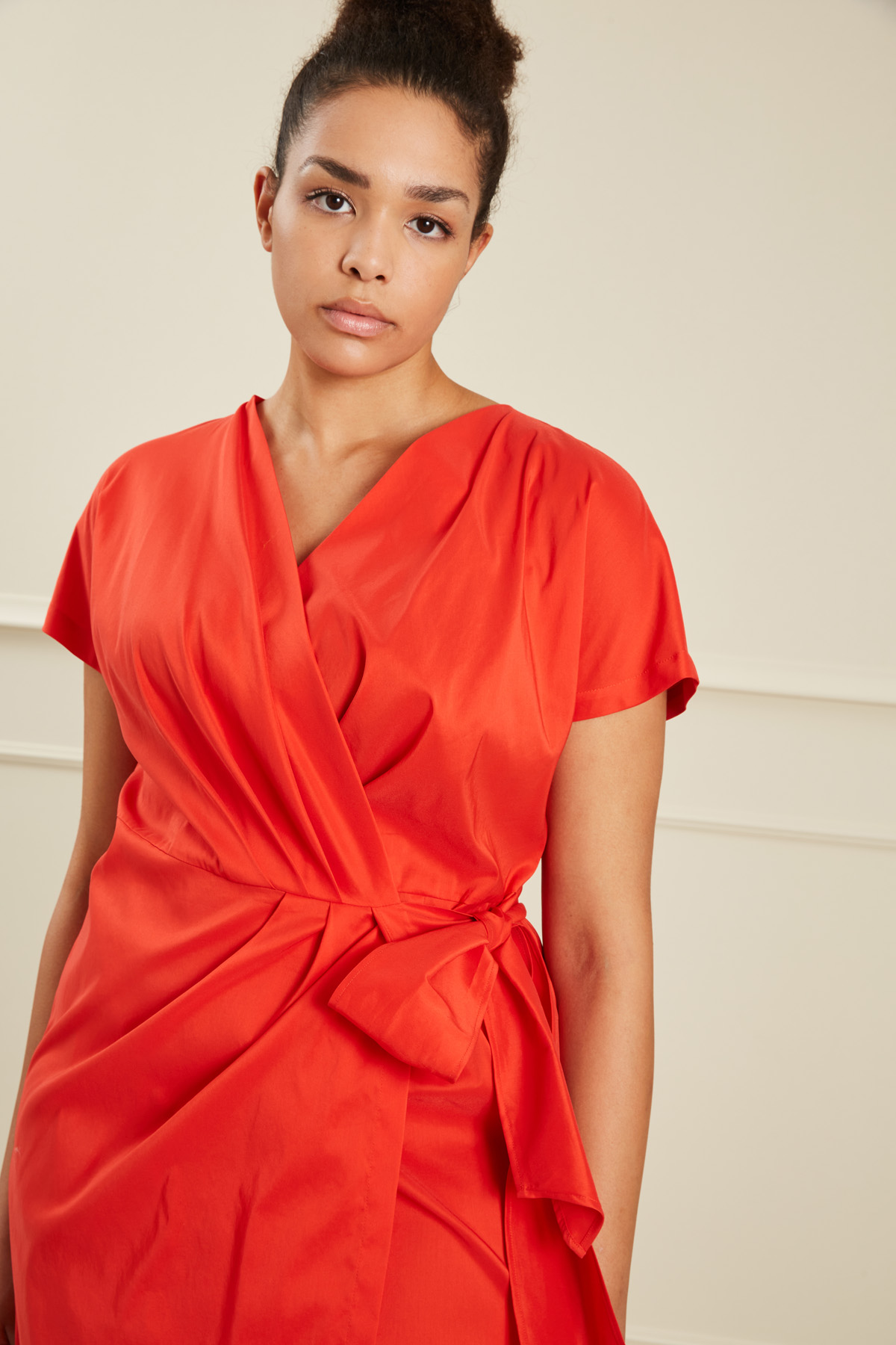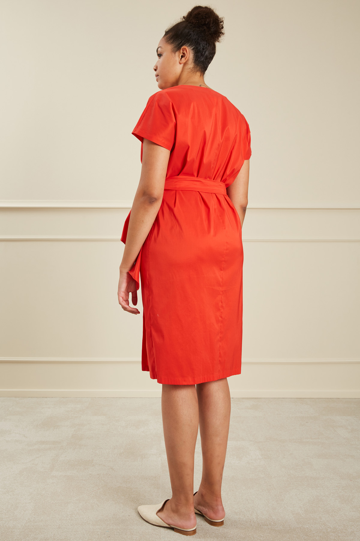Abito a portafoglio dalla linea aderente realizzato in popeline di misto cotone, con scollo a V incrociato, maniche corte a kimono, motivo di pieghe cucite sul davanti e allacciatura tramite nastri da annodare sul fianco.