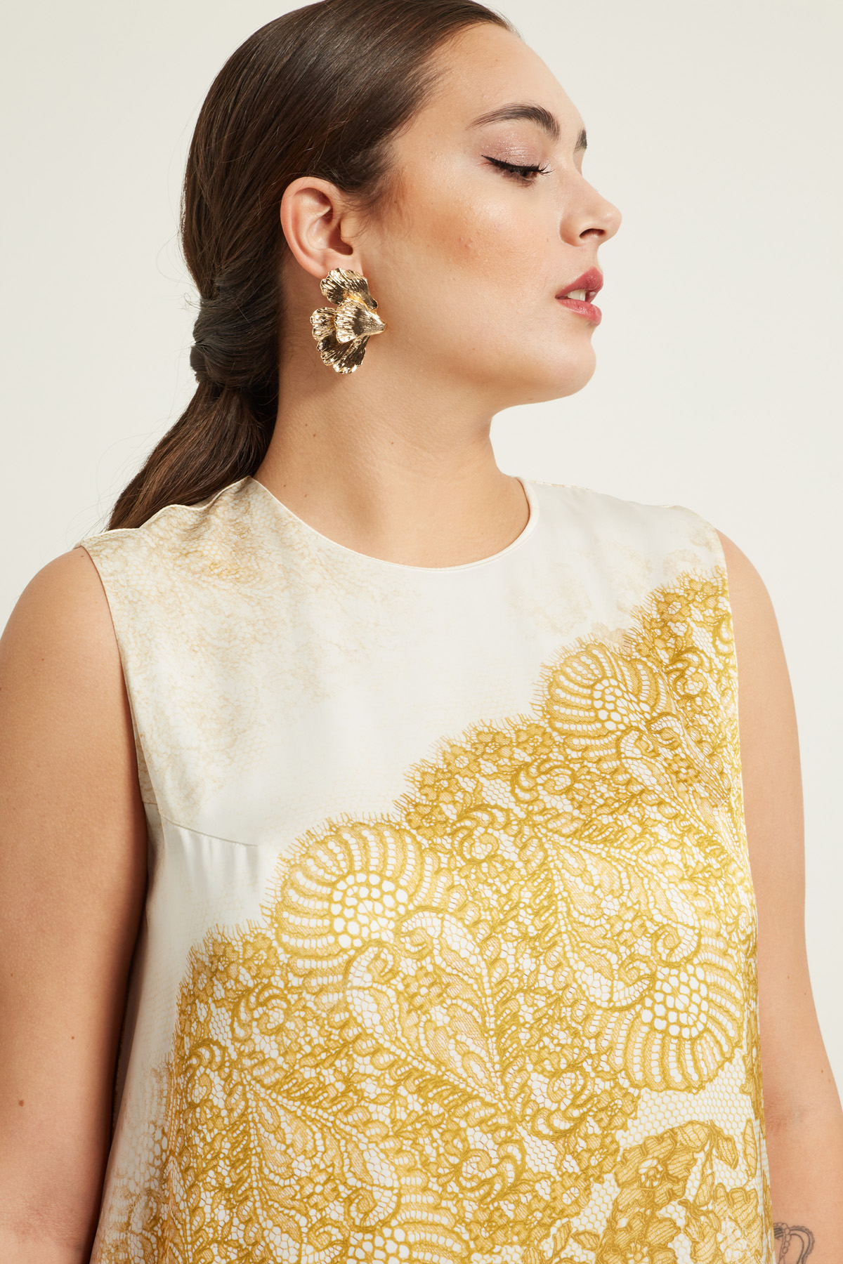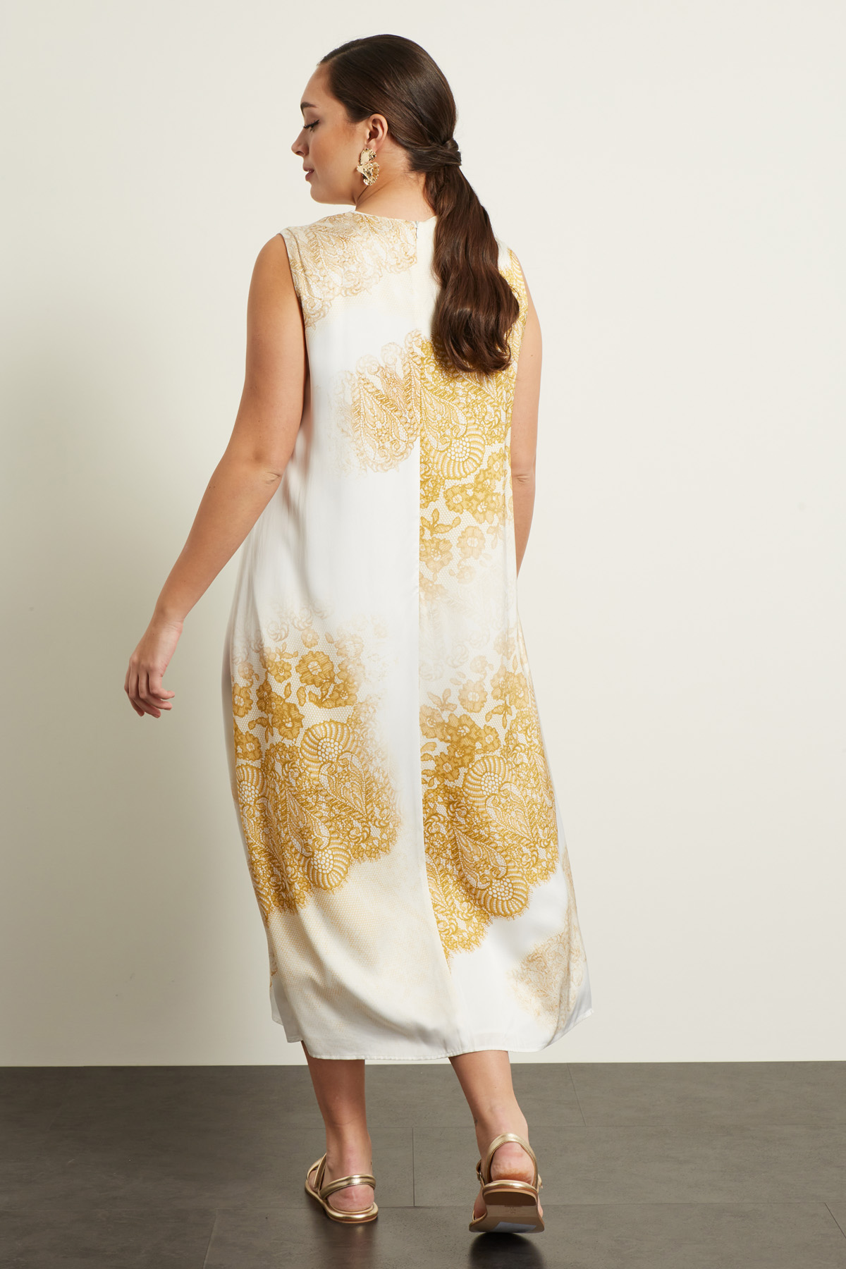 Abito smanicato dalla linea fluida realizzato in raso di viscosa stampato, con scollo a giro e allacciatura tramite zip invisibile nel retro. Foderato.