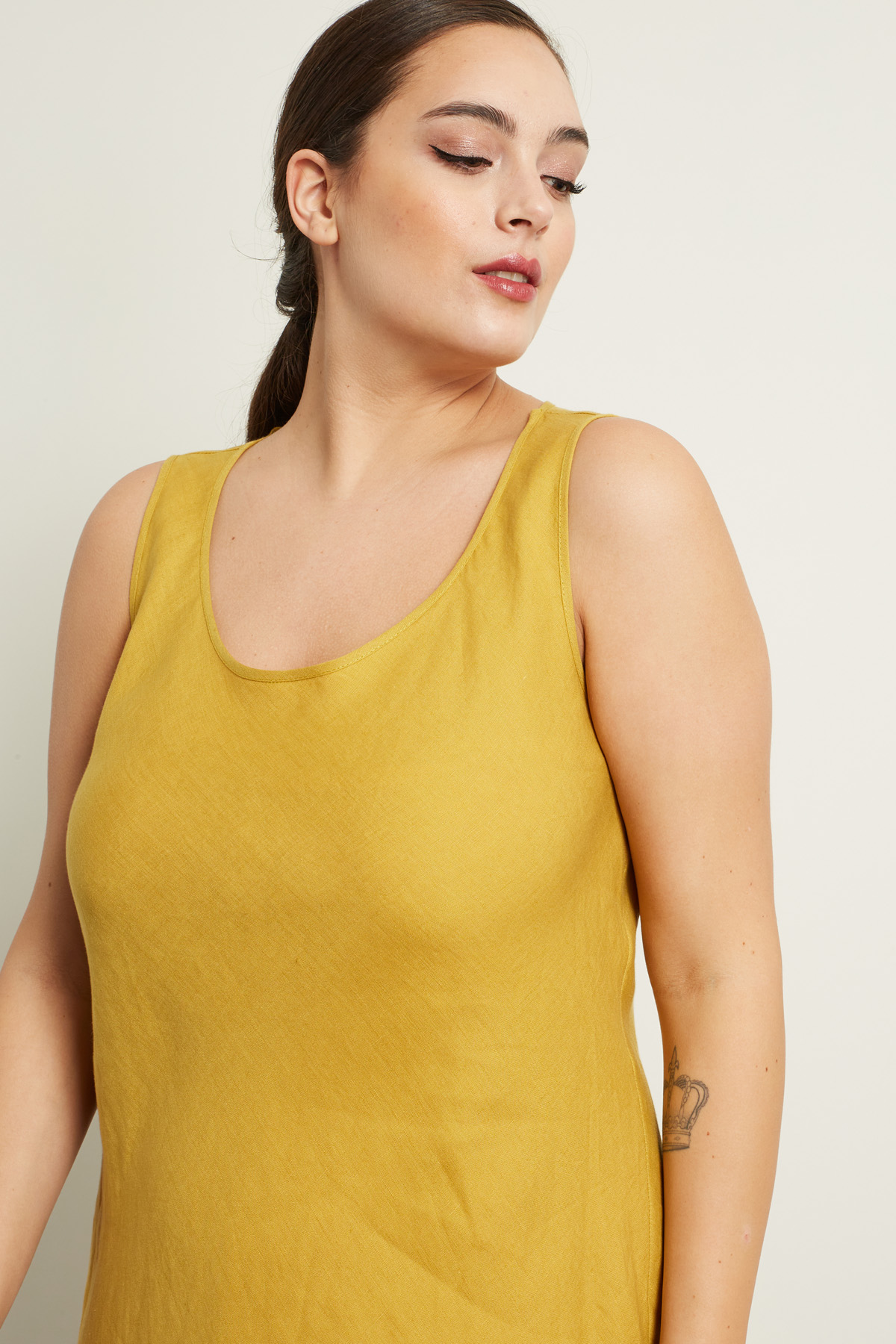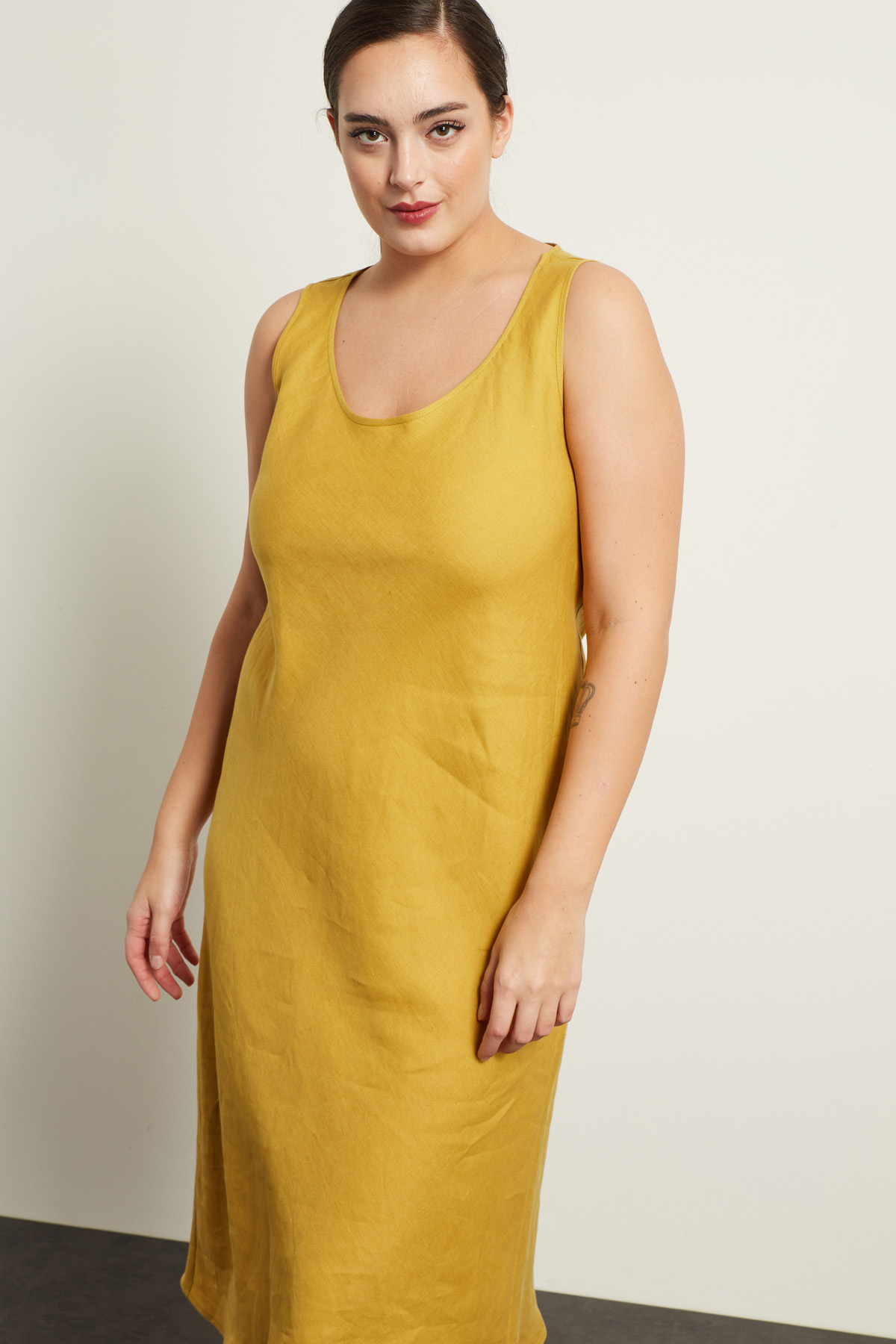 Abito smanicato dalla linea fluida realizzato in tela di lino, con scollo a U e spalline spesse. Foderato.