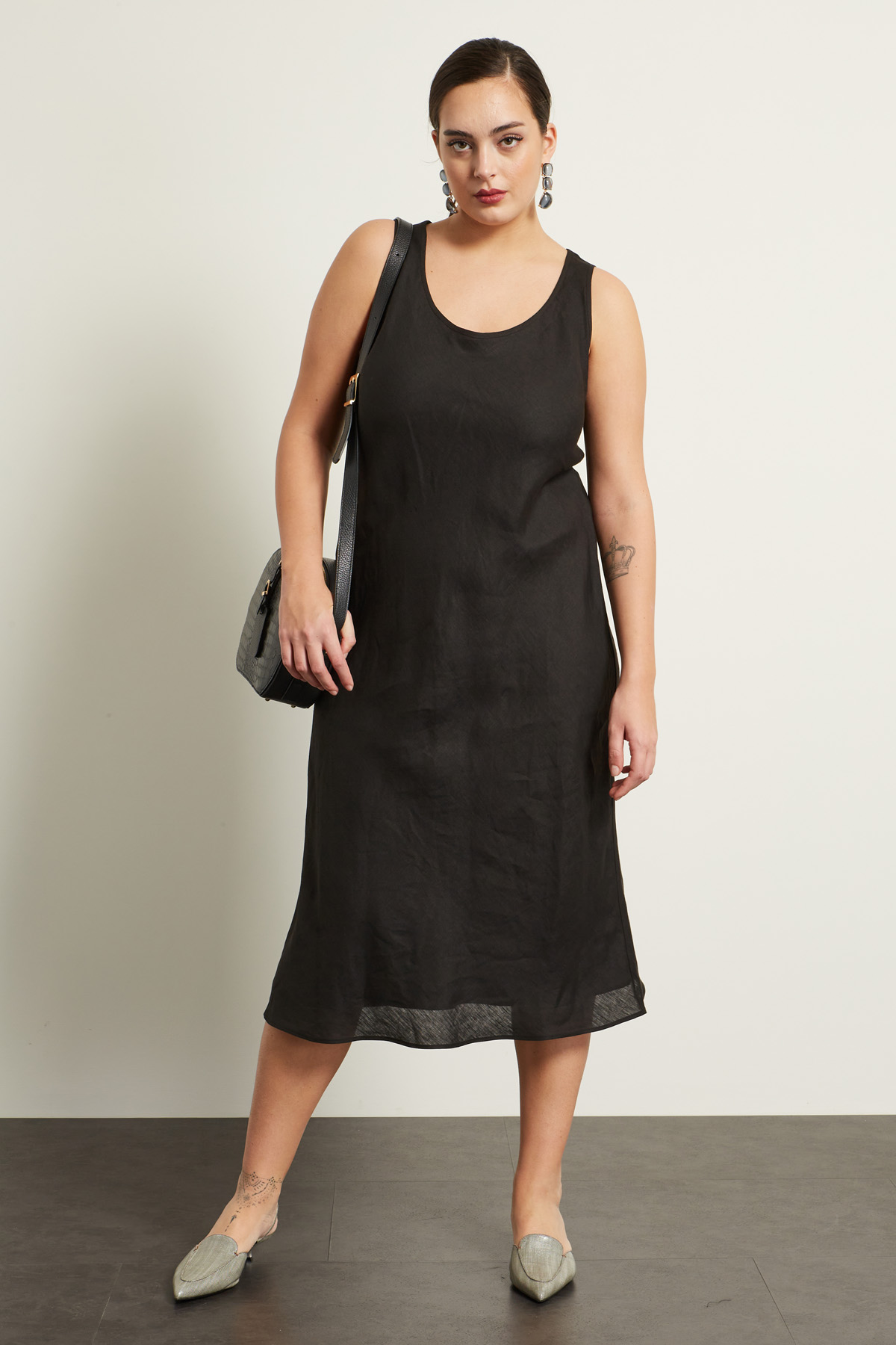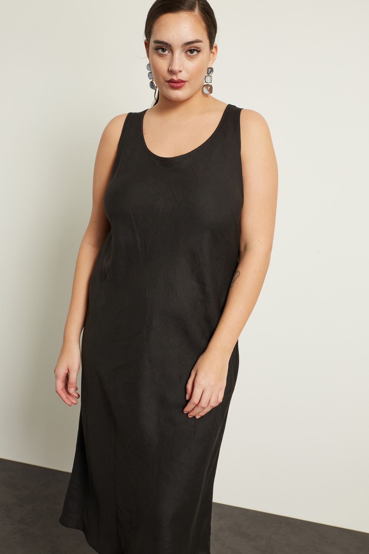 Abito smanicato dalla linea fluida realizzato in tela di lino, con scollo a U e spalline spesse. Foderato.