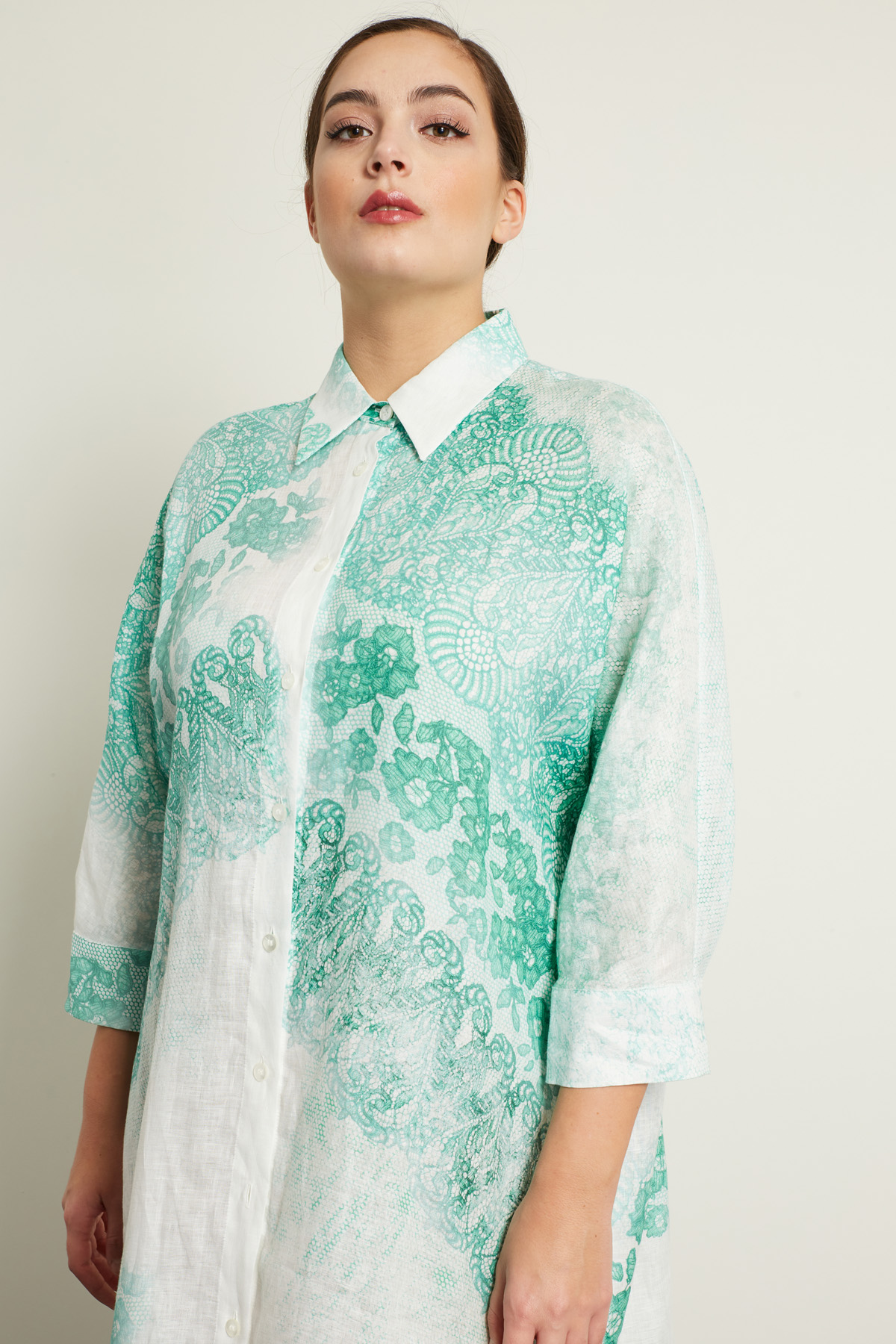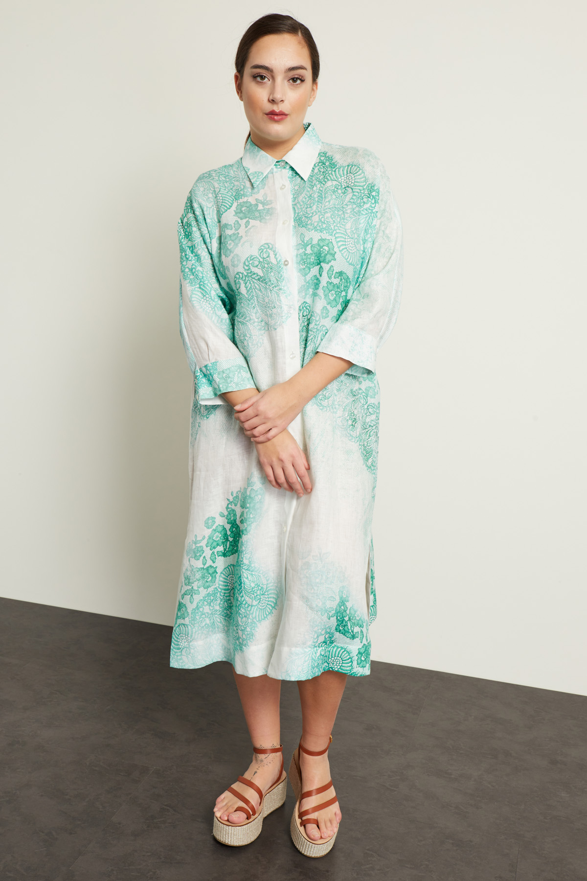 Chemisier dalla linea dritta realizzato in tela di pura lana, con colletto classico, maniche tre quarti a kimono con polsino e bottoni, spacchi laterali al fondo. Allacciatura tramite bottoni. Sfoderato.