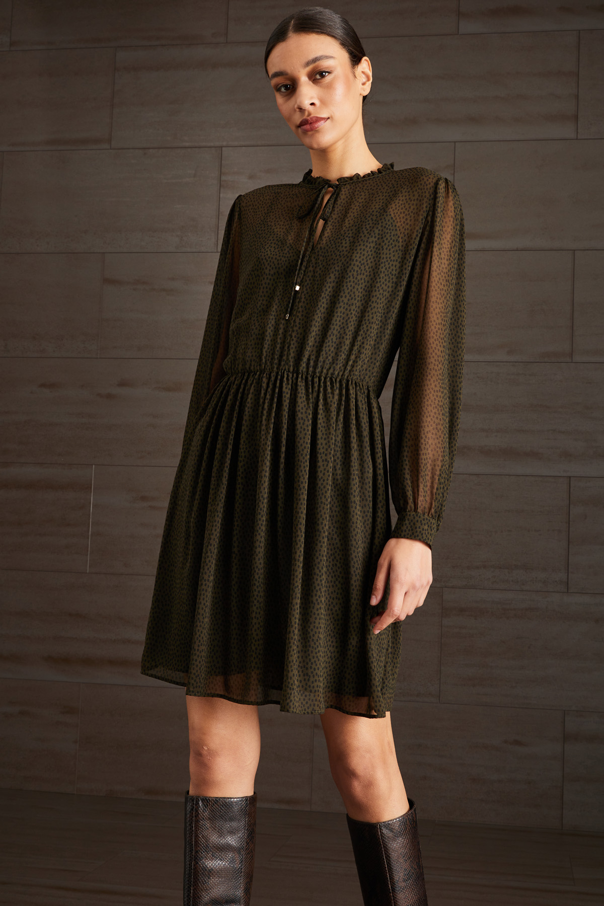 Abito corto dalla linea fluida realizzato in georgette stampato, con scollo rotondo rifinito con rouches e laccetto, maniche lunghe con polsini e bottone, inserto elastico al punto vita. Capo dotato di sottoveste in abbinamento.