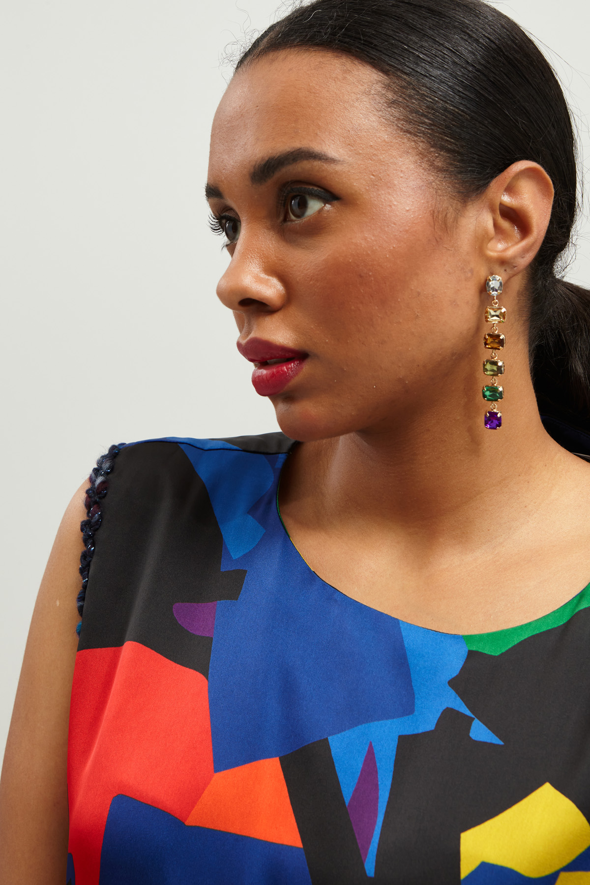 Abito smanicato lungo dalla linea dritta realizzato in raso stampato, con scollo a giro, giro manica rifinito da passamaneria, spacchi al fondo e allacciatura tramite zip invisibile nel retro. Foderato.