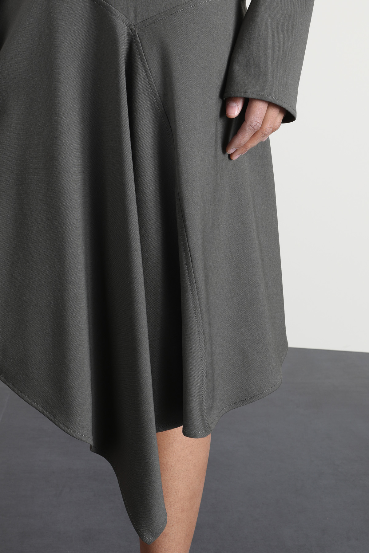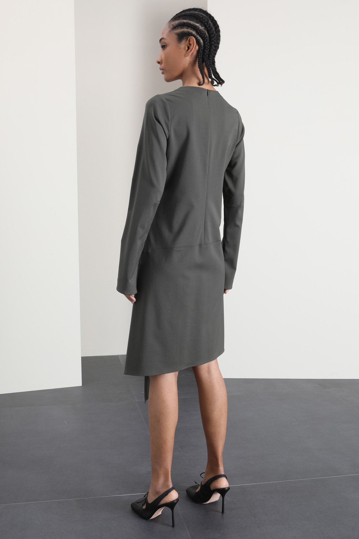 Abito dalla linea sfiancata realizzato in tessuto diagonale di lana stretch, con scollo a giro, maniche lunghe con spacco e bottone, motivo drappeggiato con fondo asimmetrico sul davanti. Allacciatura tramite zip invisibile nel retro.
