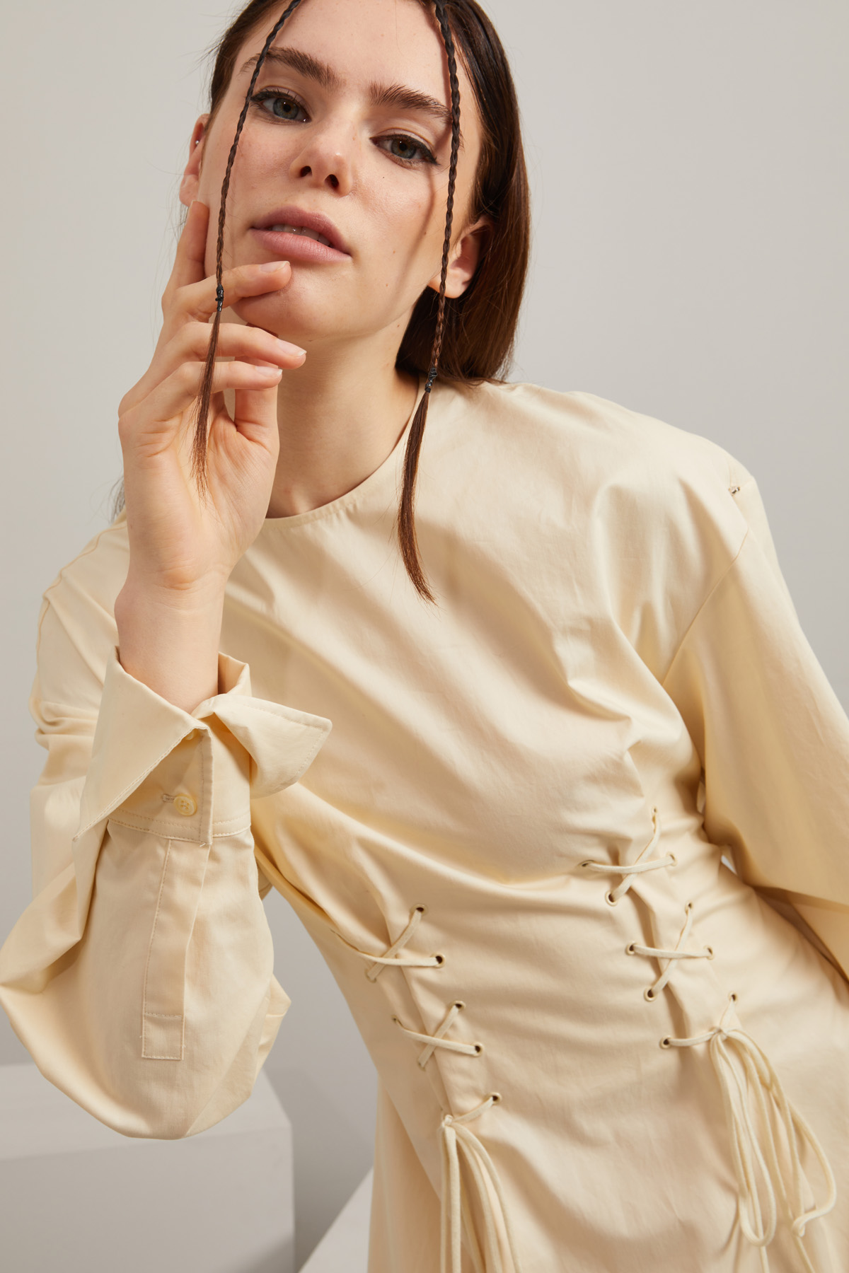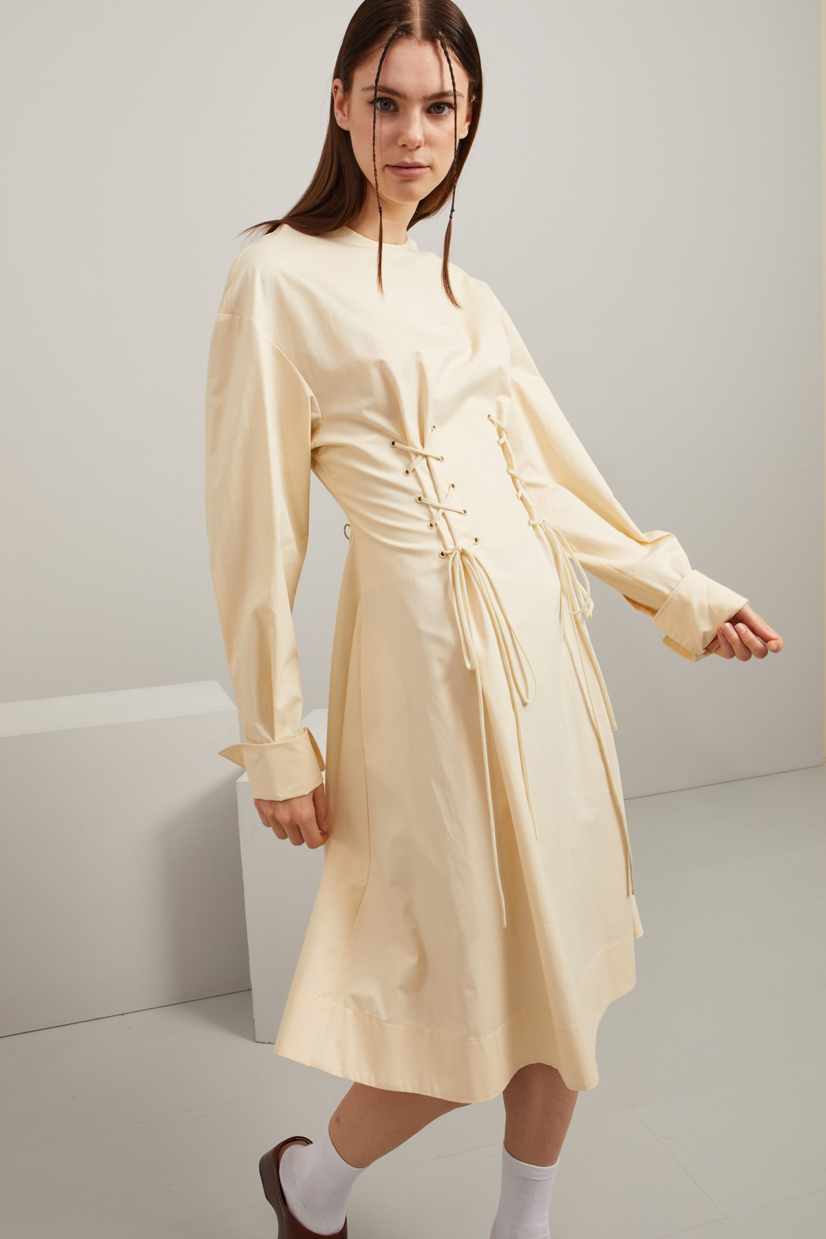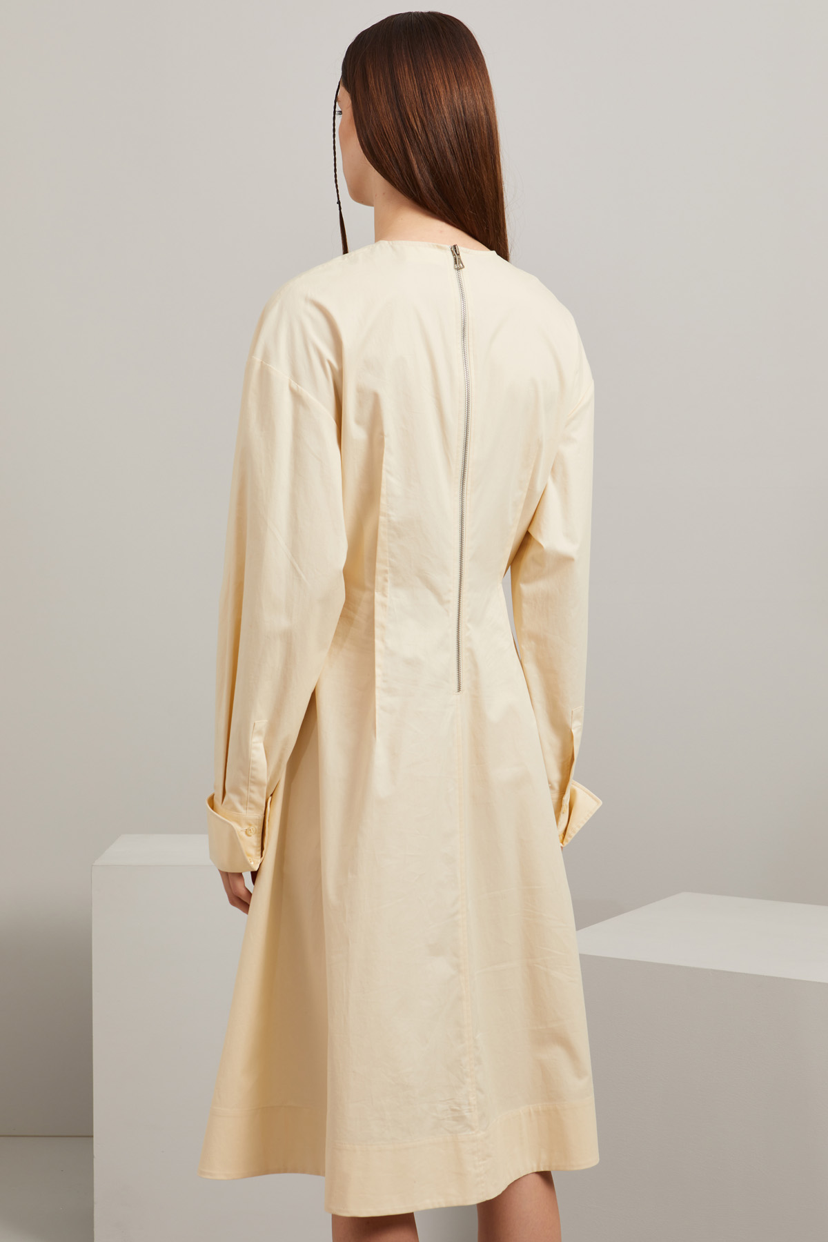 Abito dalla linea sfiancata realizzato in popeline di puro cotone, con scollo a giro, maniche lunghe leggermente a palloncino con polsino alto e bottoni, motivo di occhielli sul davanti con nastrini da annodare e tasche inserite in cucitura laterali. Allacciatura tramite zip nel retro.