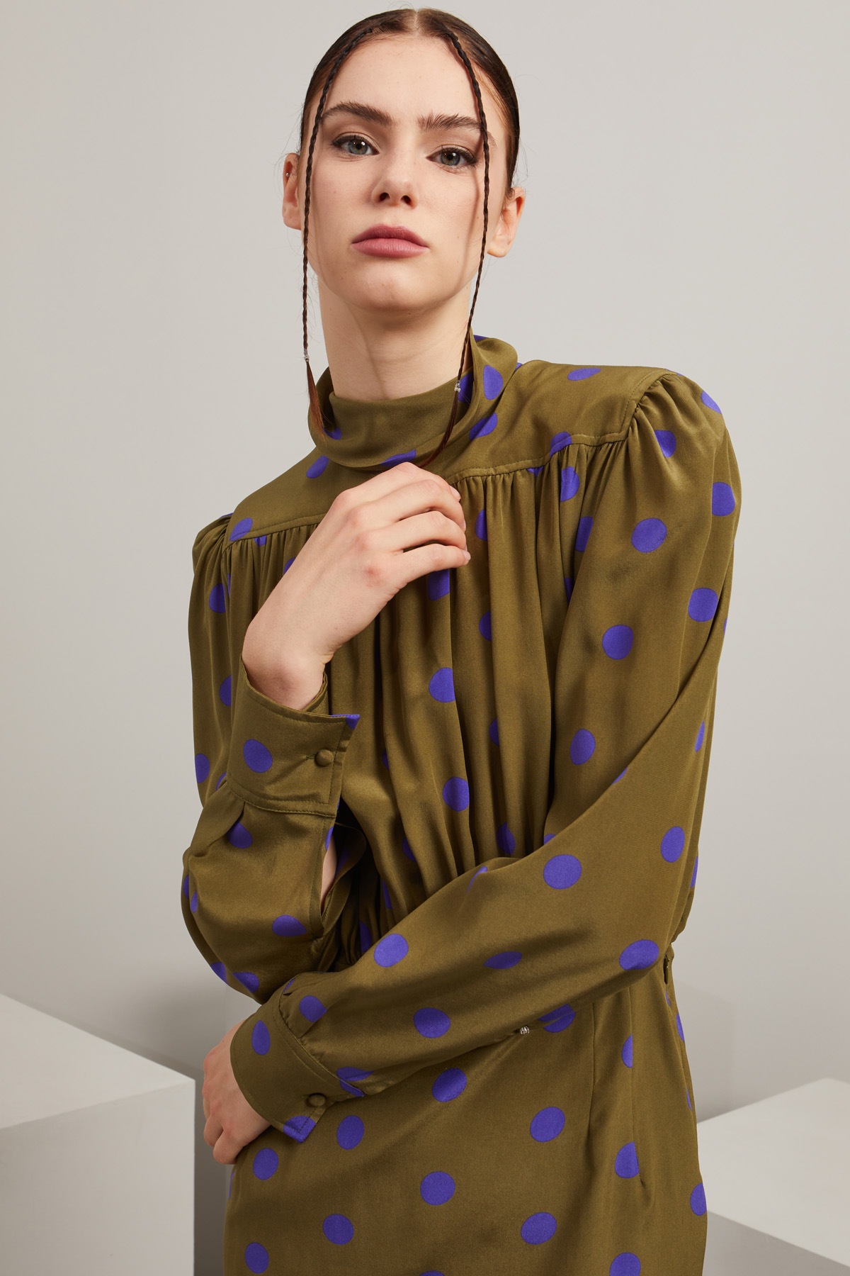 Abito lungo dalla linea fluida realizzato in crépe de chine di pura seta stampata, collo alto con bottoni nel retro, maniche lunghe leggermente a sbuffo con polsino, motivo arricciato e drappeggiato nella parte superiore. Allacciatura tramite zip invisibile sul fianco. Semifoderato.