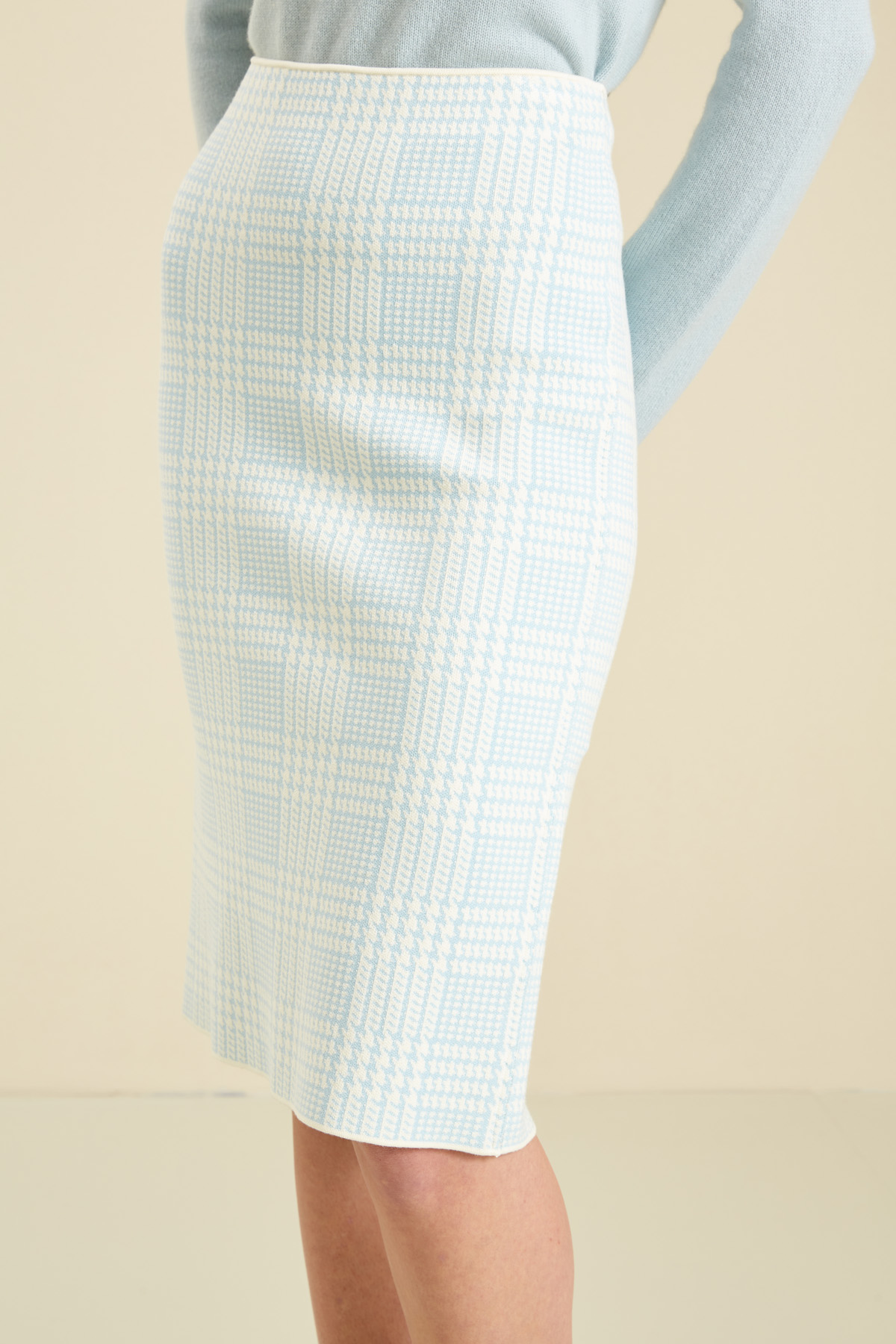 Gonna midi a tubo realizzata in maglia di misto viscosa jacquard, con inserto elastico in vita e spacco nel retro al fondo.