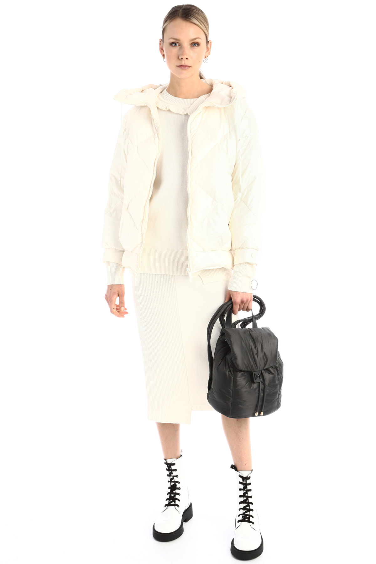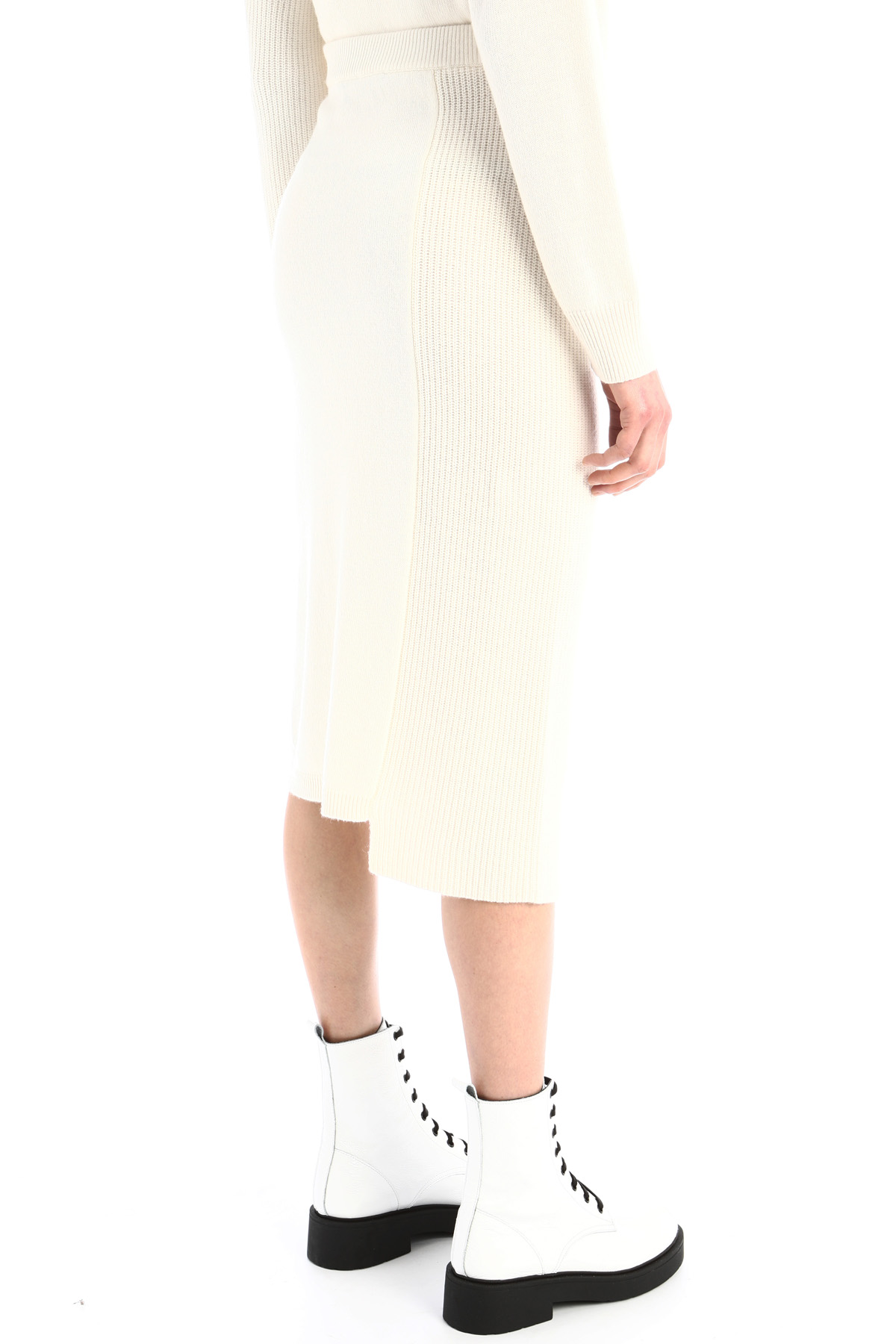 Gonna dalla linea dritta in filato misto lana e viscosa, con inserto elastico in vita, pannello lavorato a coste e fondo asimmetrico.