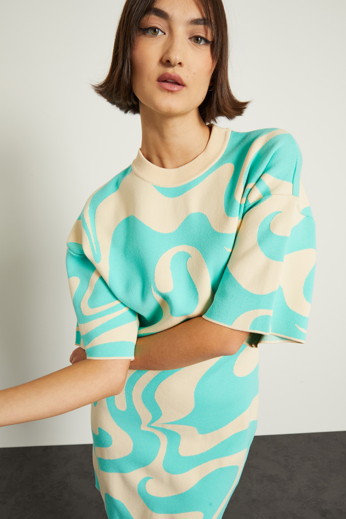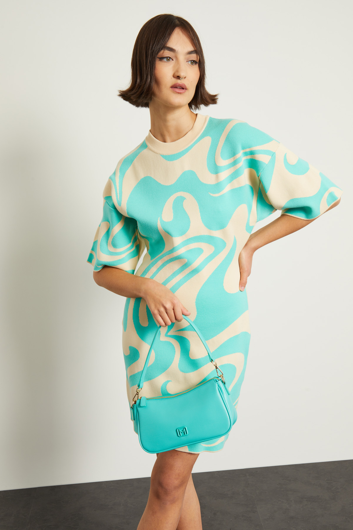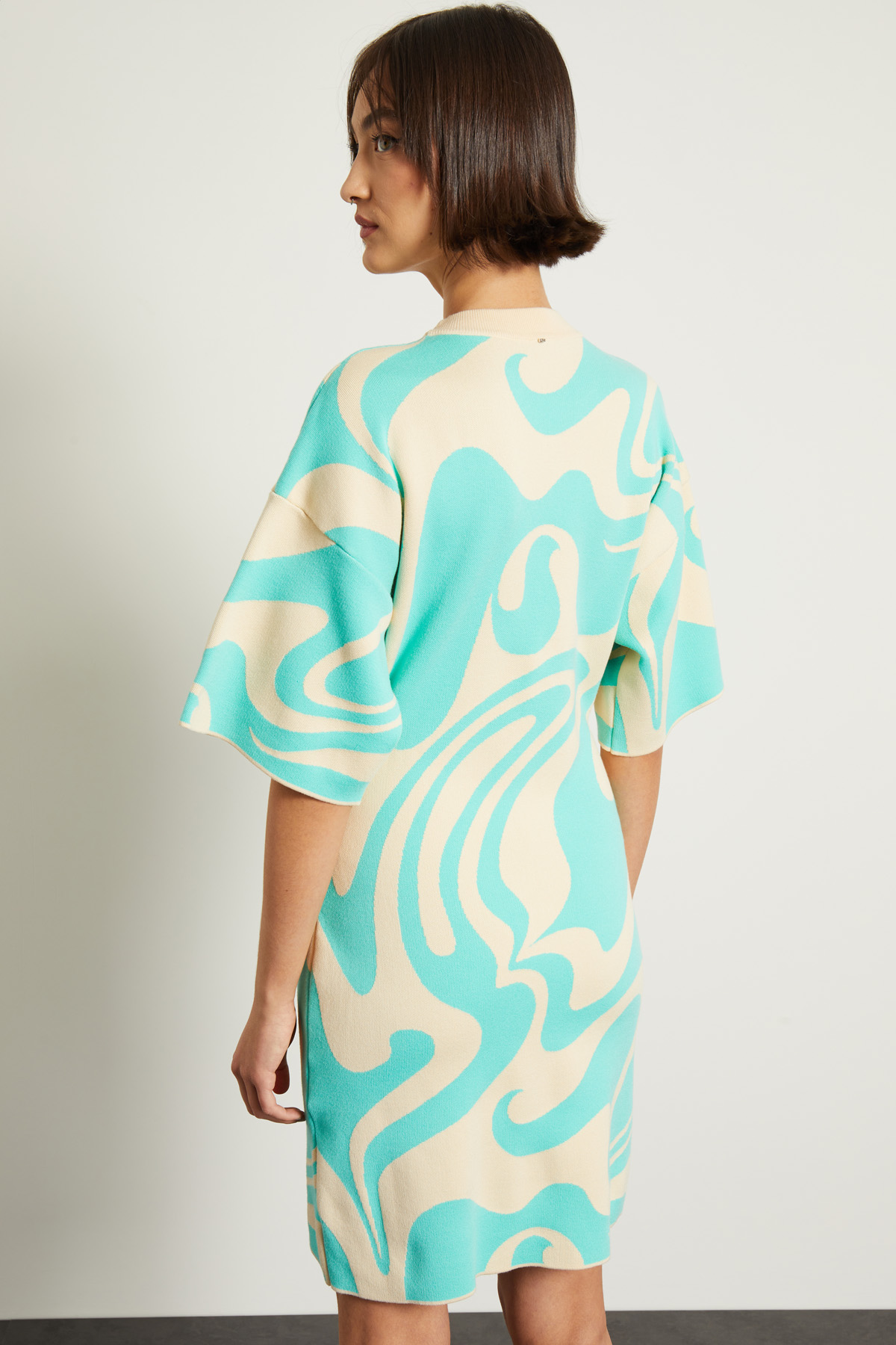 Abito corto dalla linea sfiancata realizzato in maglia di misto viscosa jacquard, con collo montante e maniche corte ampie.