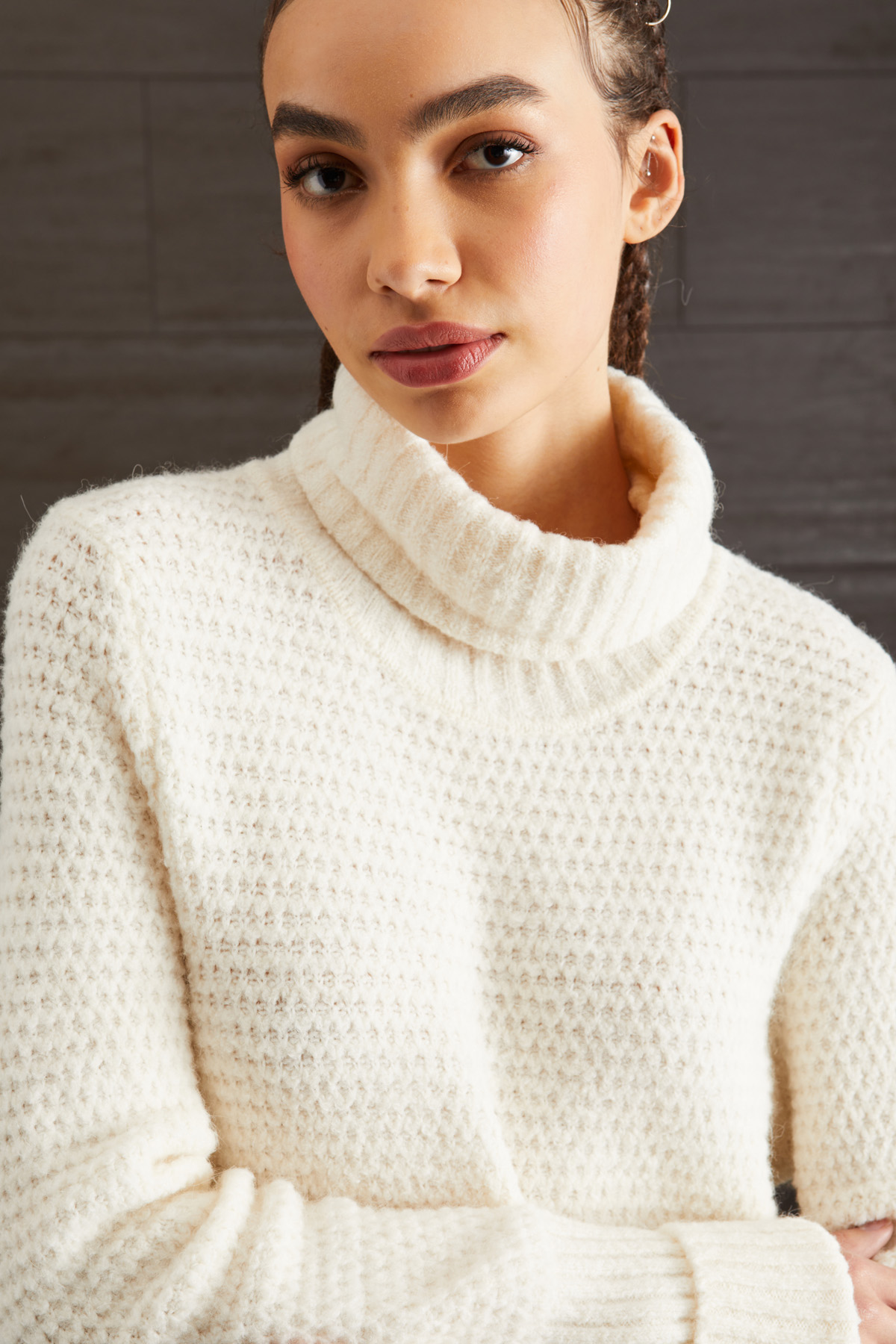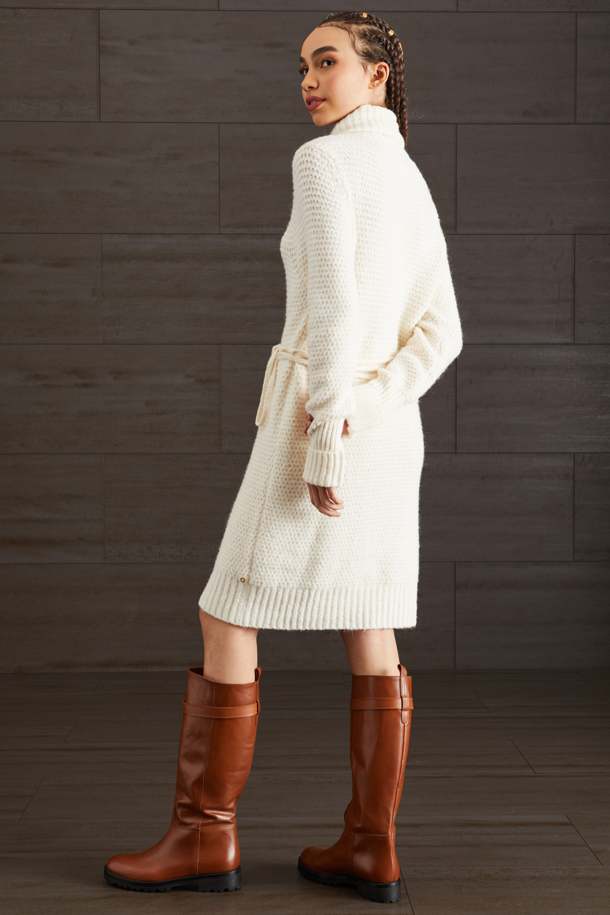 Abito corto dalla linea morbida realizzato in maglia di misto cotone, lana e alpaca con lavorazione a nido d'ape. Il modello ha collo alto, maniche lunghe, cinturino coordinato da annodare in vita e profili rifiniti a coste.