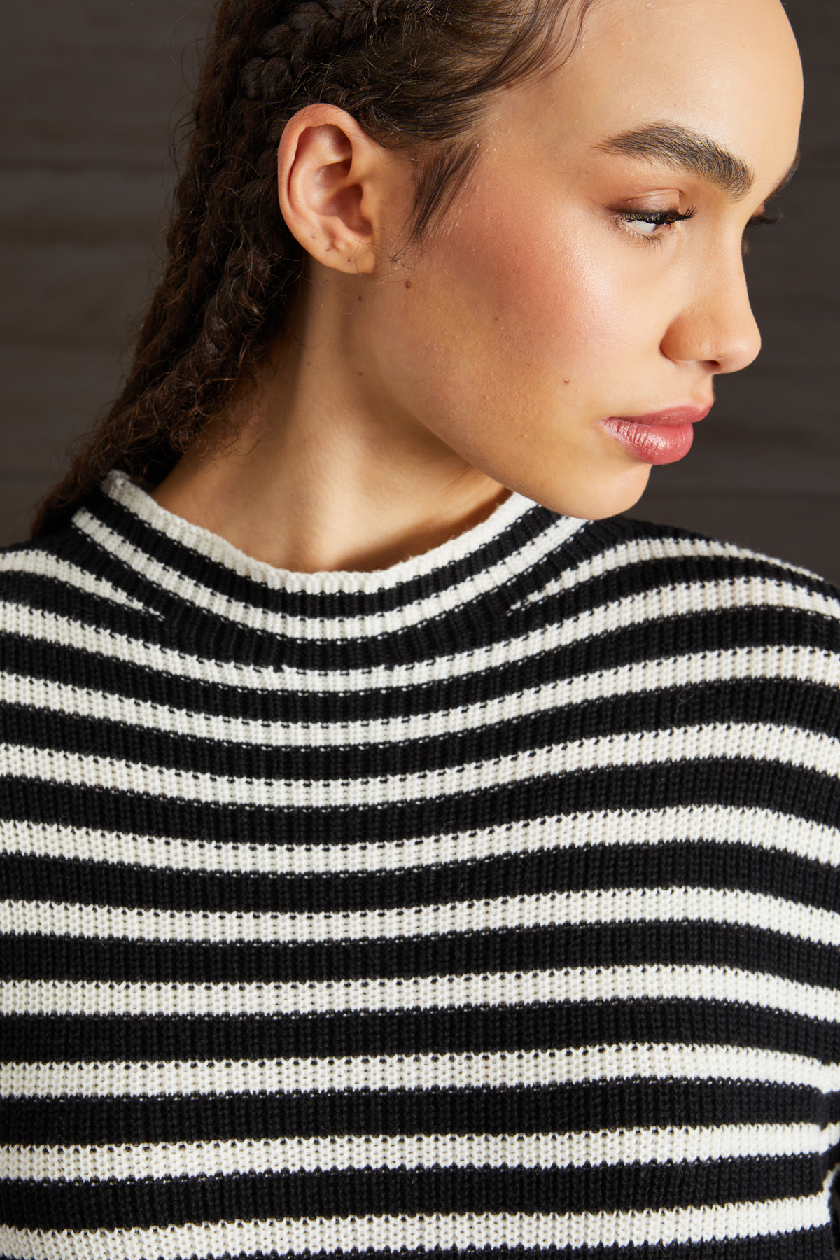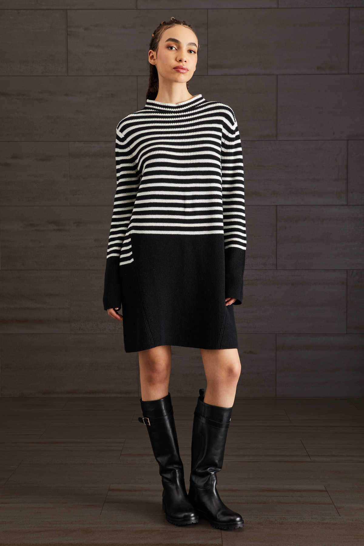 Abito corto dalla linea morbida realizzato in maglia di cotone e lana tinto filo con lavorazione a coste. Il modello presenta collo montante e maniche lunghe.
