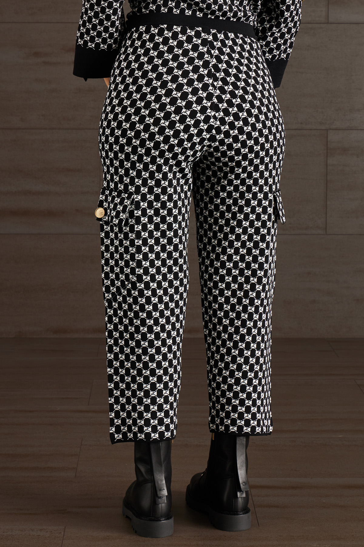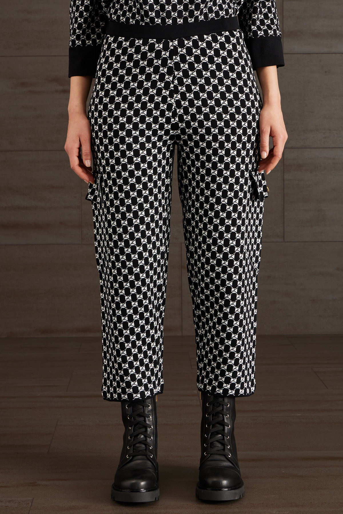 Pantaloni cropped dalla linea dritta realizzati in maglia jacquard di misto viscosa stretch, con cintone in vita, tasche applicate con patta e bottone sulla lunghezza.