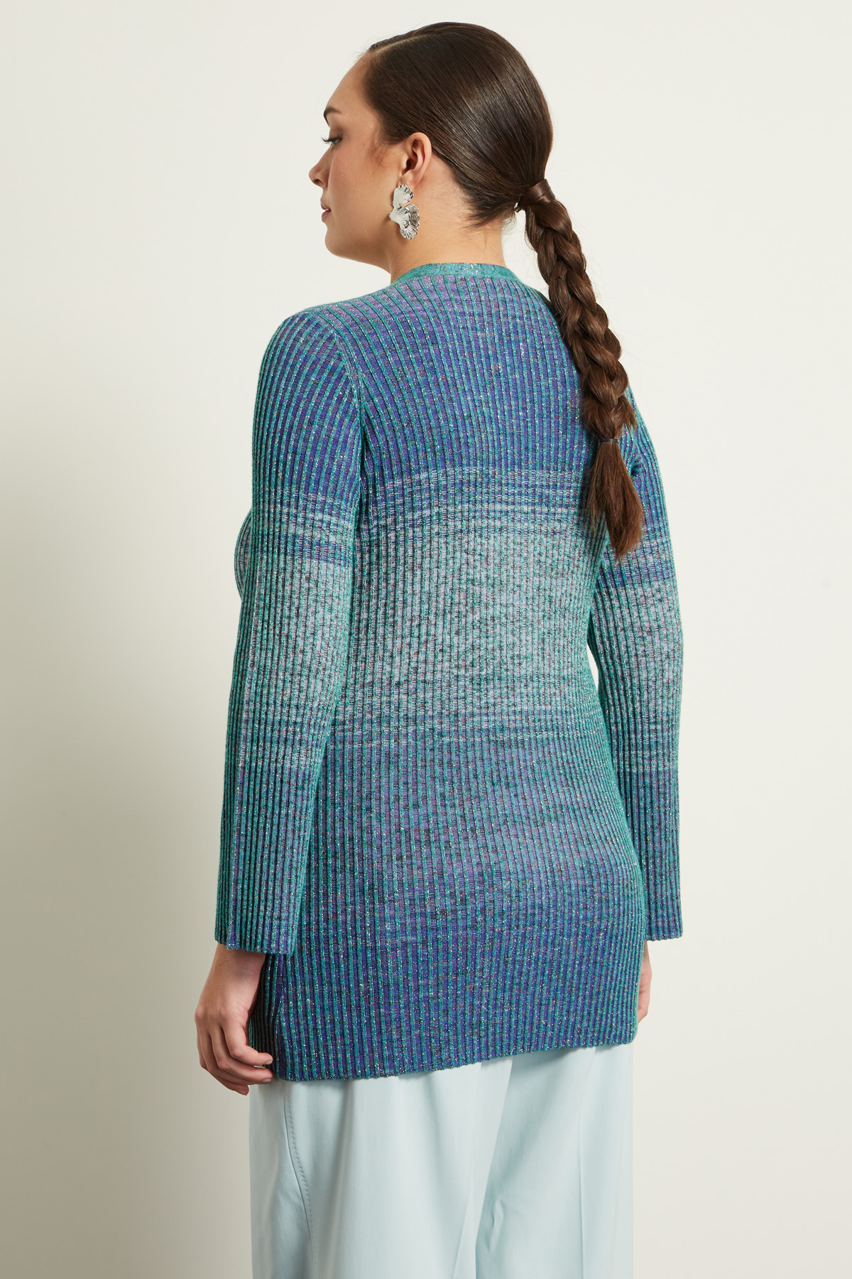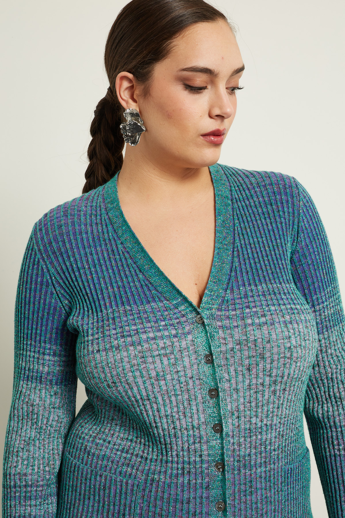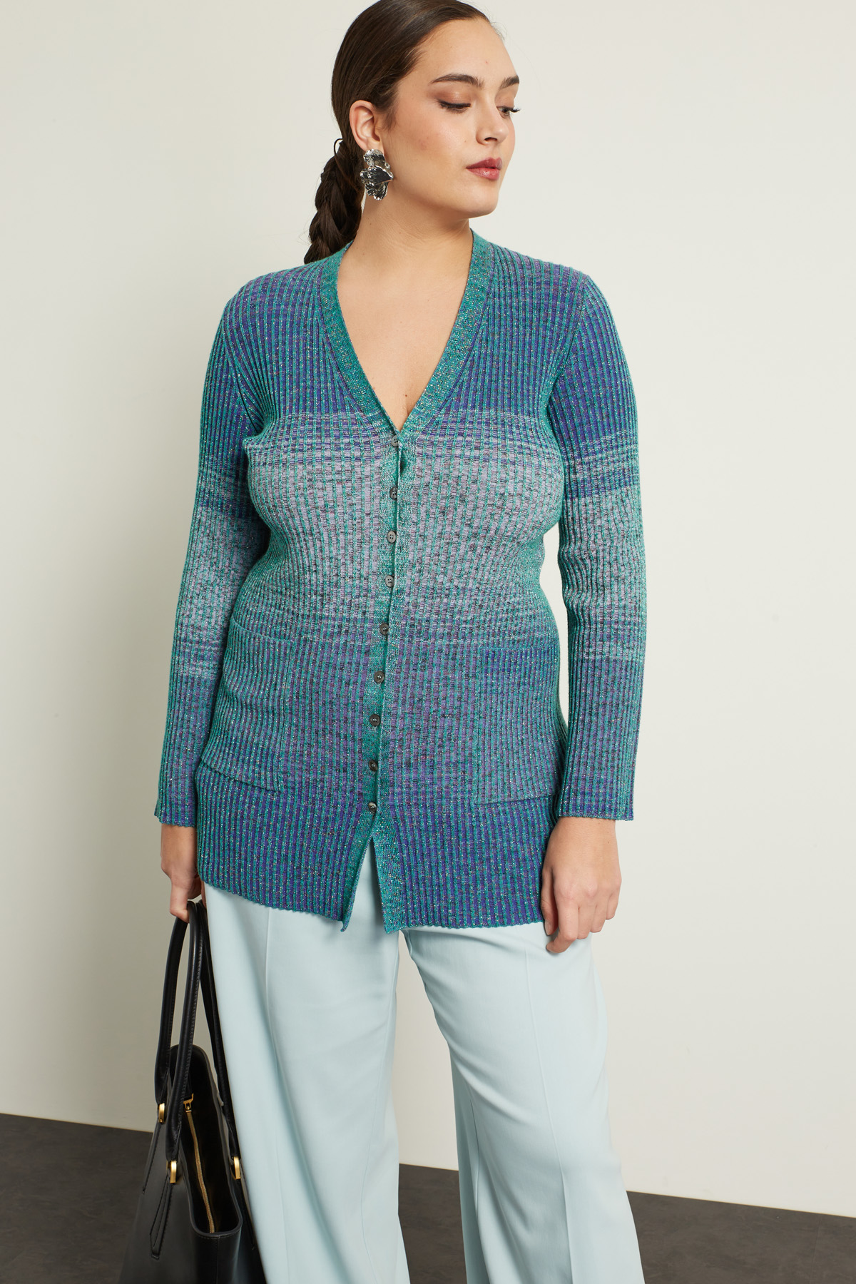 Cardigan dalla linea dritta realizzato in filato di misto viscosa e cotone lamè a coste, con scollo a V, maniche lunghe e tasche applicate. Allacciatura tramite bottoni.