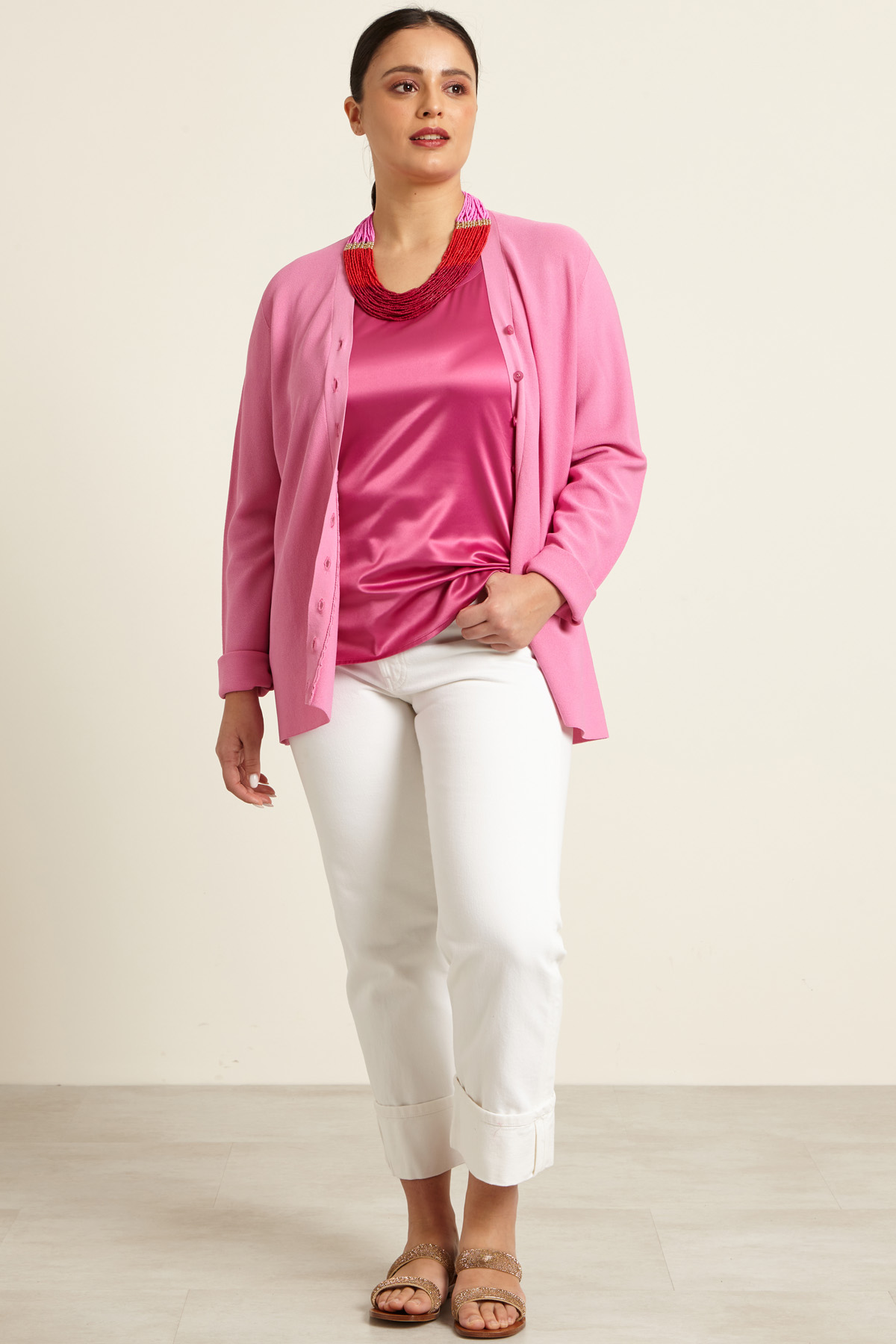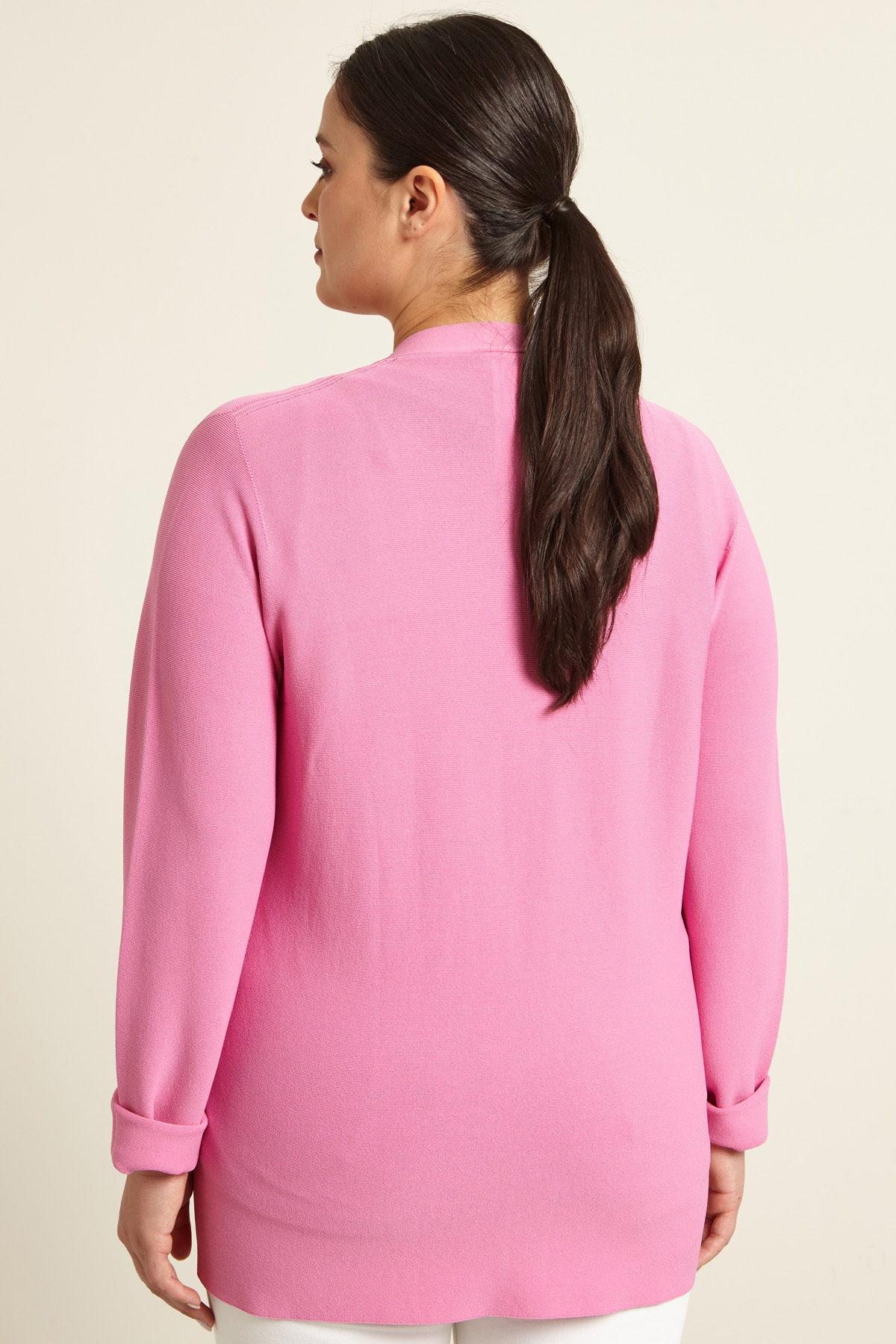 Cardigan dalla linea dritta realizzato in filato di misto viscosa con scollo a V, maniche lunghe e allacciatura tramite bottoni.