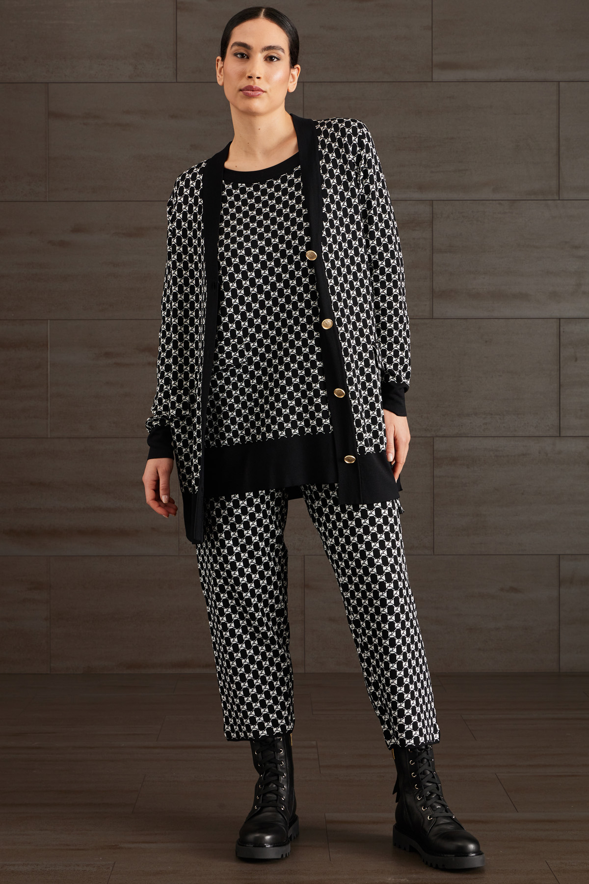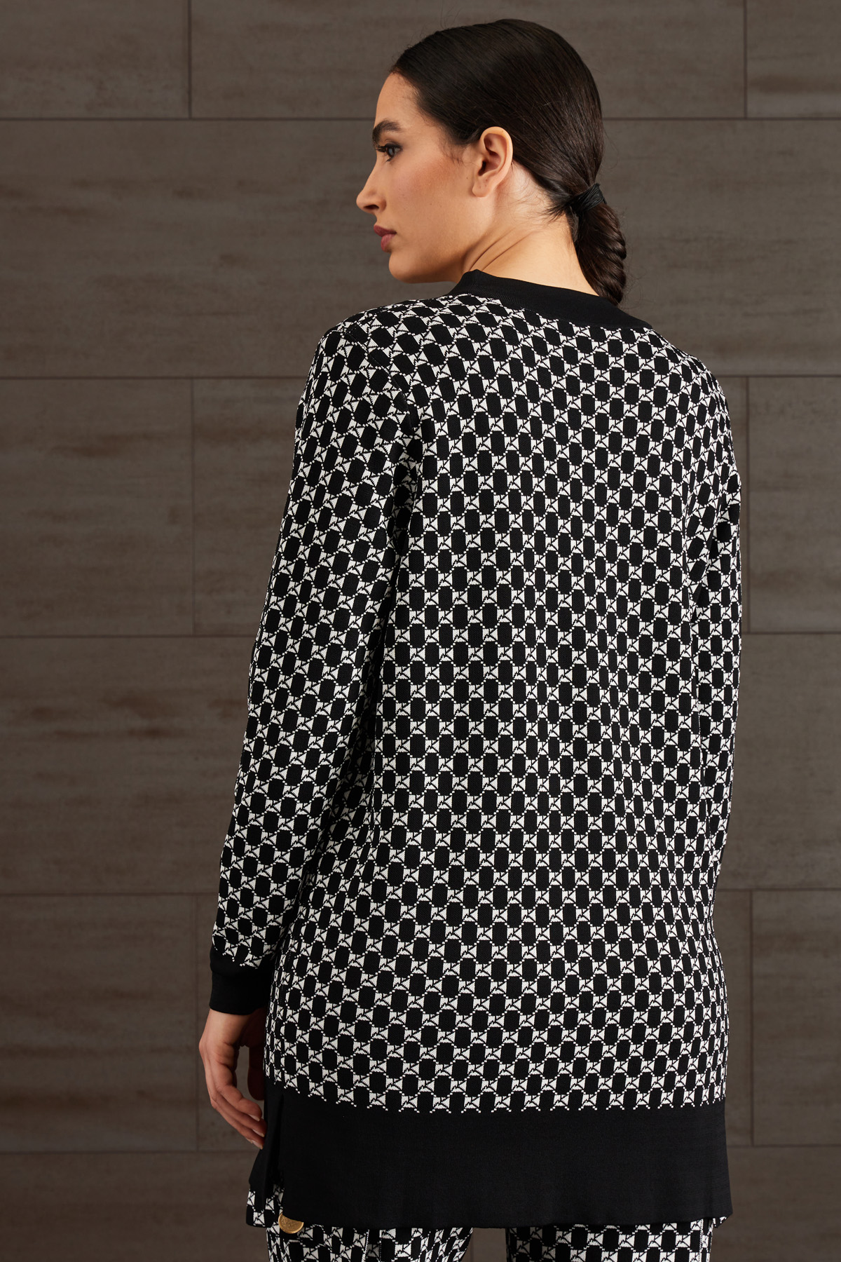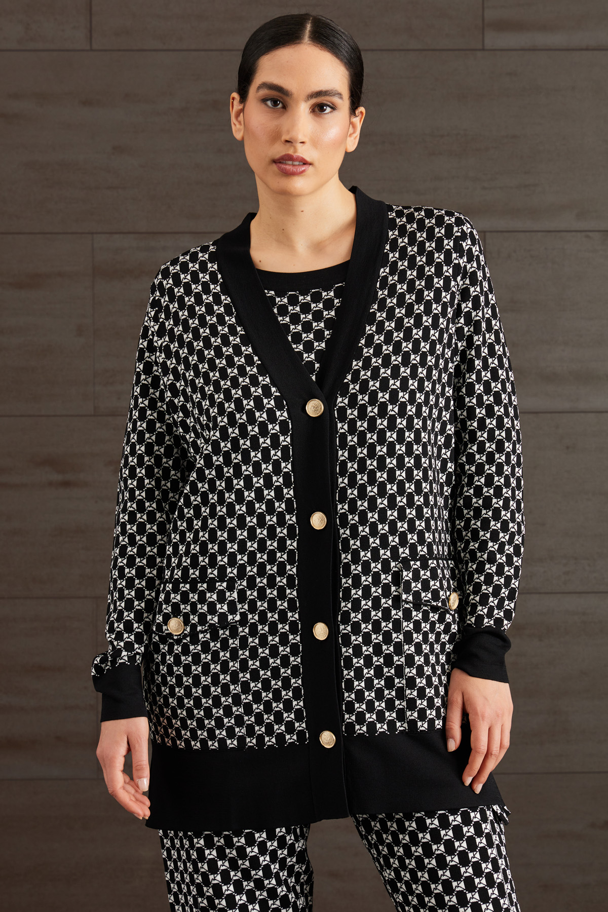 Cardigan dalla linea dritta realizzato in filato di viscosa jacquard, con scollatura a V, maniche lunghe, tasche applicate con patta e bottone in metallo, spacchetti laterali. Allacciatura tramite bottoni.