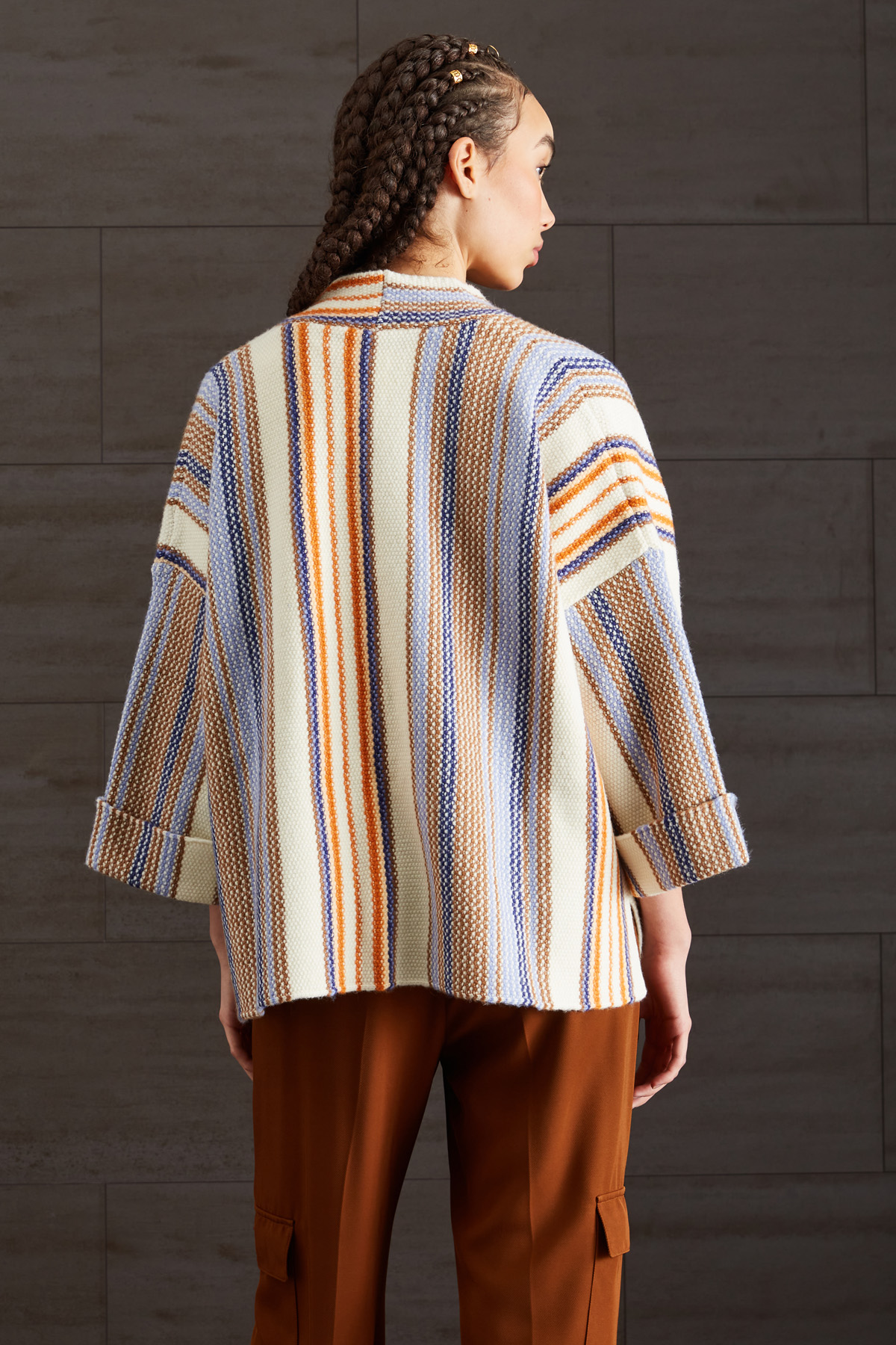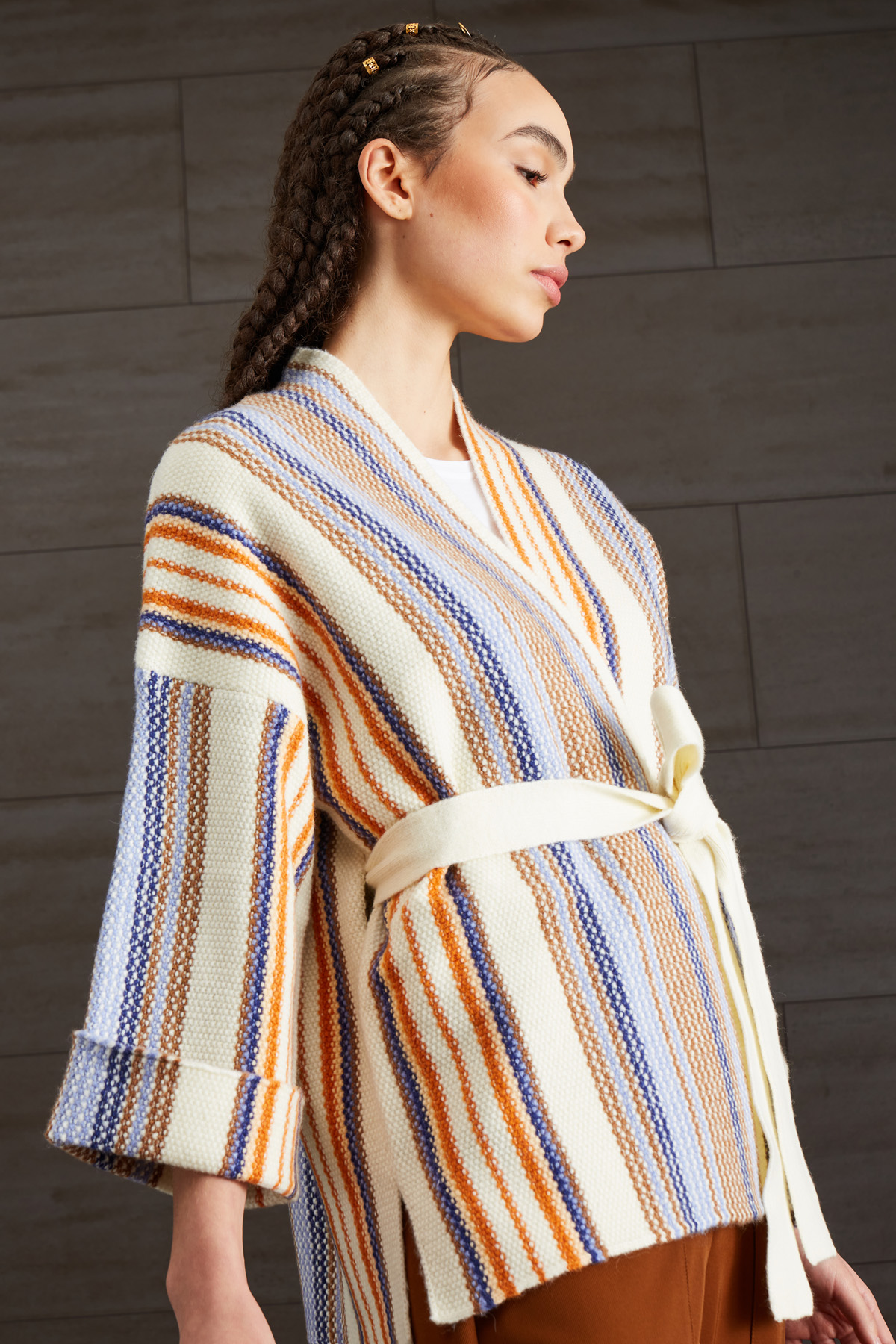 Cardigan dalla linea morbida realizzato in filato di misto lana e alpaca, con maniche lunghe dal giro sceso e risvolto al polso, asole laterali, spacchetti al fondo e allacciatura tramite cintura coordinata.