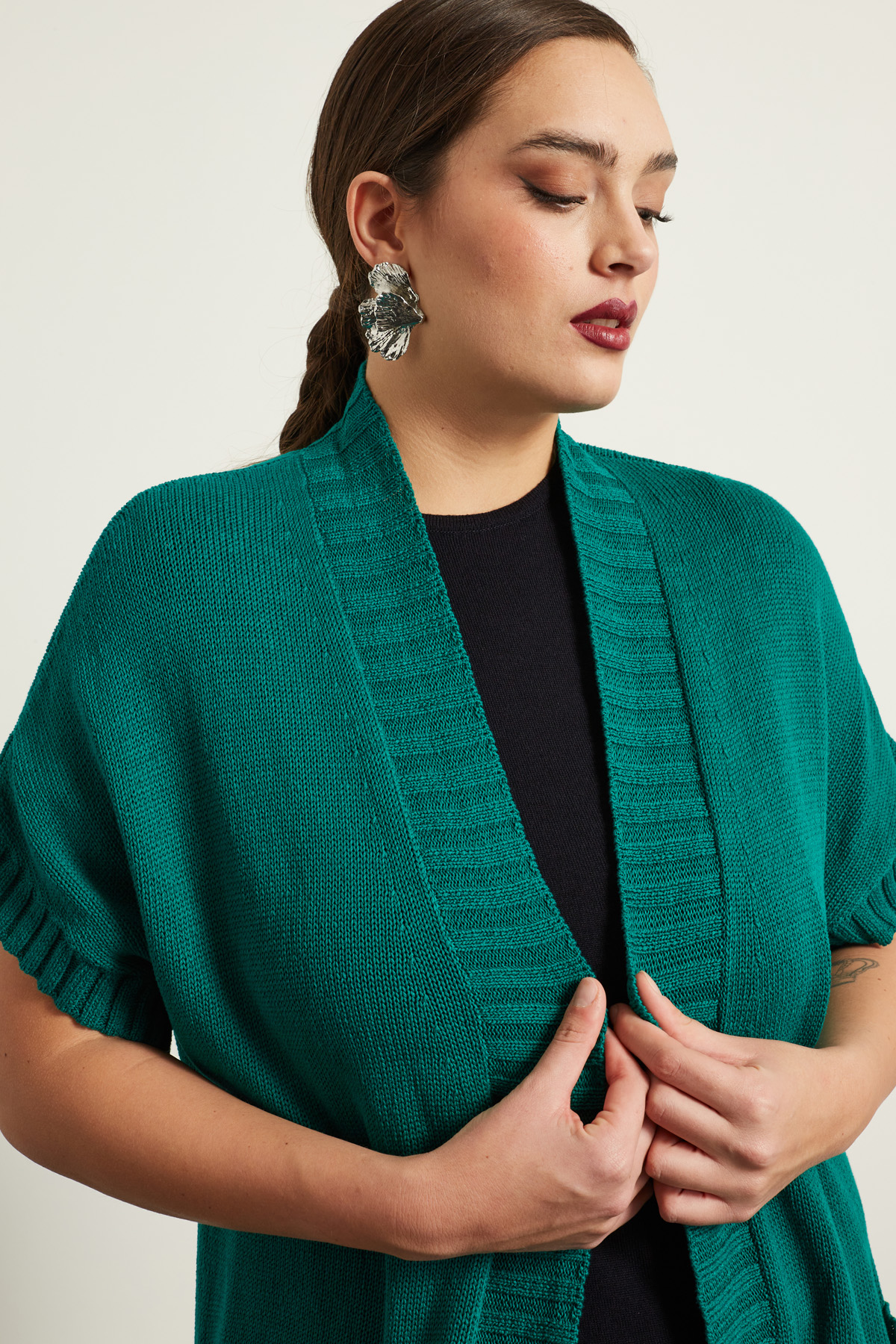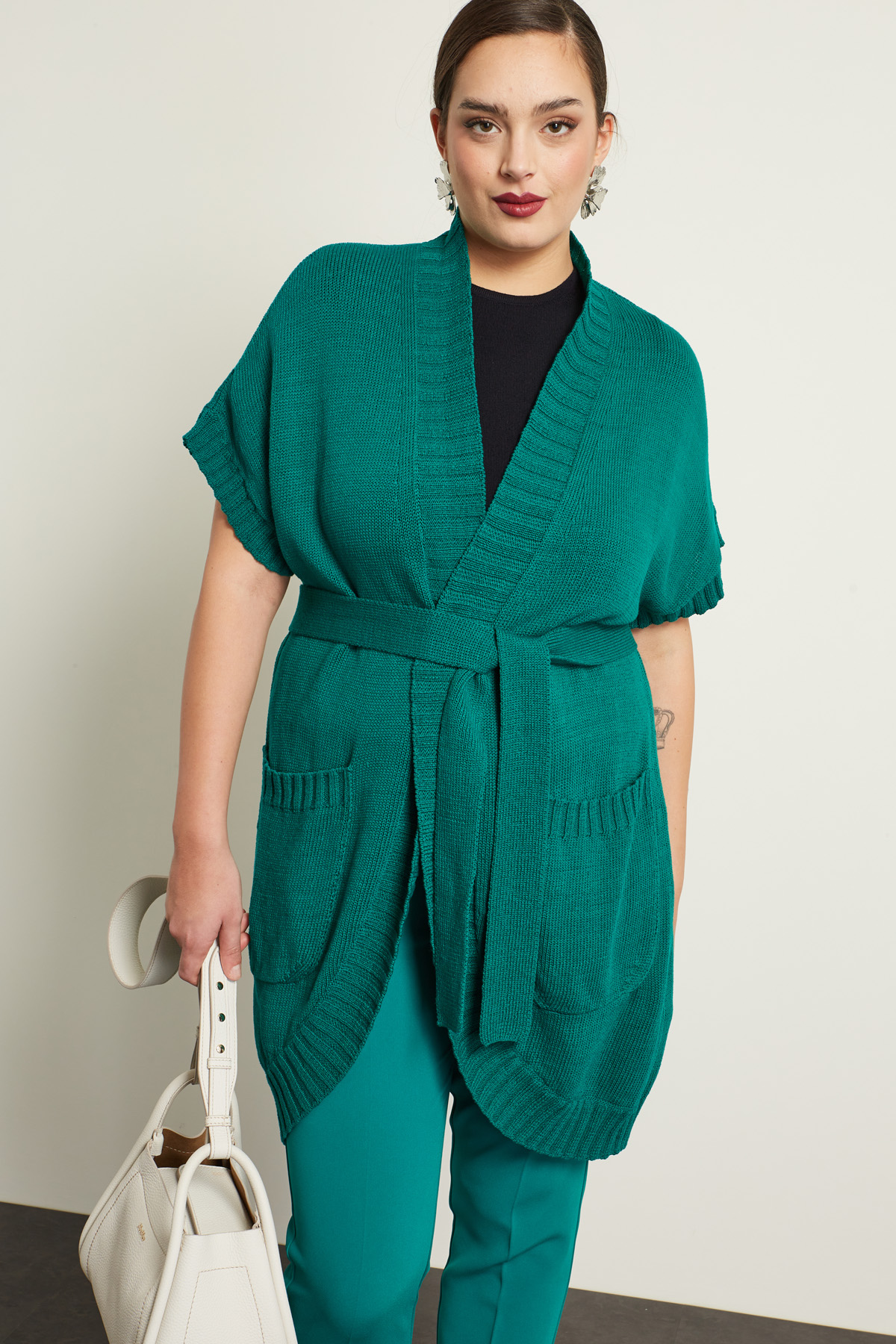 Cardigan dalla linea dritta realizzato in filato di puro cotone, con scollo a V, maniche corte a kimono, tasche applicate e profili rifiniti a coste. Allacciatura tramite cintura coordinata.