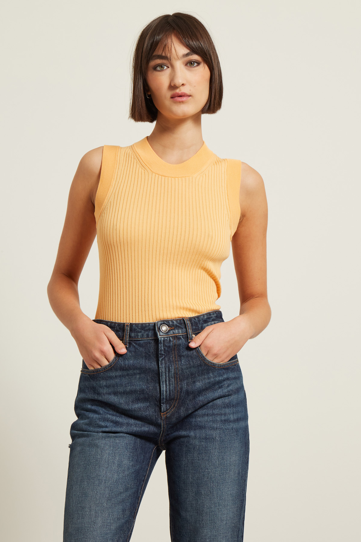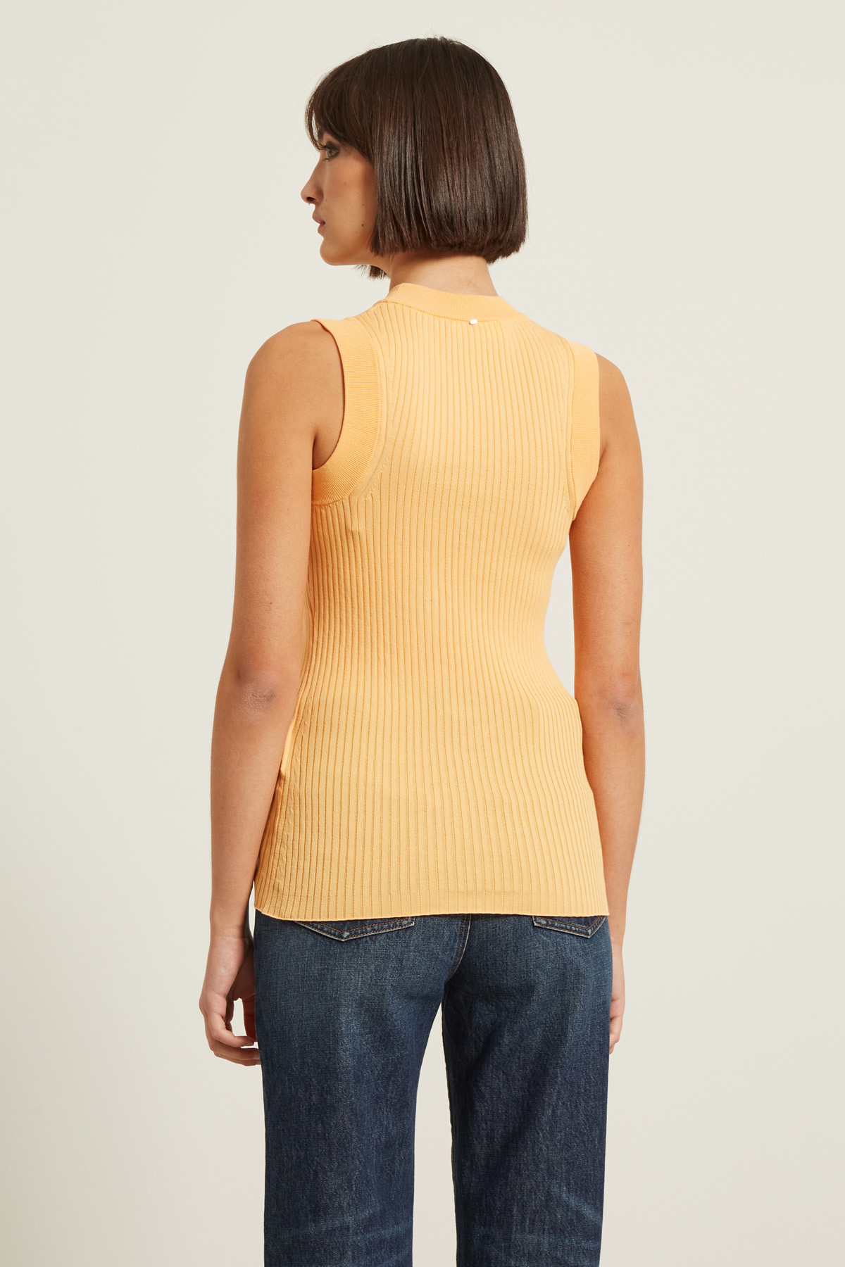 Top dalla linea aderente realizzato in maglia di puro cotone lavorata a coste con scollo a giro.