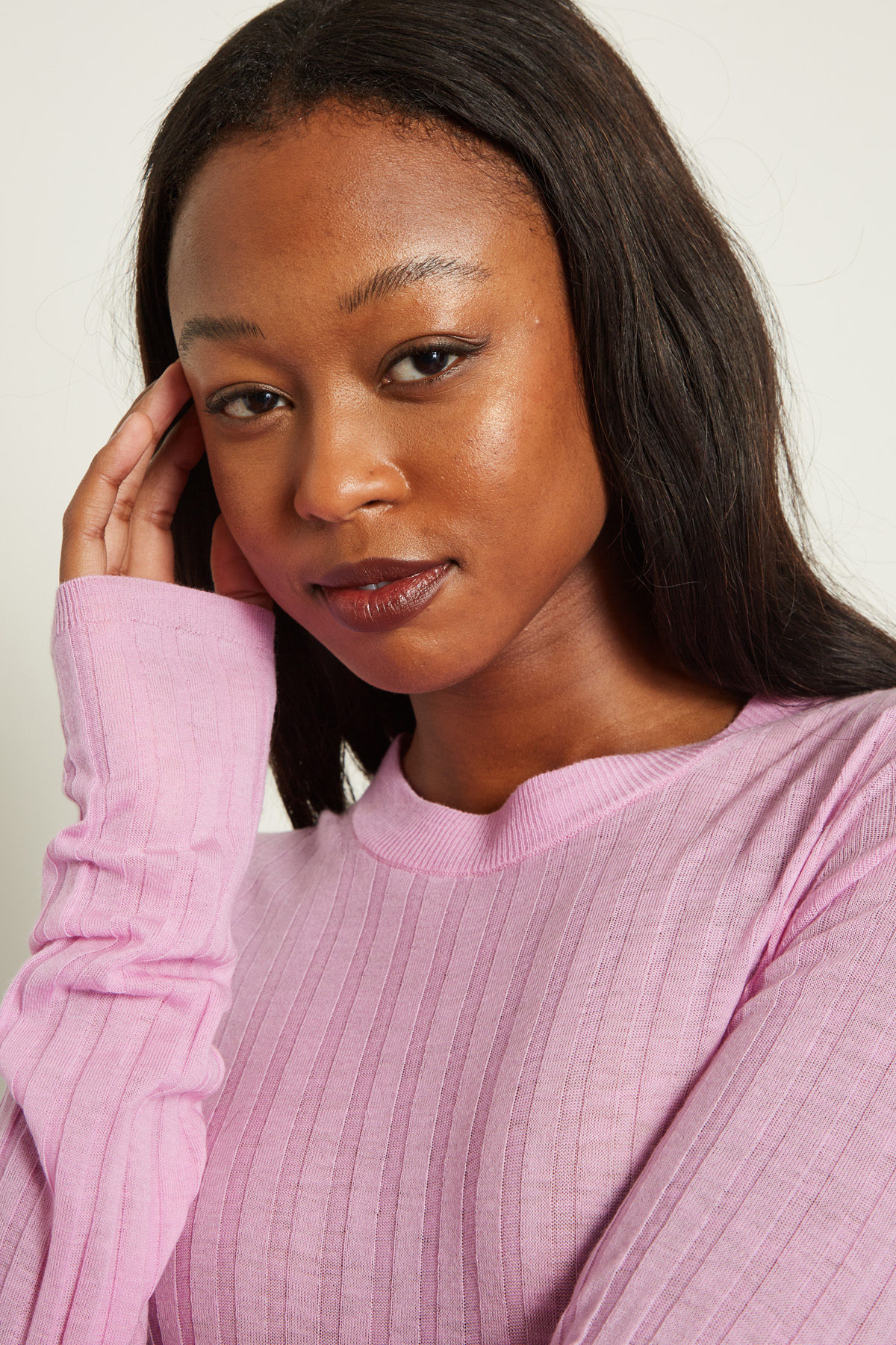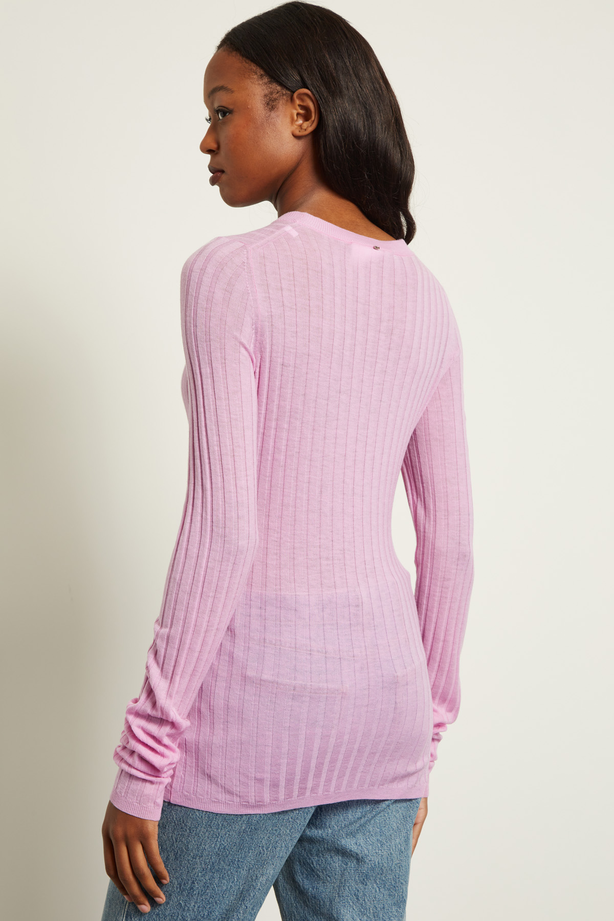 Maglia dalla linea aderente realizzata in filato di pura lana con lavorazione a coste, collo a giro e maniche lunghe.