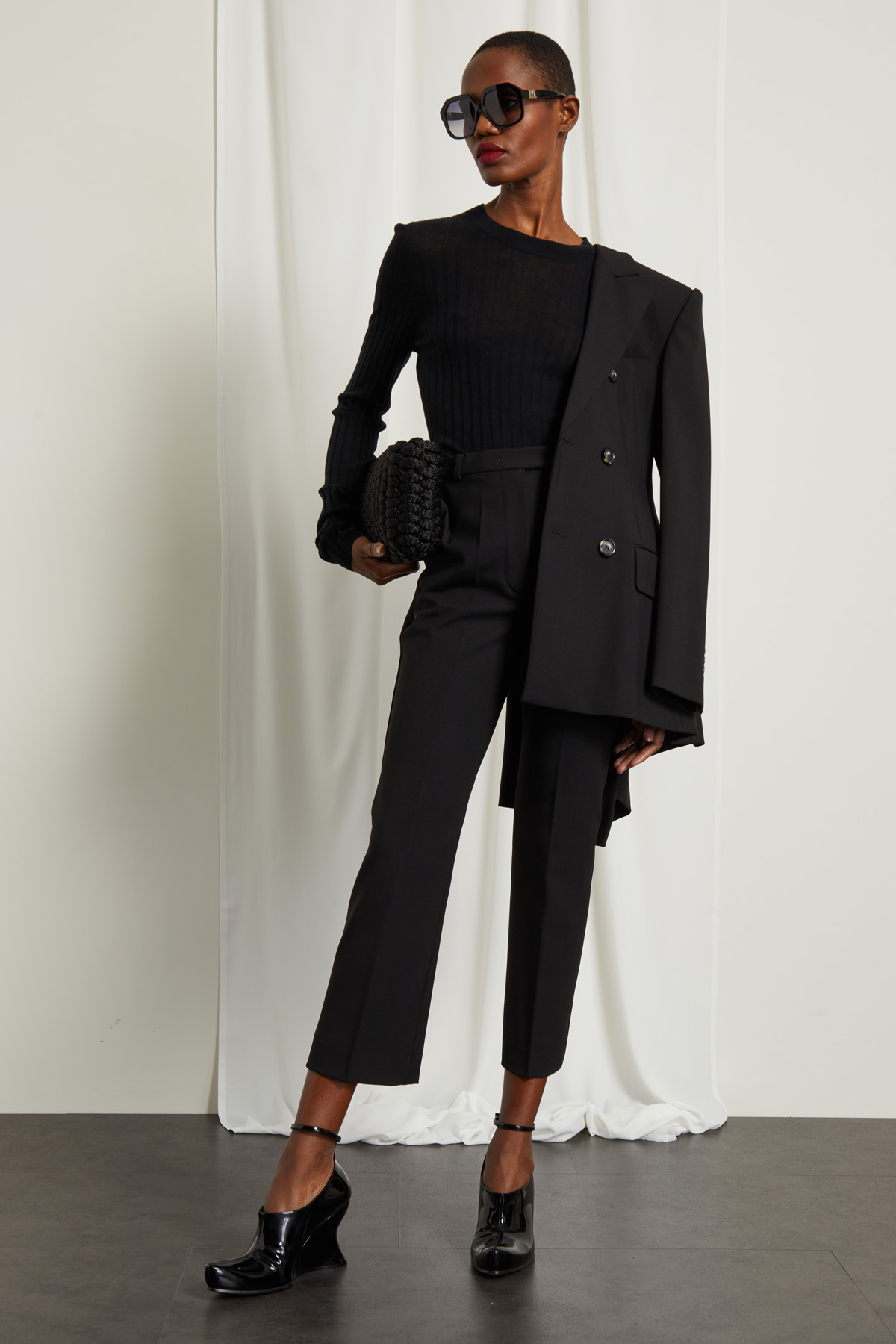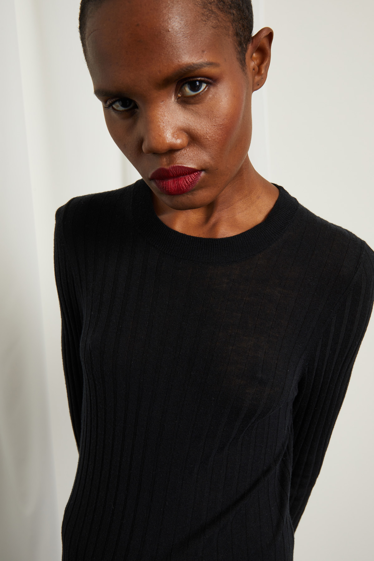 Maglia dalla linea aderente realizzata in filato di pura lana con lavorazione a coste, collo a giro e maniche lunghe.