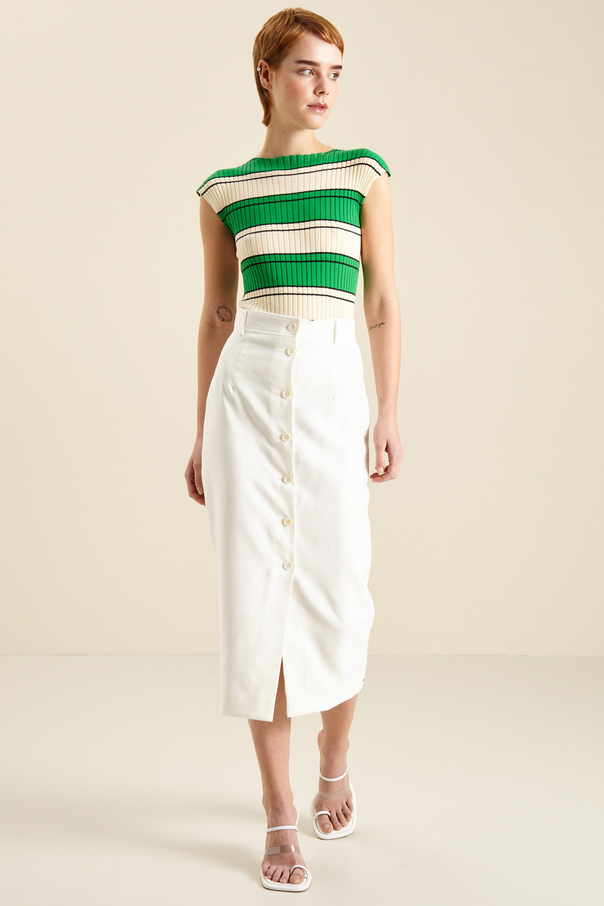 Top dalla linea aderente realizzato in maglia di cotone e lino tinto filo lavorato a coste, con scollo rotondo e maniche ad aletta.