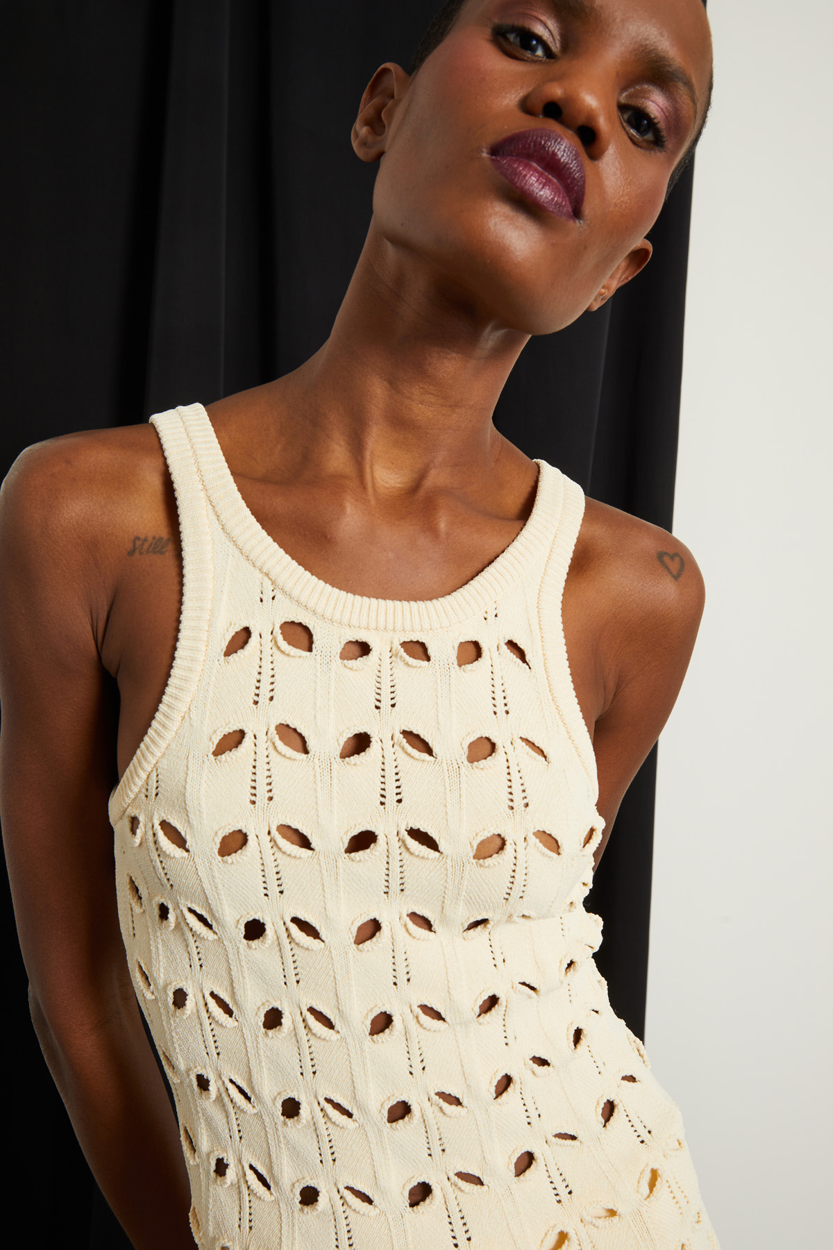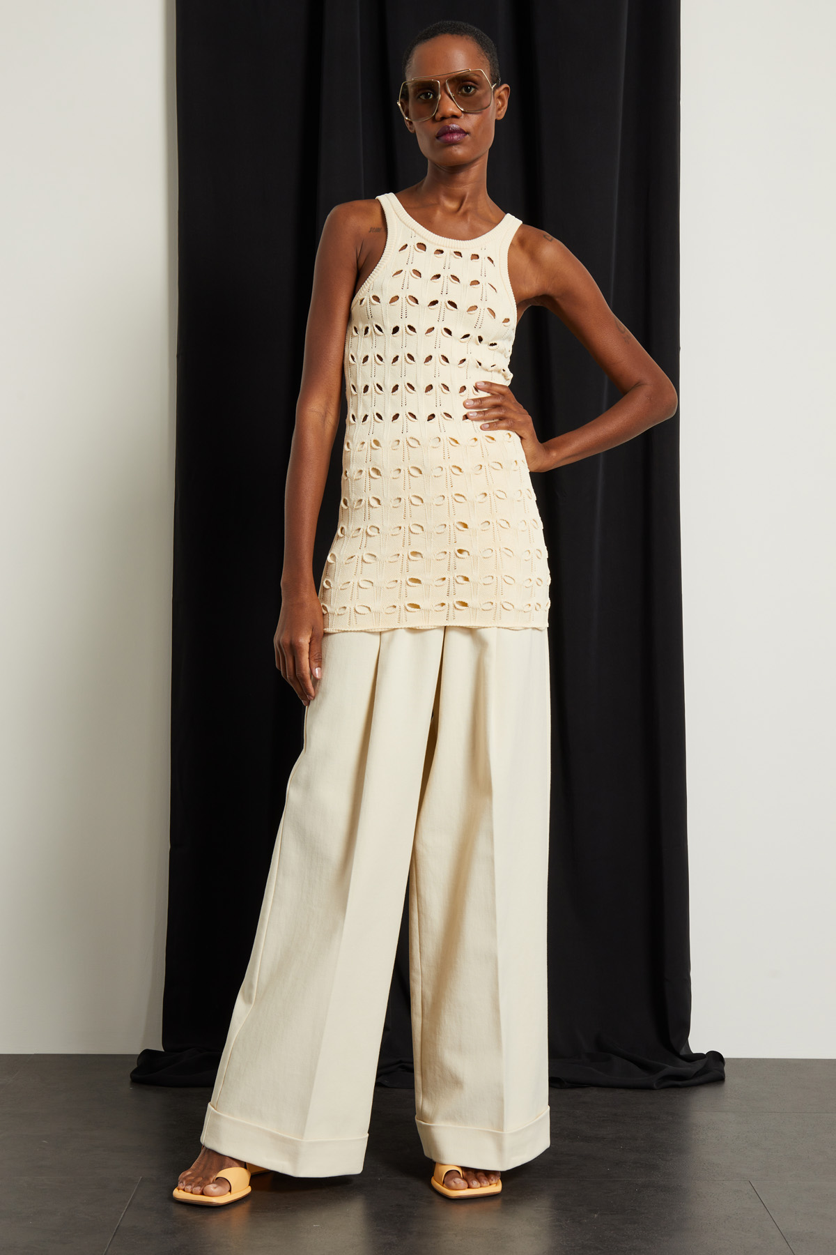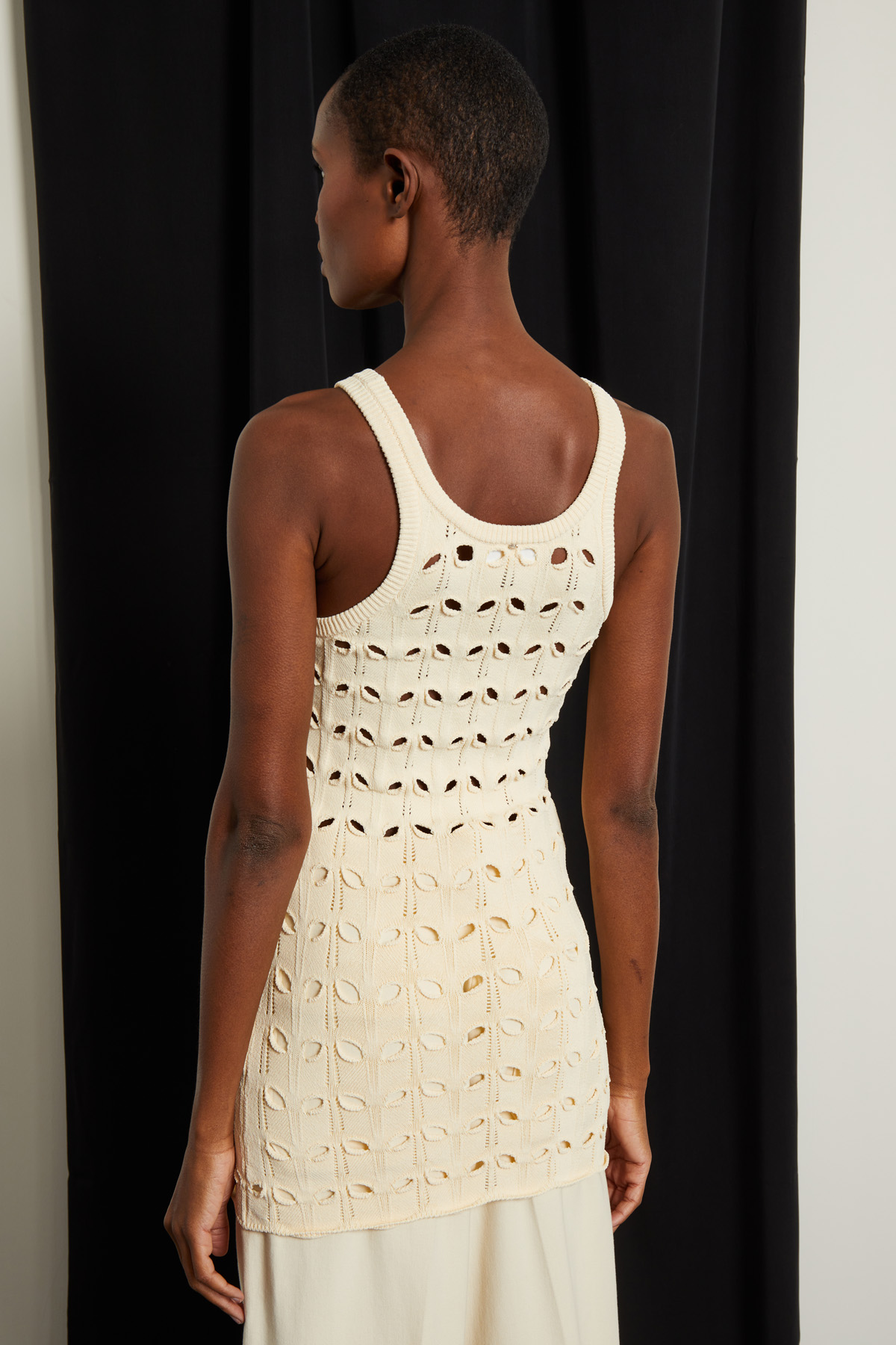 Top smanicato dalla linea aderente realizzato in maglia di misto viscosa con lavorazione traforata, scollo rotondo e profili rifiniti a coste.