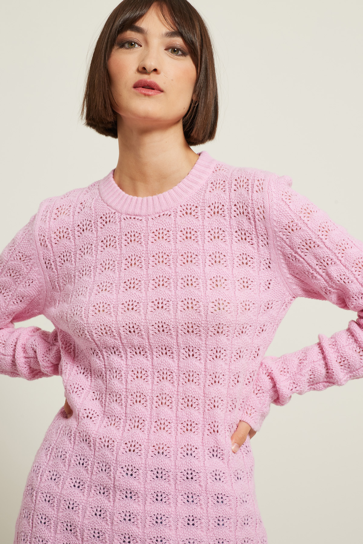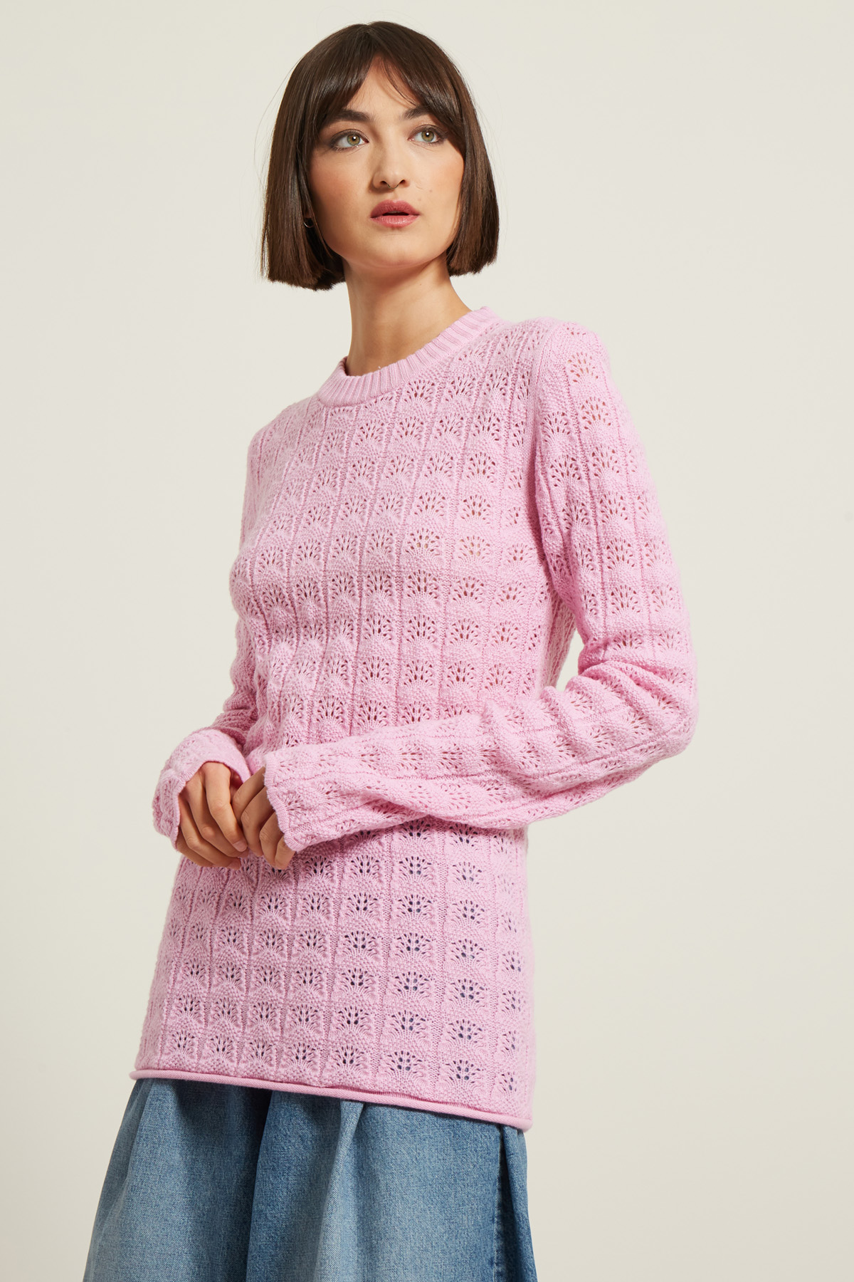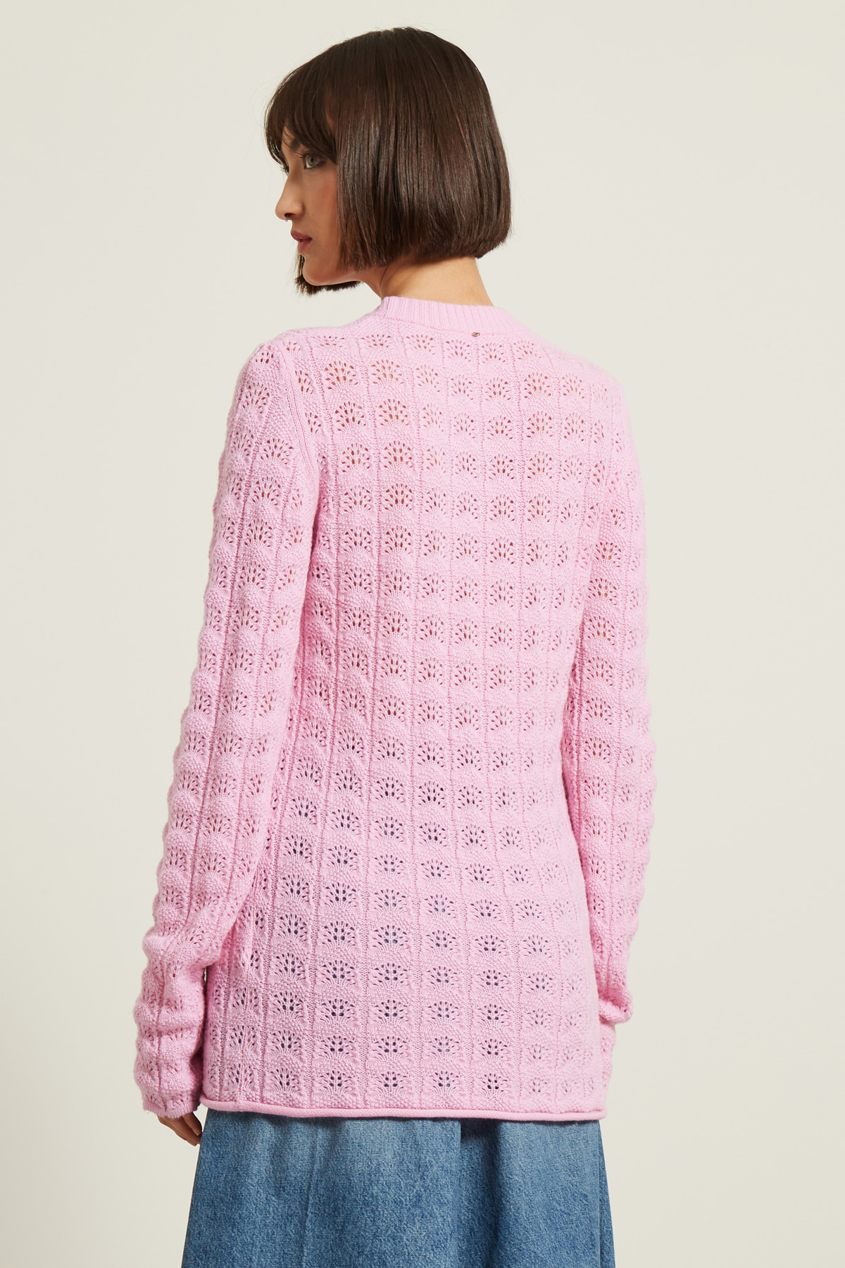 Maglia dalla linea dritta realizzata in filato di lana e cashmere, con lavorazione traforata, collo montante, maniche lunghe e profili rifiniti a coste.