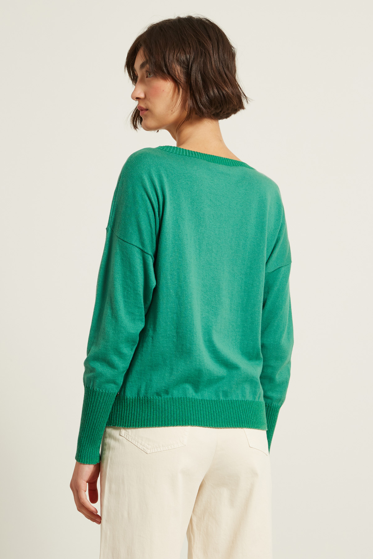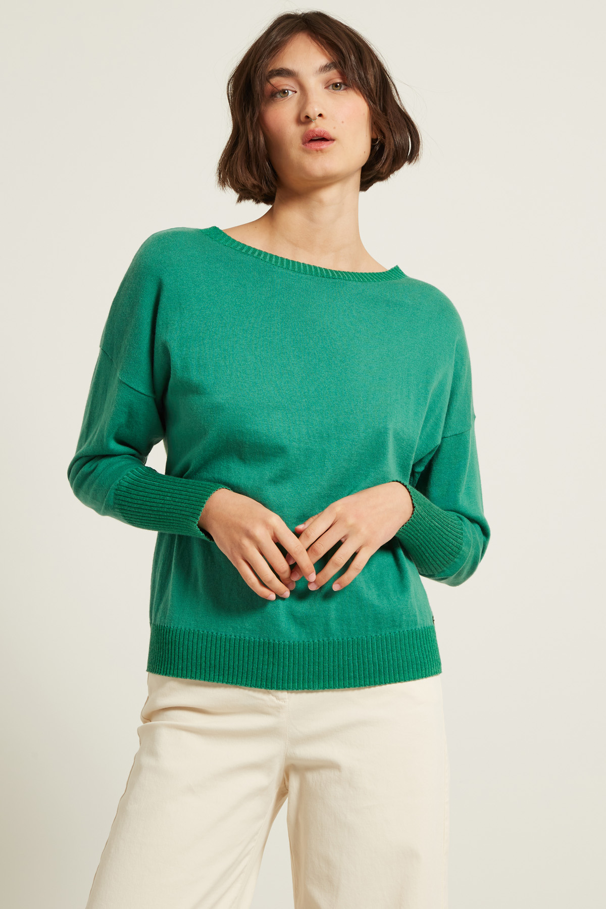 Maglia dalla linea morbida realizzata in filato di misto cashmere e cotone, con scollo rotondo, maniche lunghe dal giro sceso e profili rifiniti a coste.