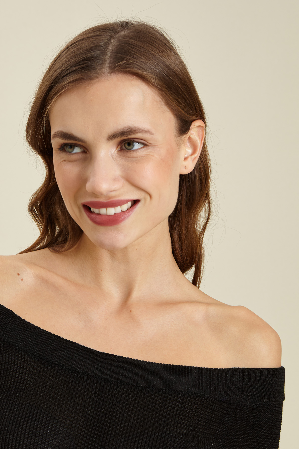Maglia dalla linea semiaderente realizzata in filato di misto viscosa a coste, con scollo a barchetta e maniche lunghe raglan.