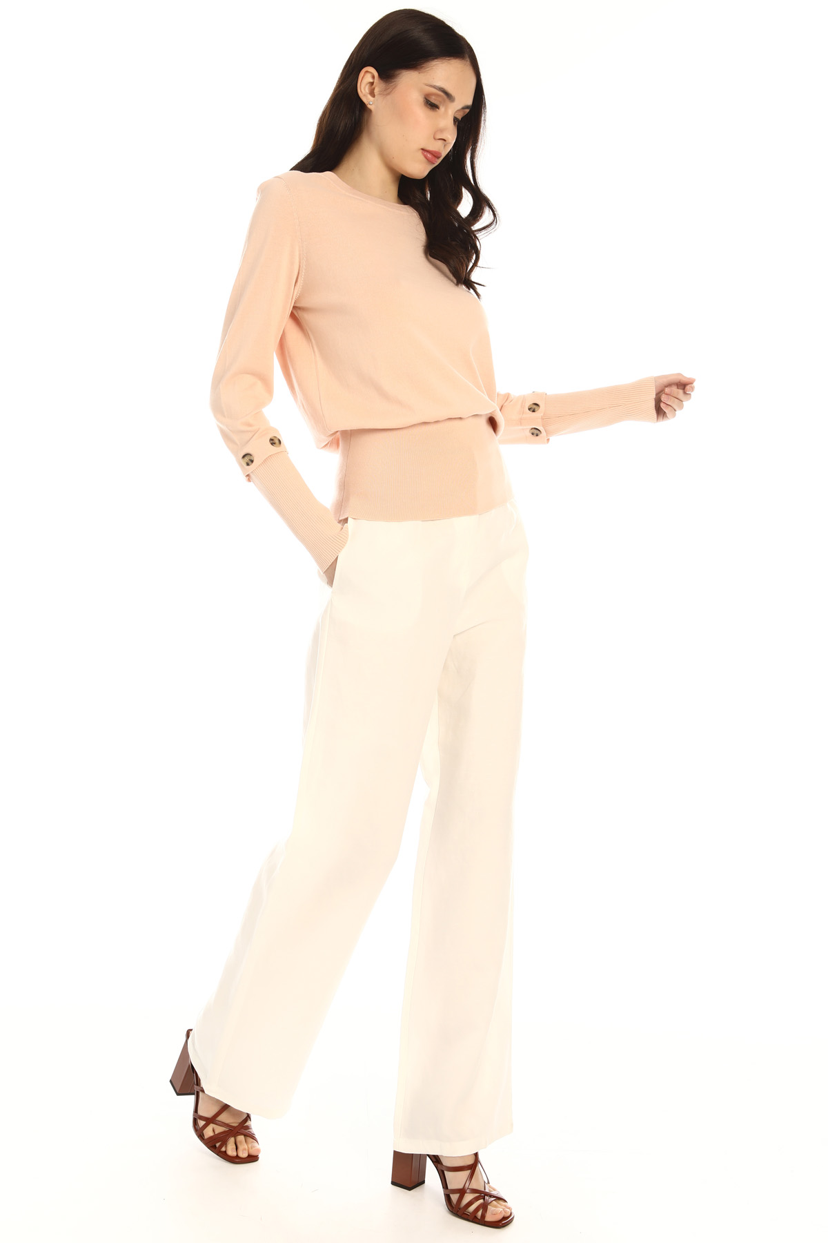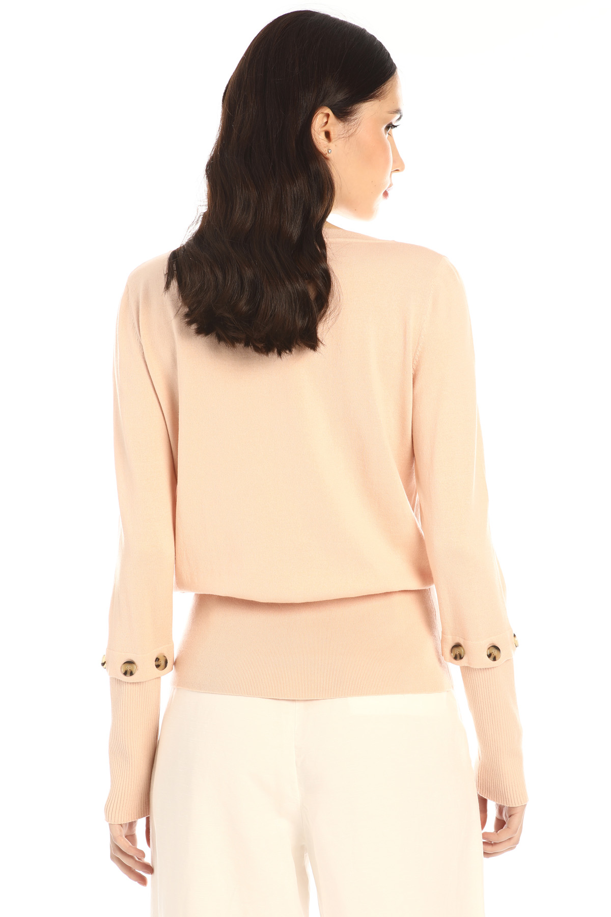 Maglia dalla linea stretta al fondo realizzata in filato di cotone e seta, con scollo a giro, maniche lunghe con polsino removibile e maxi bordo al fondo. Bordi rifiniti a coste.