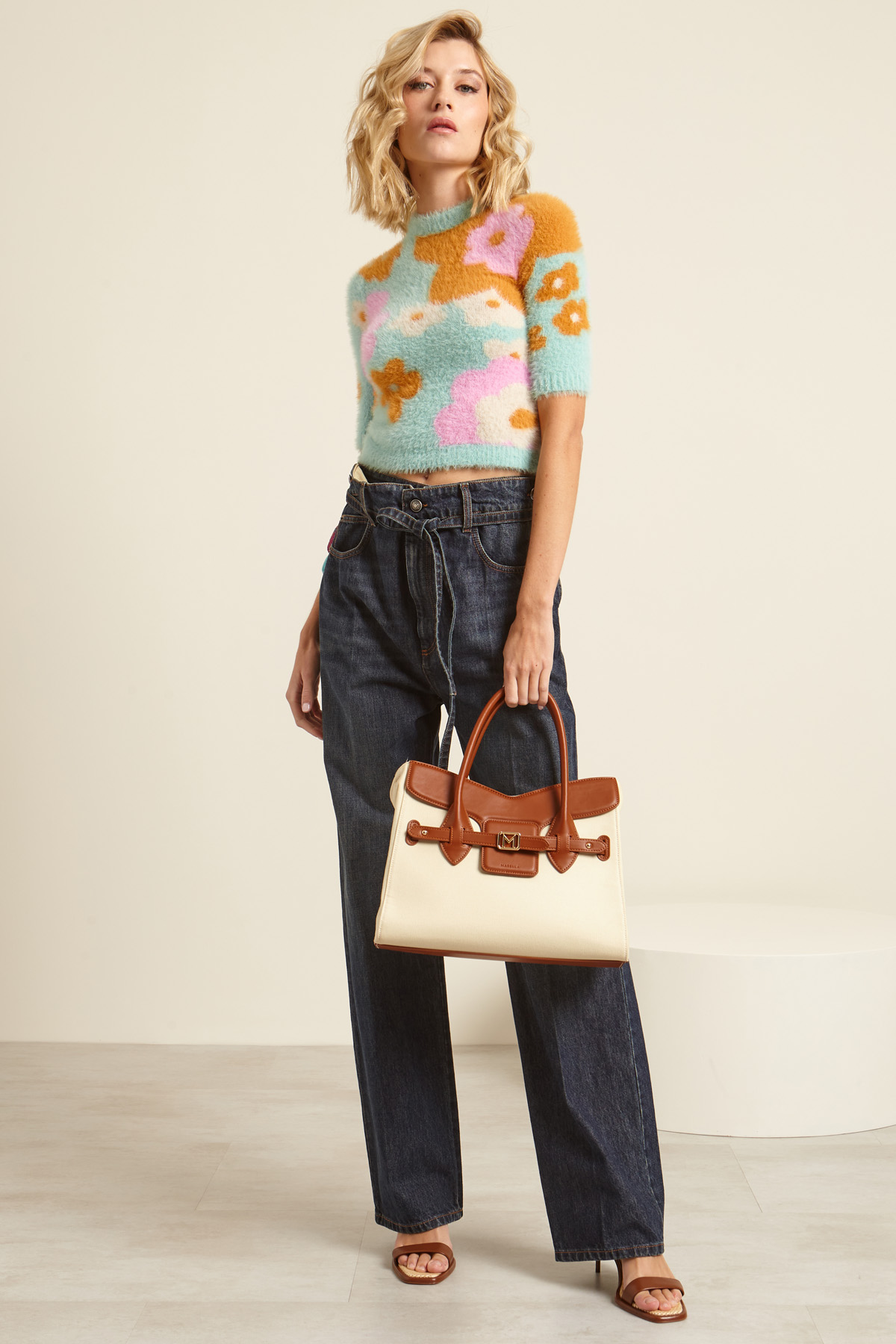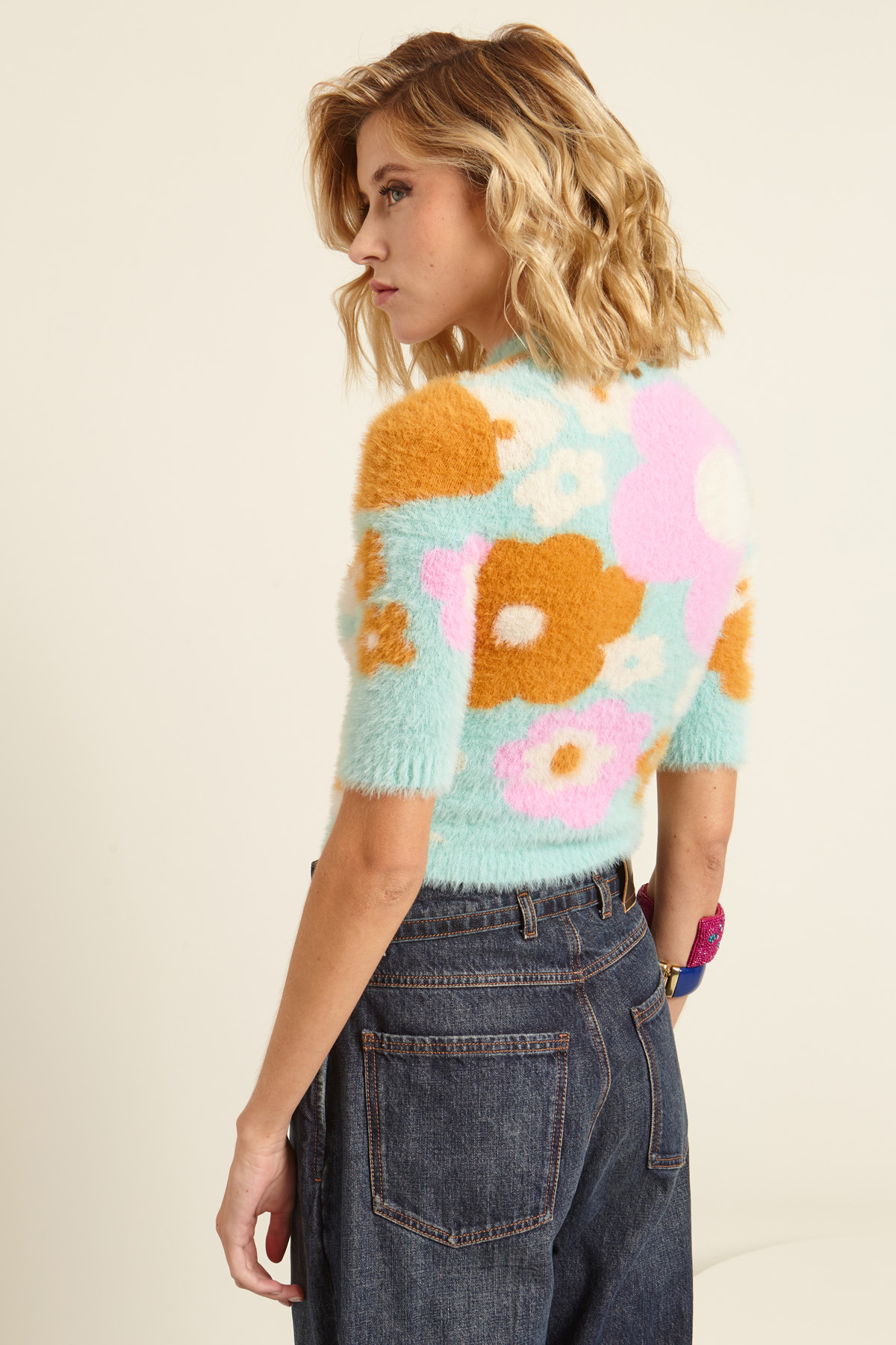 Maglia corta dalla linea aderente realizzata in filato garzato tinto filo, con scollo a giro, maniche tre quarti e profili rifiniti a coste.