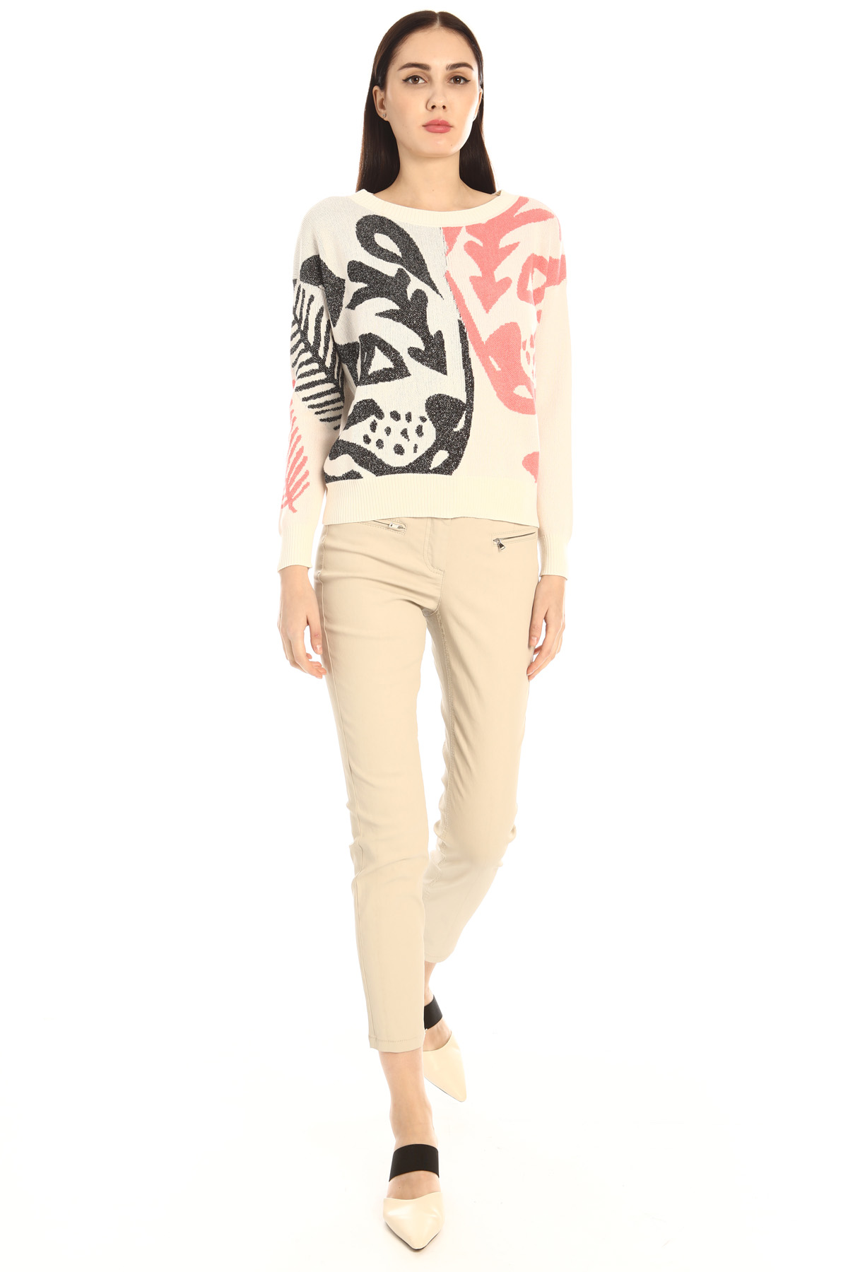 Maglia dalla linea morbida realizzata in filato di misto cotone e viscosa, con lavorazione jacquard, scollo a giro, maniche lunghe dal giro sceso e bordi rifiniti a coste.
