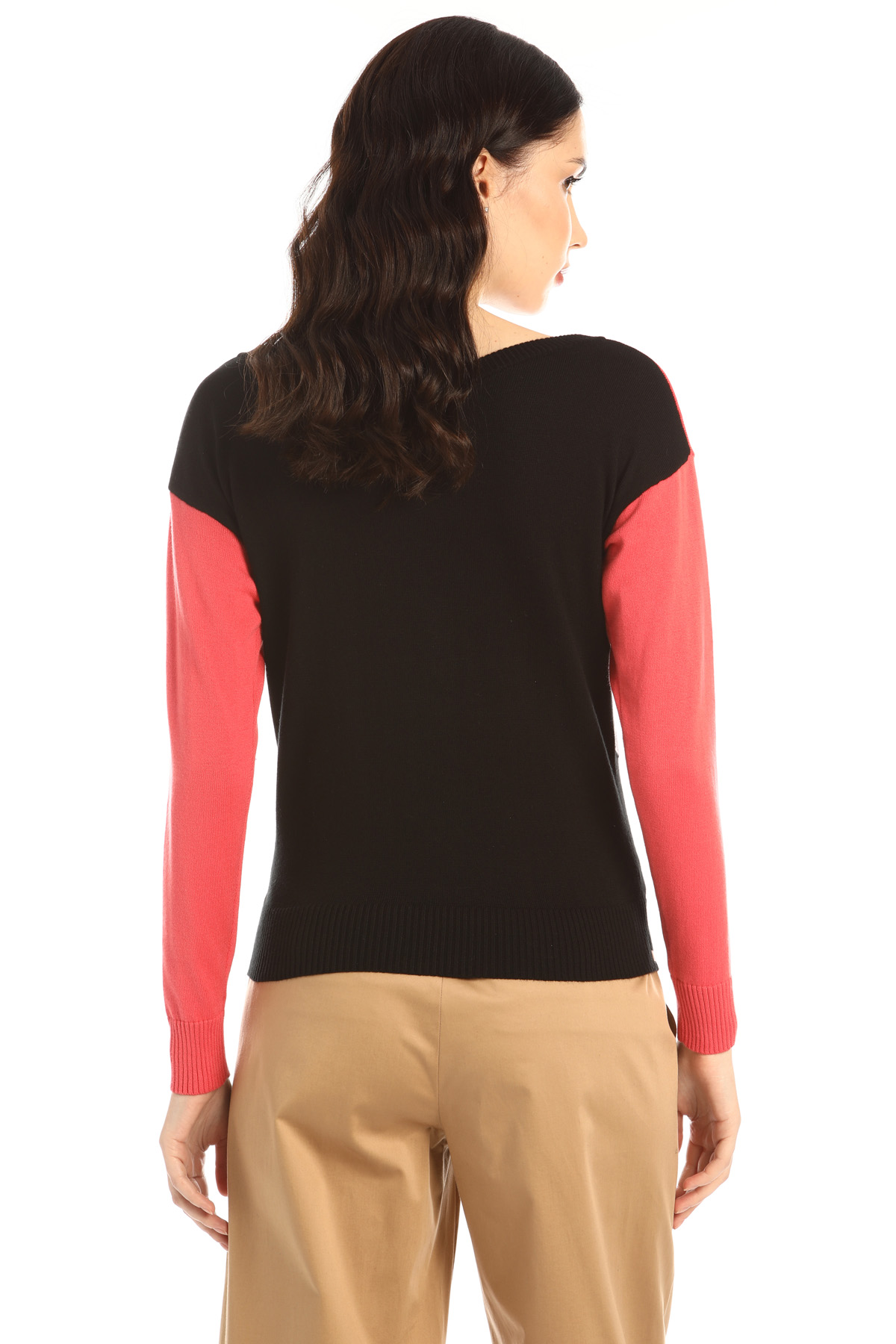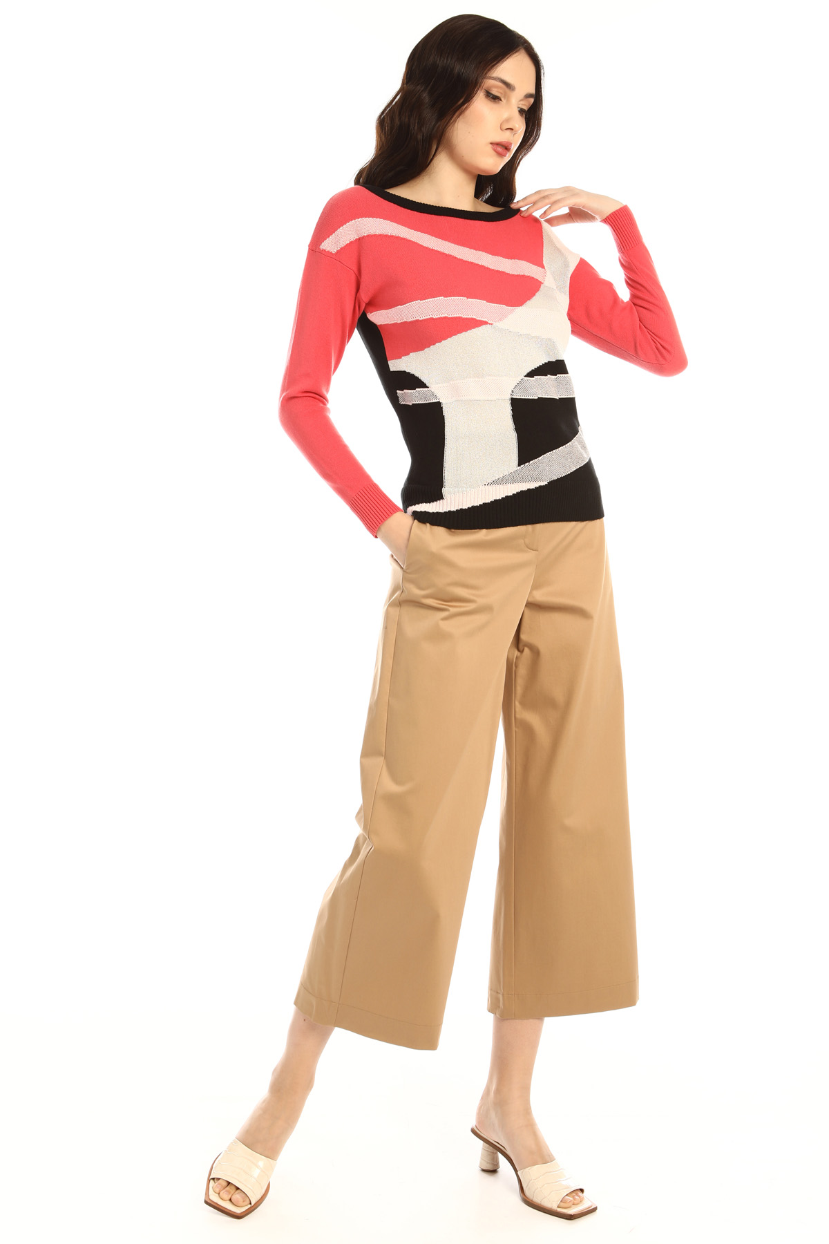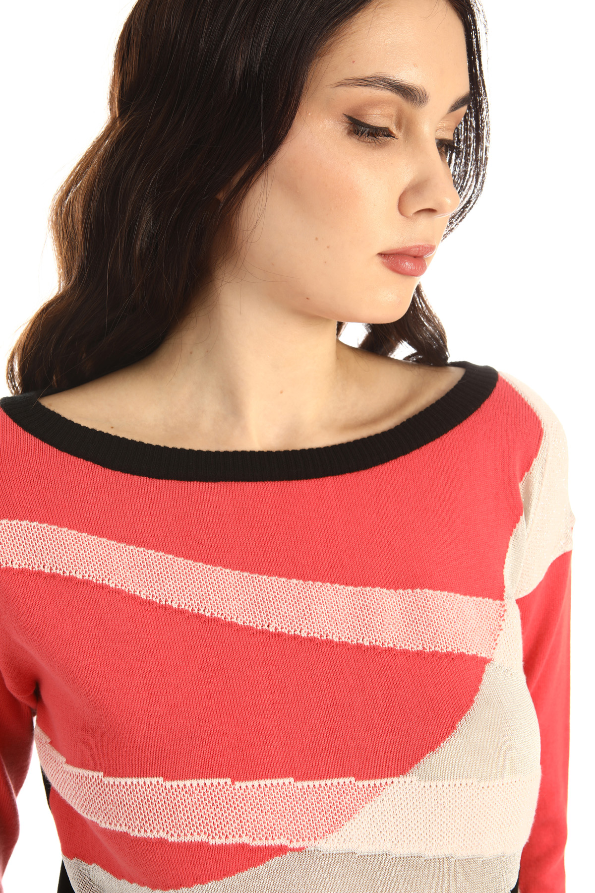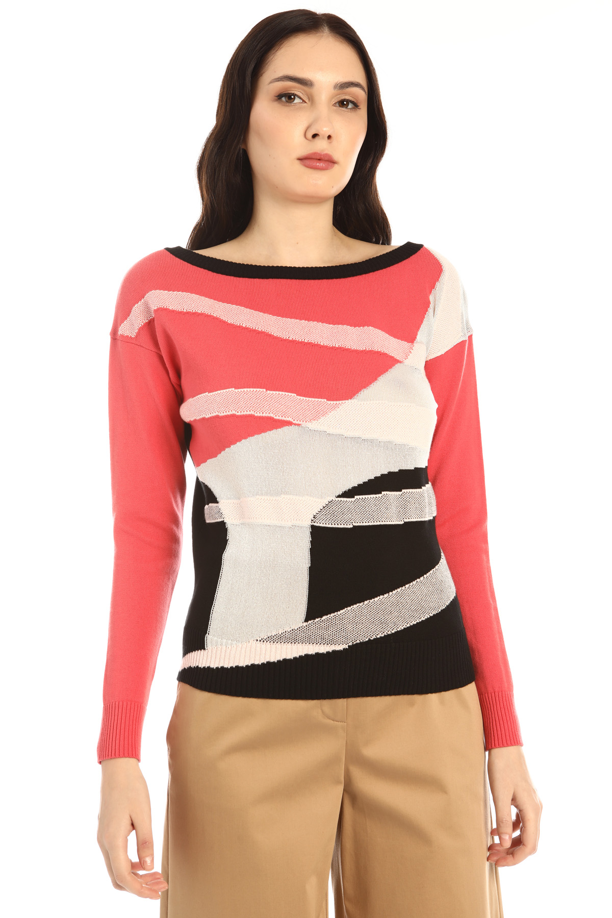 Maglia dalla linea stretta al fondo realizzata in filato di misto cotone e viscosa stretch, con lavorazione jacquard e inserto di fibra lamè. Scollo a barchetta, maniche lunghe e bordi lavorati a coste.