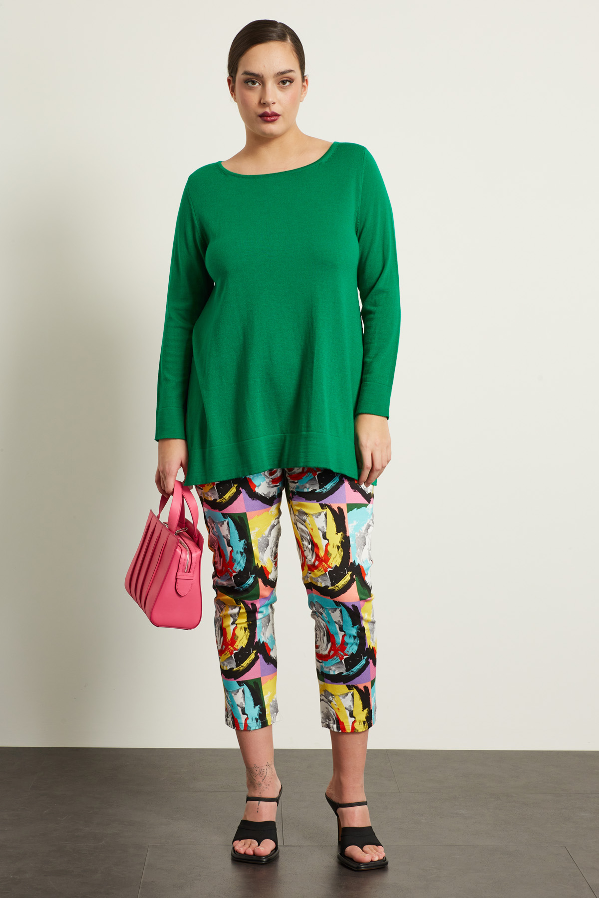 Maglia dalla linea dritta realizzata in filato di pura lana, con scollo a giro, maniche lunghe e spacchi laterali al fondo.