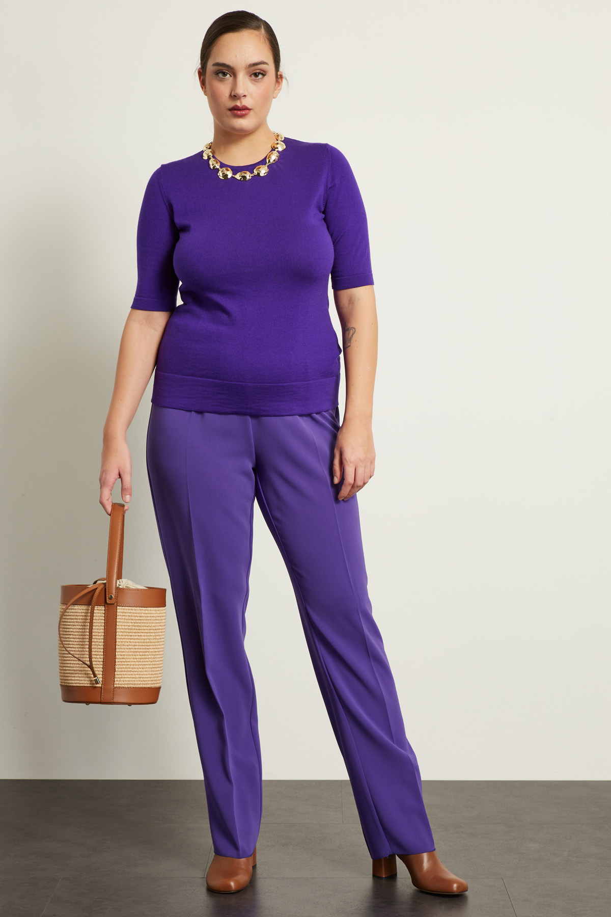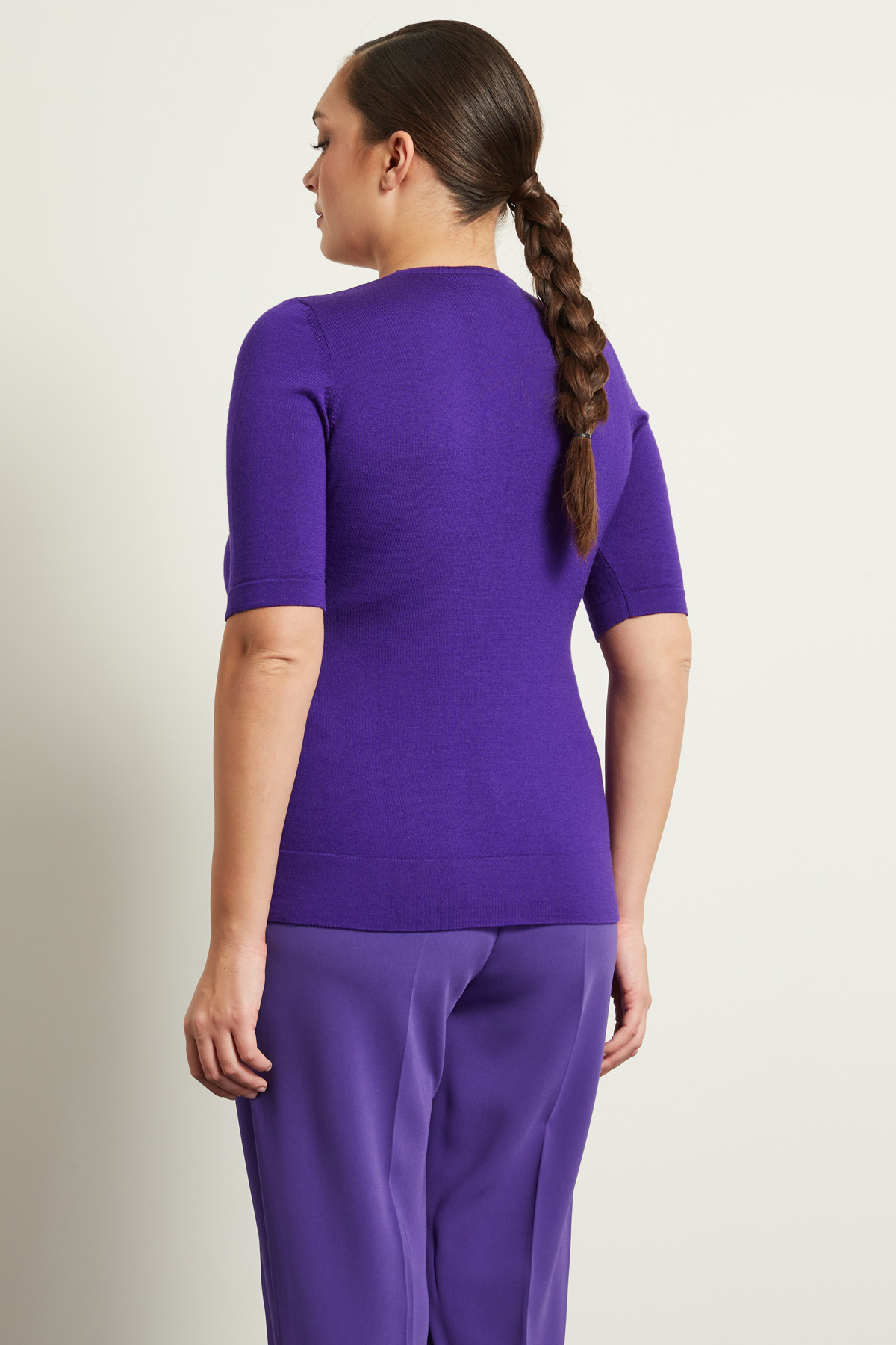 Maglia dalla linea dritta realizzata in filato di pura lana, con scollo a giro e maniche tre quarti.