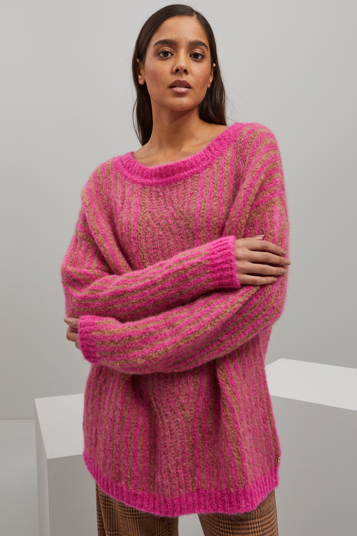 Maglia dalla linea morbida realizzata in filato di misto alpaca e mohair tinto filo, con scollo rotondo, maniche lunghe dal giro sceso e profili rifiniti a coste.