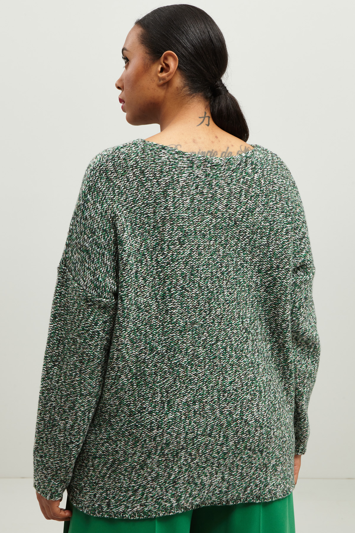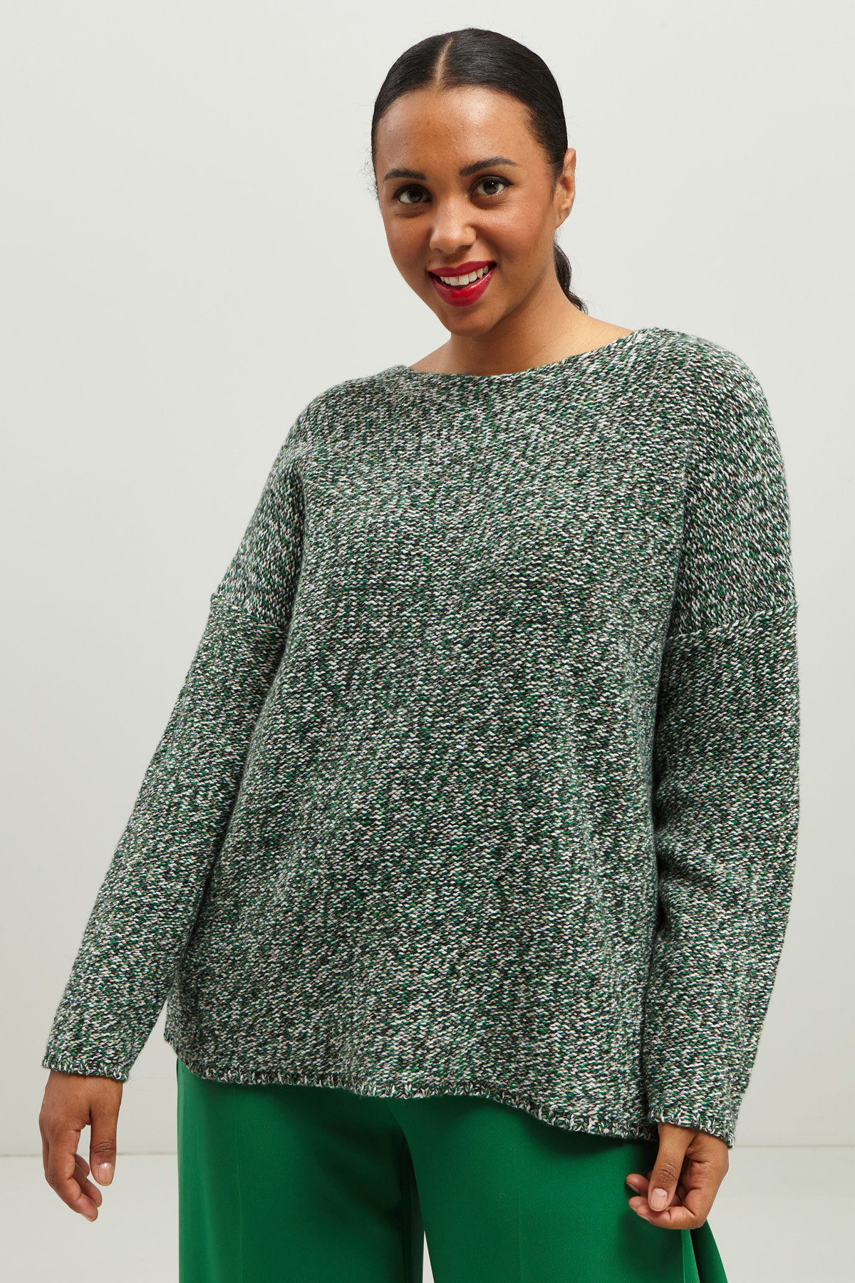 Maglia dalla linea dritta realizzata in filato di misto viscosa, lana e cashmere tinto filo, con scollo rotondo e maniche lunghe dal giro sceso.