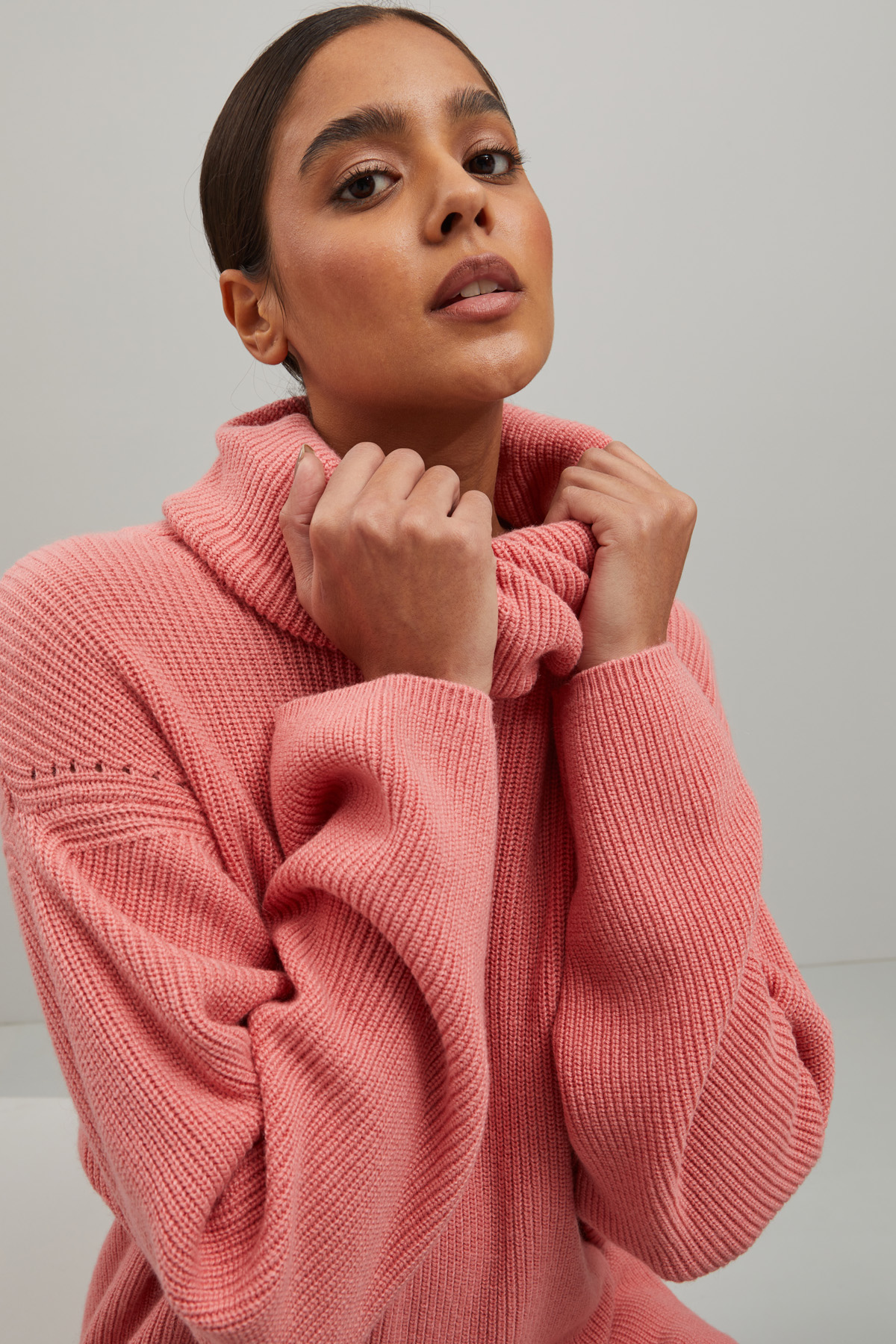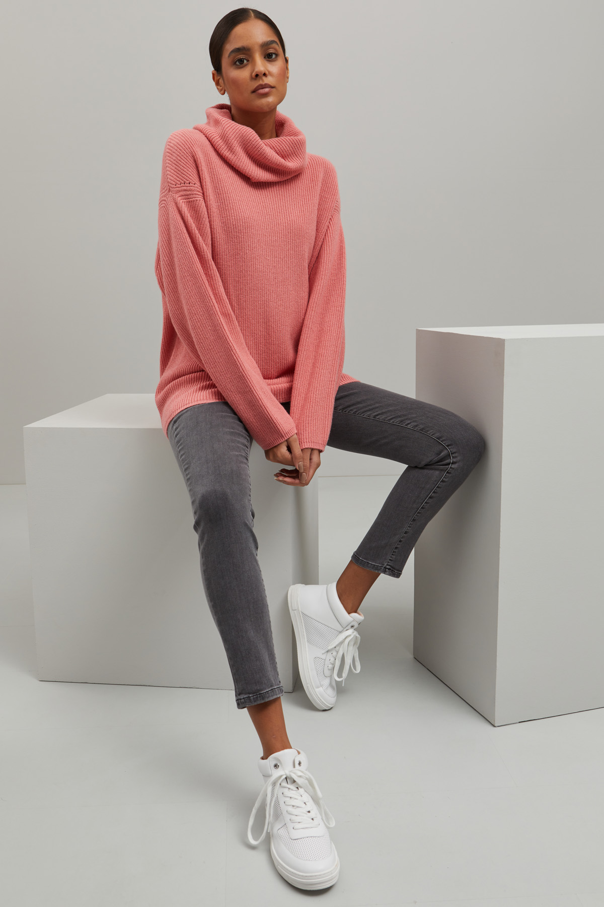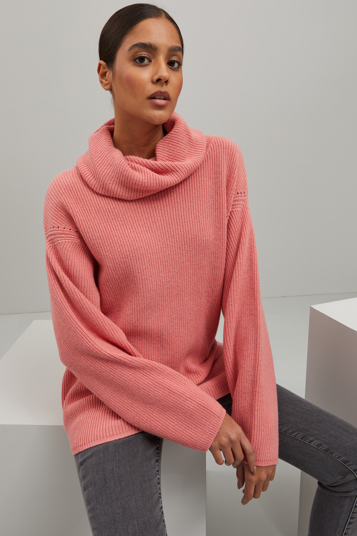 Maglia dalla linea morbida realizzata in filato di misto viscosa, cotone, lana e cashmere con lavorazione a coste, collo alto a cratere e maniche lunghe dal giro sceso.