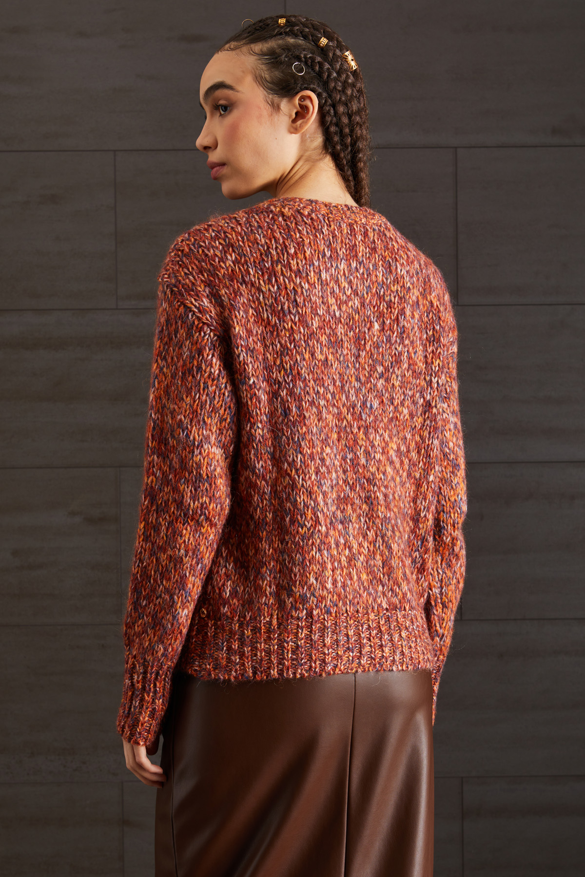 Maglia dalla linea dritta realizzata in filato di misto mohair tinto filo con collo a rotondo, maniche lunghe e bordi rifiniti a costine.