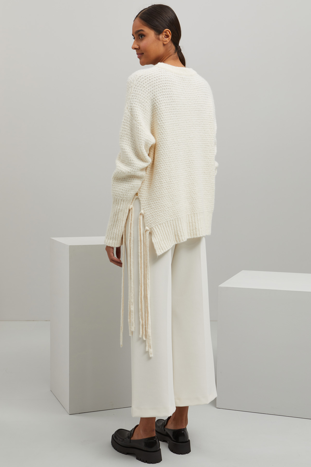 Maglia dalla linea dritta realizzata in filato di misto cotone, alpaca e lana con lavorazione a nido d'ape, scollo rotondo, maniche lunghe dal giro sceso, spacchi al fondo con dettagli di frange e profili rifiniti a coste.