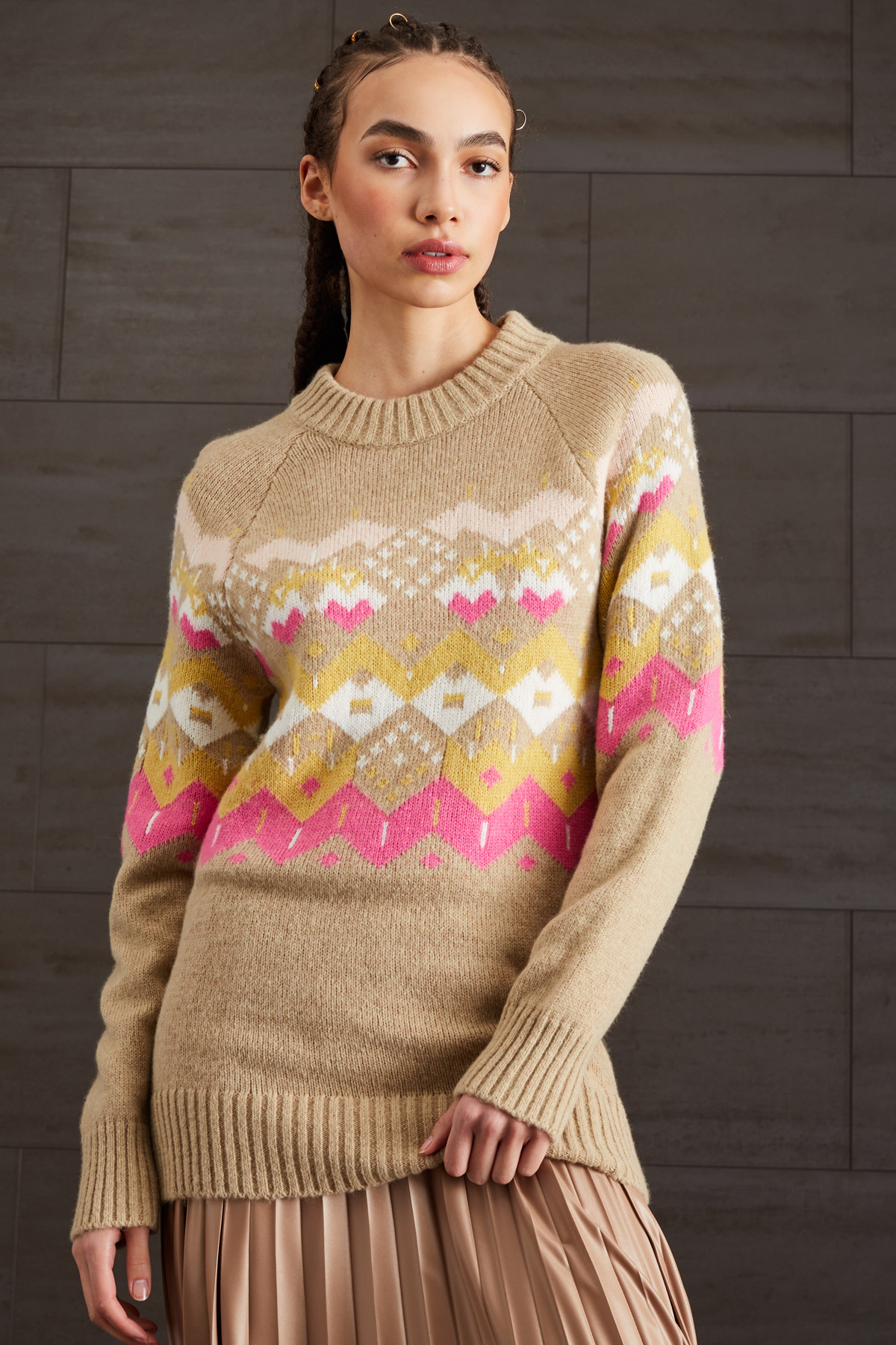 Maglia dalla linea morbida realizzata in filato di misto lana tinto filo, con scollo a giro, maniche lunghe raglan e profili rifiniti a coste.