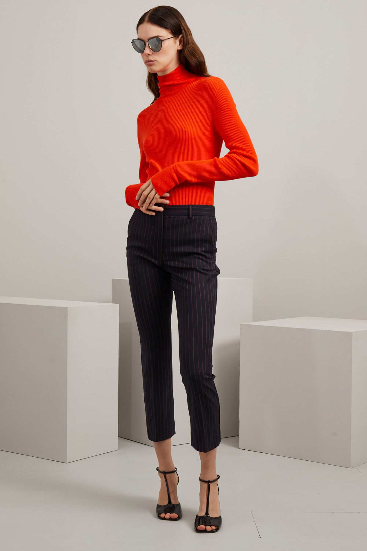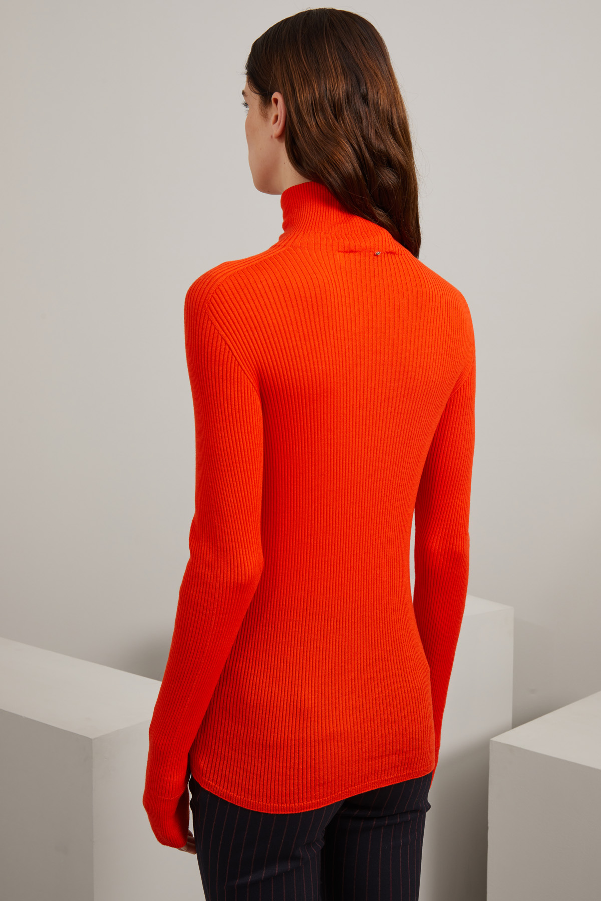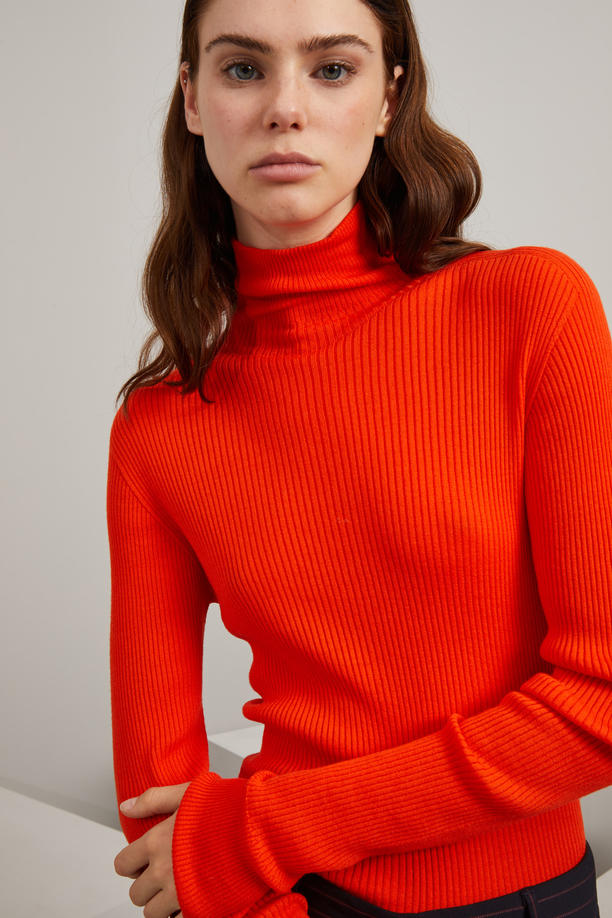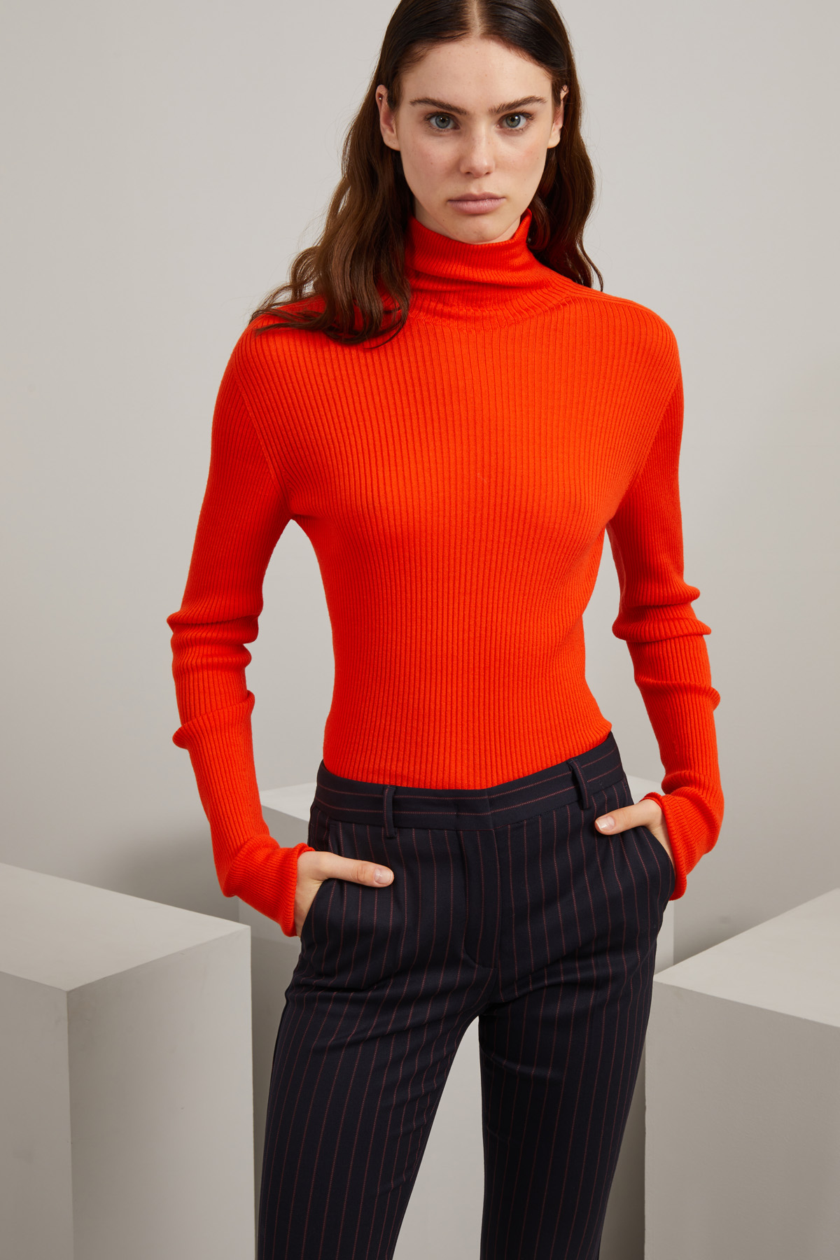 Dolcevita dalla linea aderente realizzato in filato di pura lana con lavorazione a coste, collo alto e maniche lunghe.