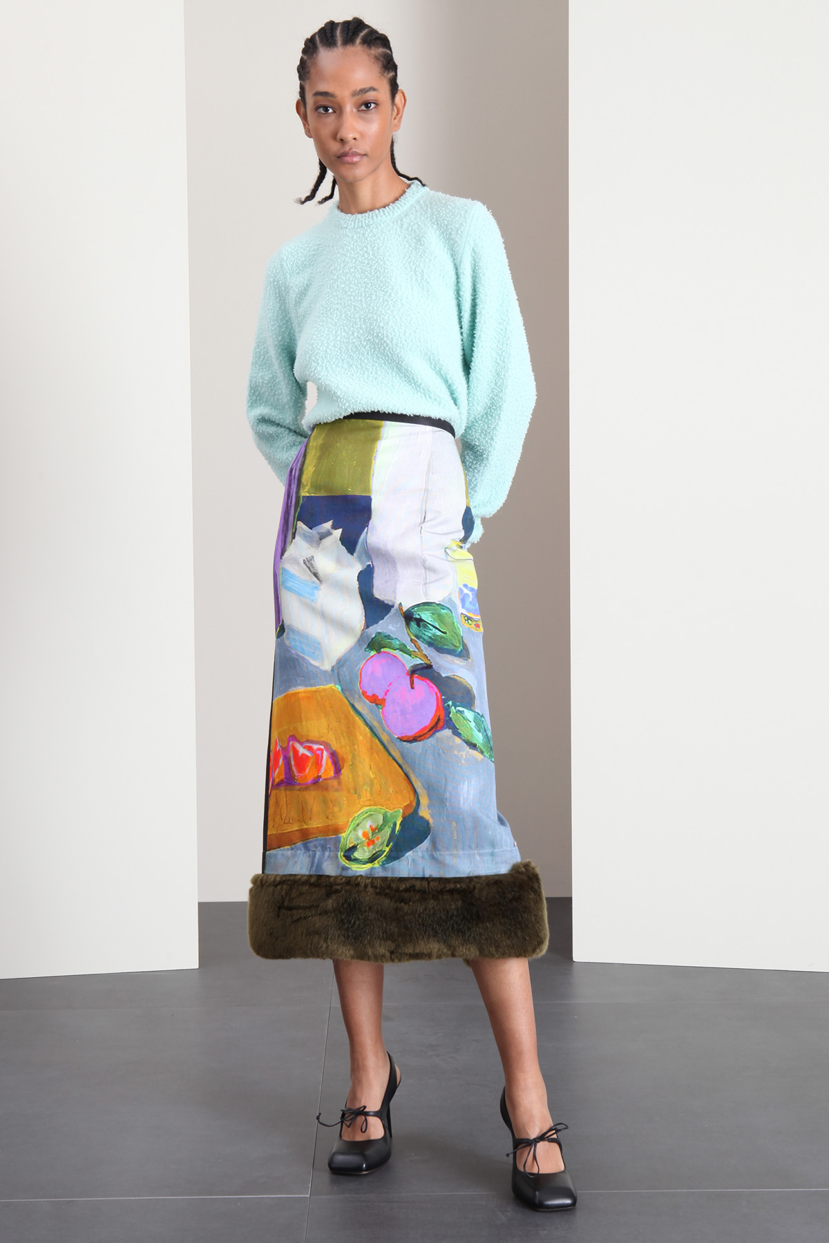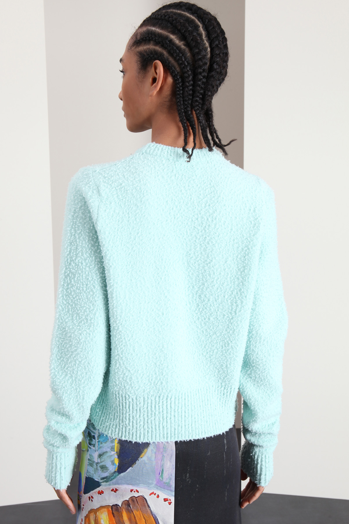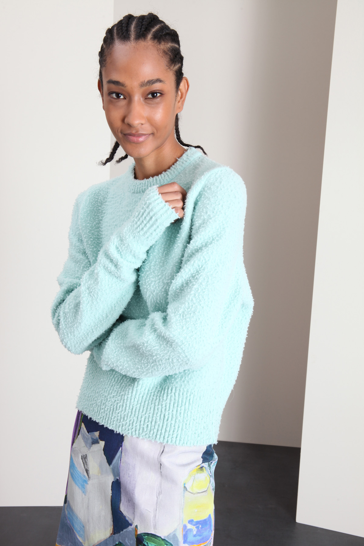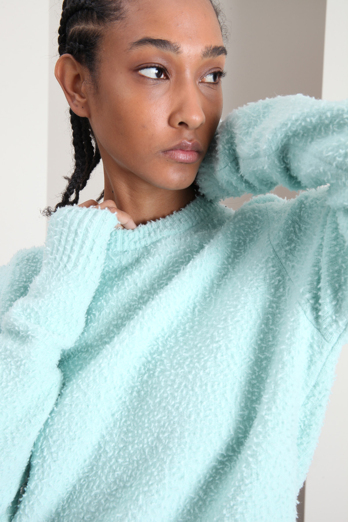 Maglia dalla linea stretta al fondo realizzata in filato di misto lana e angora stretch effetto bioccolato, con scollo a giro, maniche lunghe e profili riniti a coste.